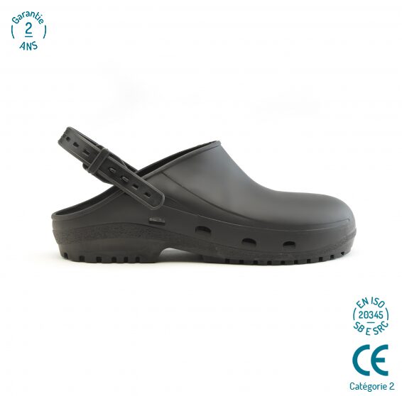 Skridhæmmende såler og denne sorte clog har tåværn.