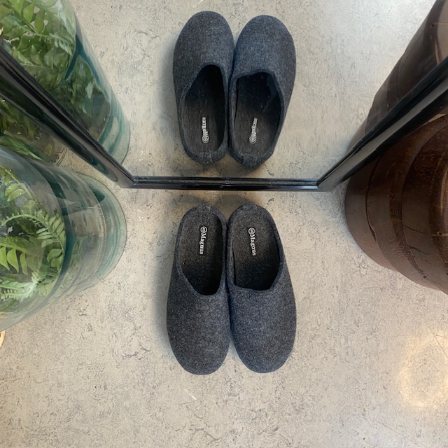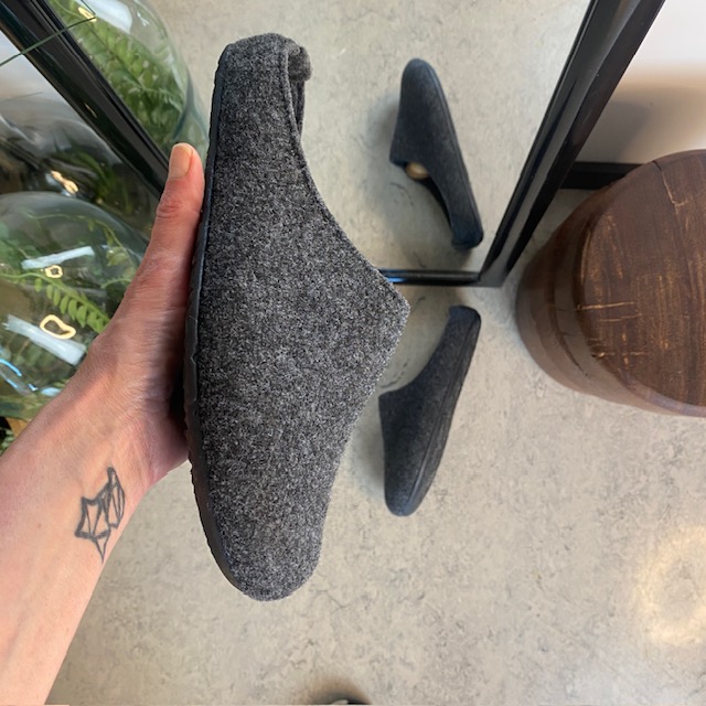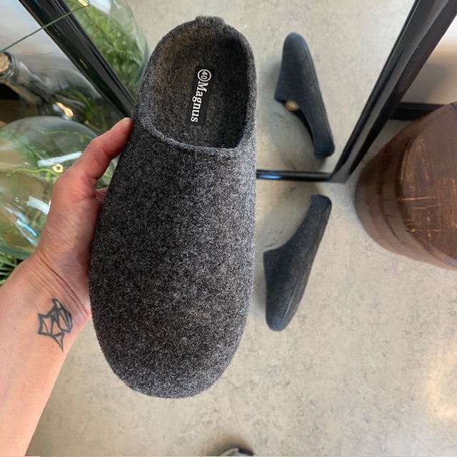 Mørkegrå filthjemmesko, som giver dig komfort og varme.