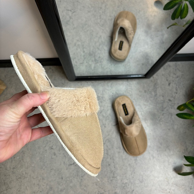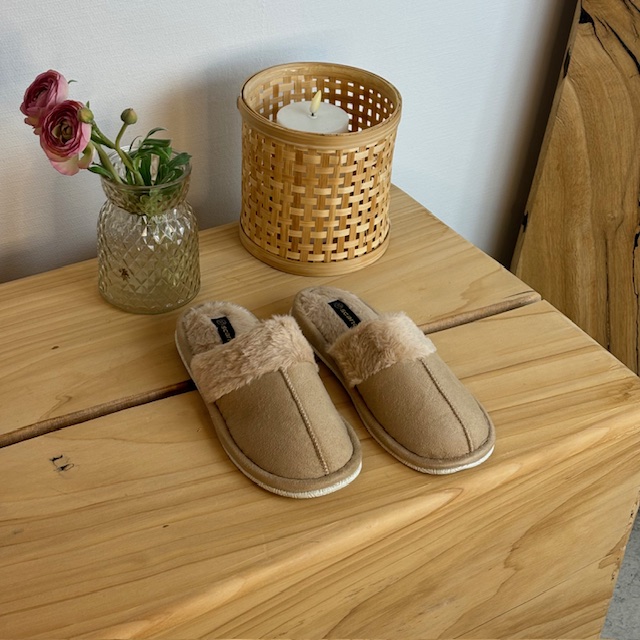 Beige hjemmesko med synlig pelskant