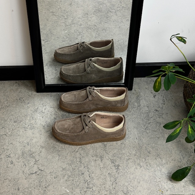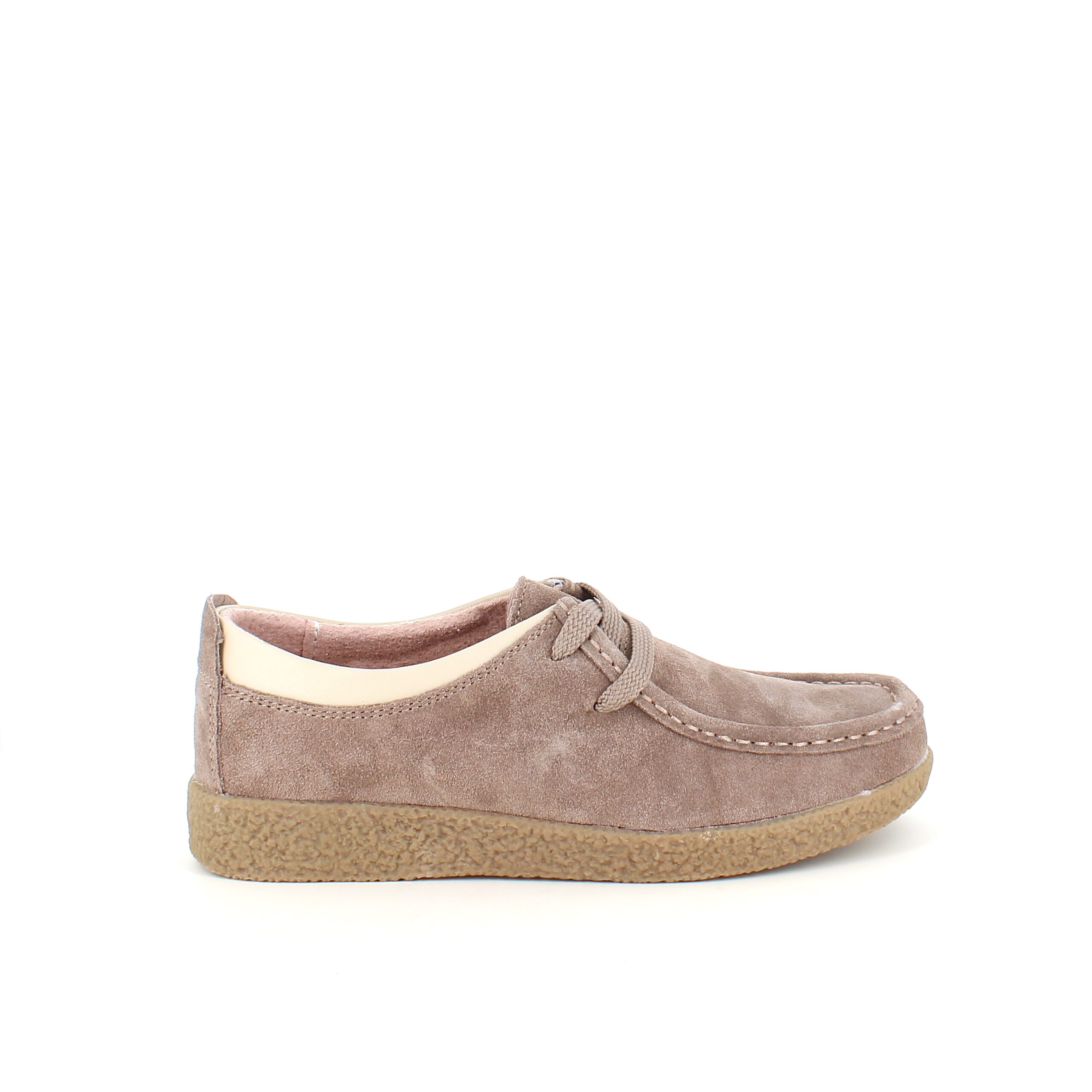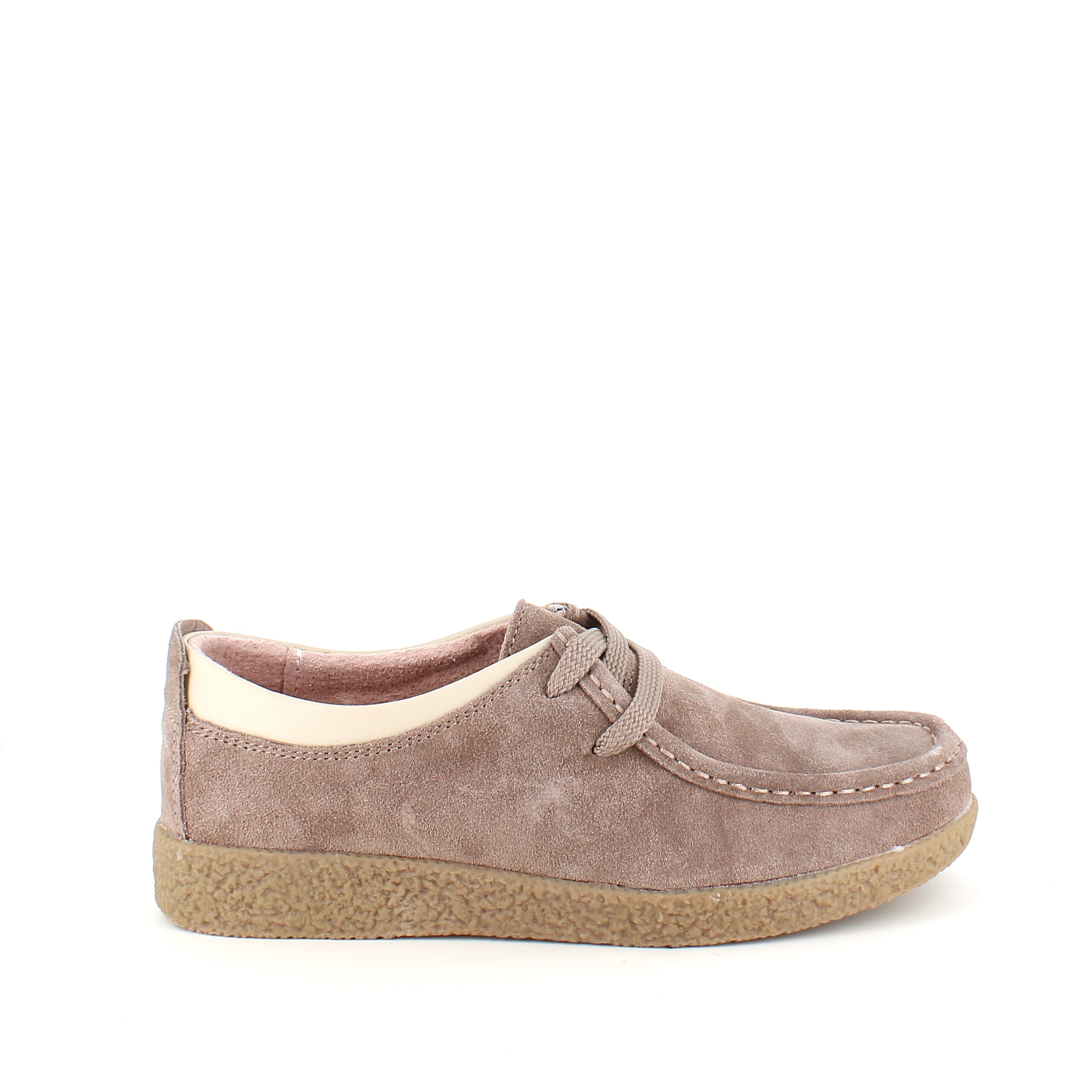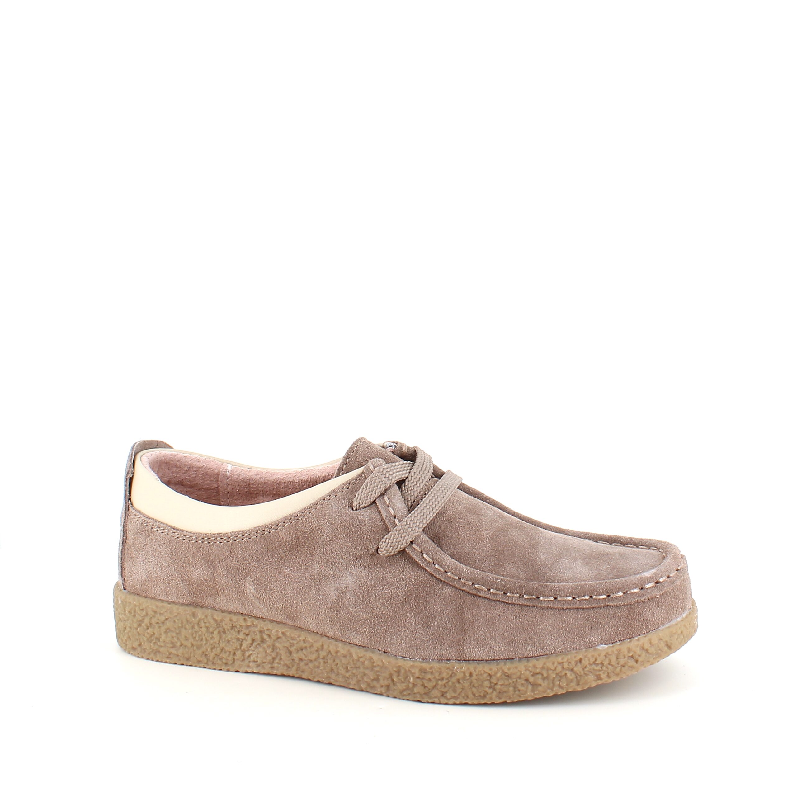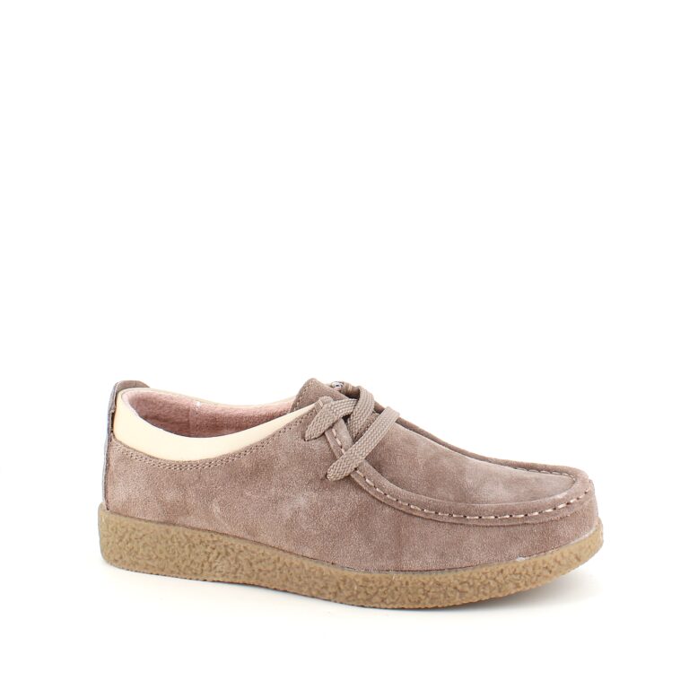 Beige ruskindsko med gummisål har en elegant design med en beige læderkant ved åbningen. Skoen har snørelukning og en tydelig syning i overdelen, som giver et stilfuldt udseende. Den indvendige skum sål er beklædt med læder for komfort, og modellen er almindelig med en bredde på 7.5 cm i størrelse 37. Ydersålen er lavet af rågummi, hvilket giver god stødabsorbering og fleksibilitet. Skoen fås i størrelserne 36-41 og i mange forskellige farver.