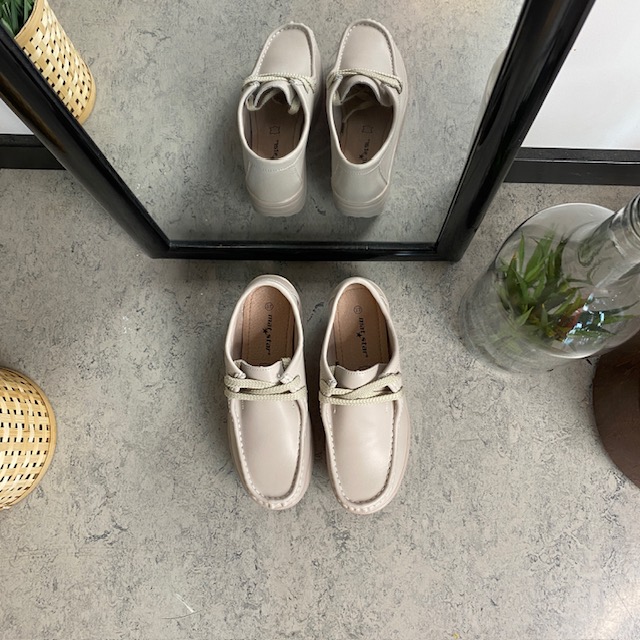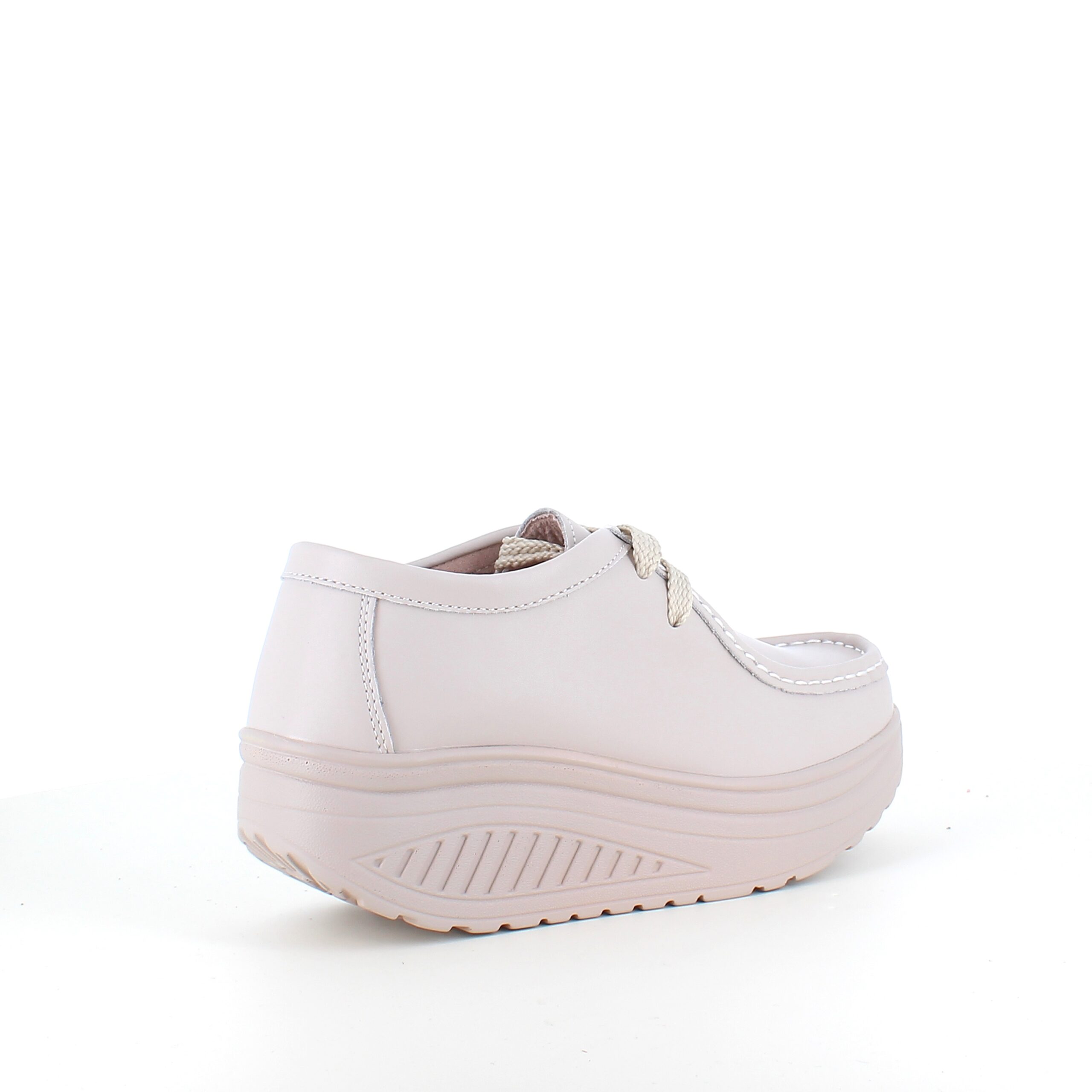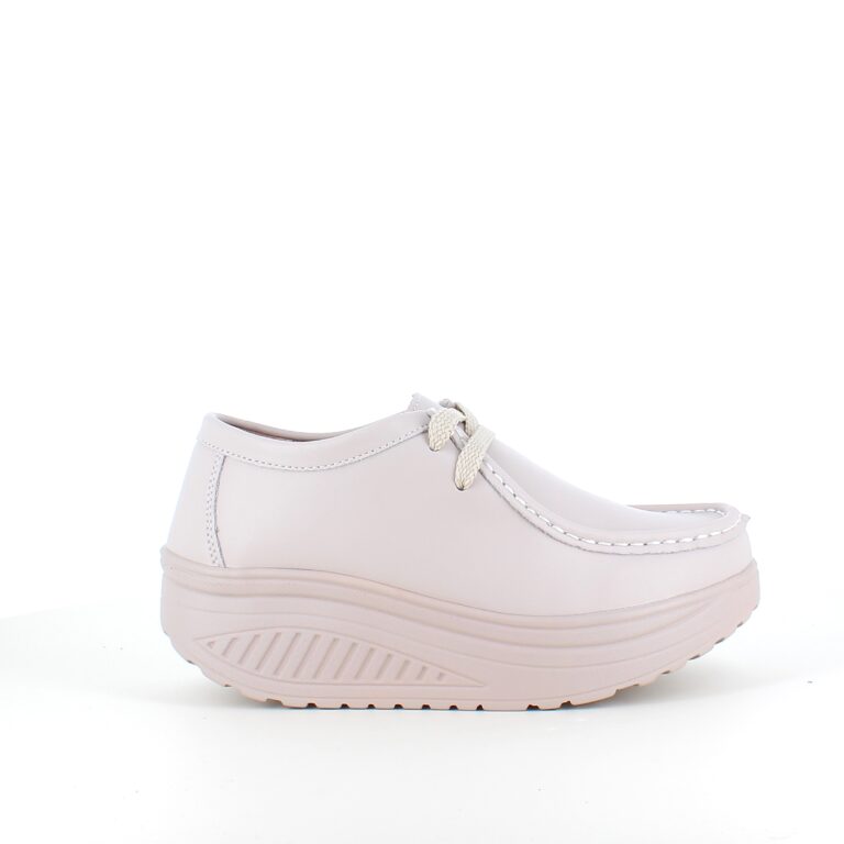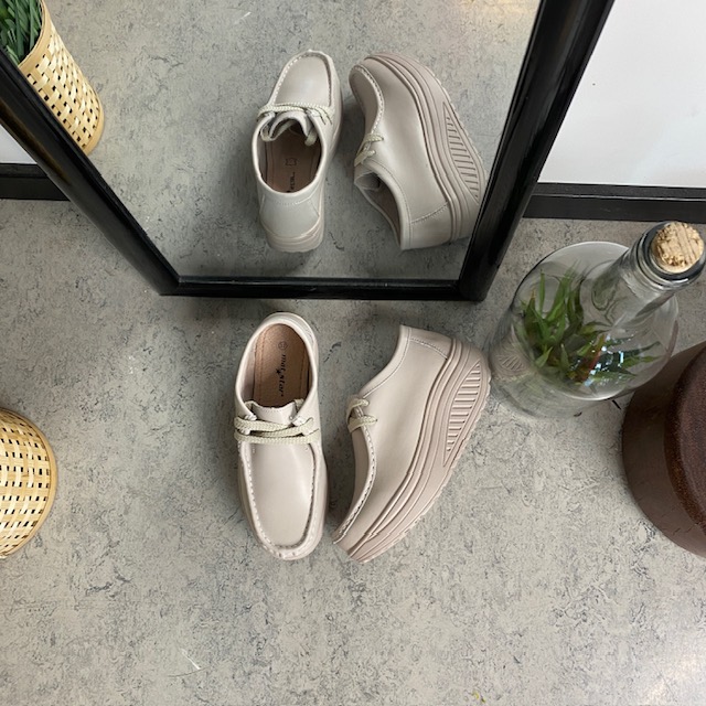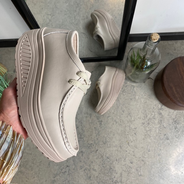 Beige skindsko med gængesål og svangstøtte kombinerer stil og komfort.