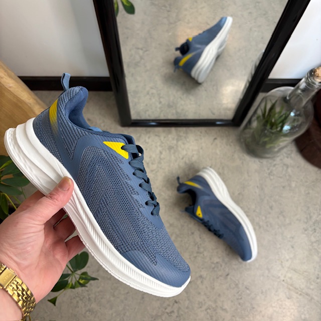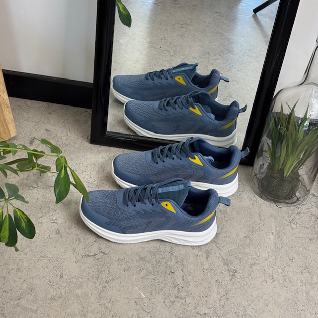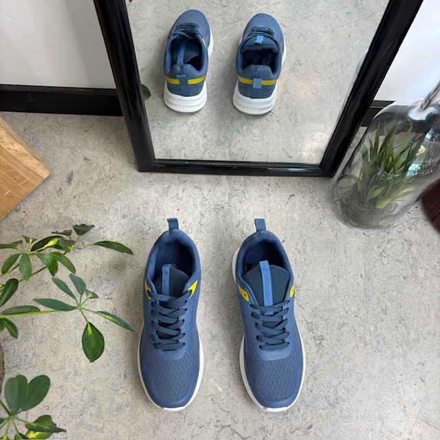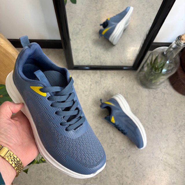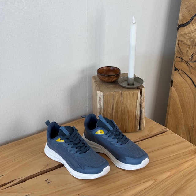 Denne blå sko kombinerer åndbarhed med komfort og praktisk brug.