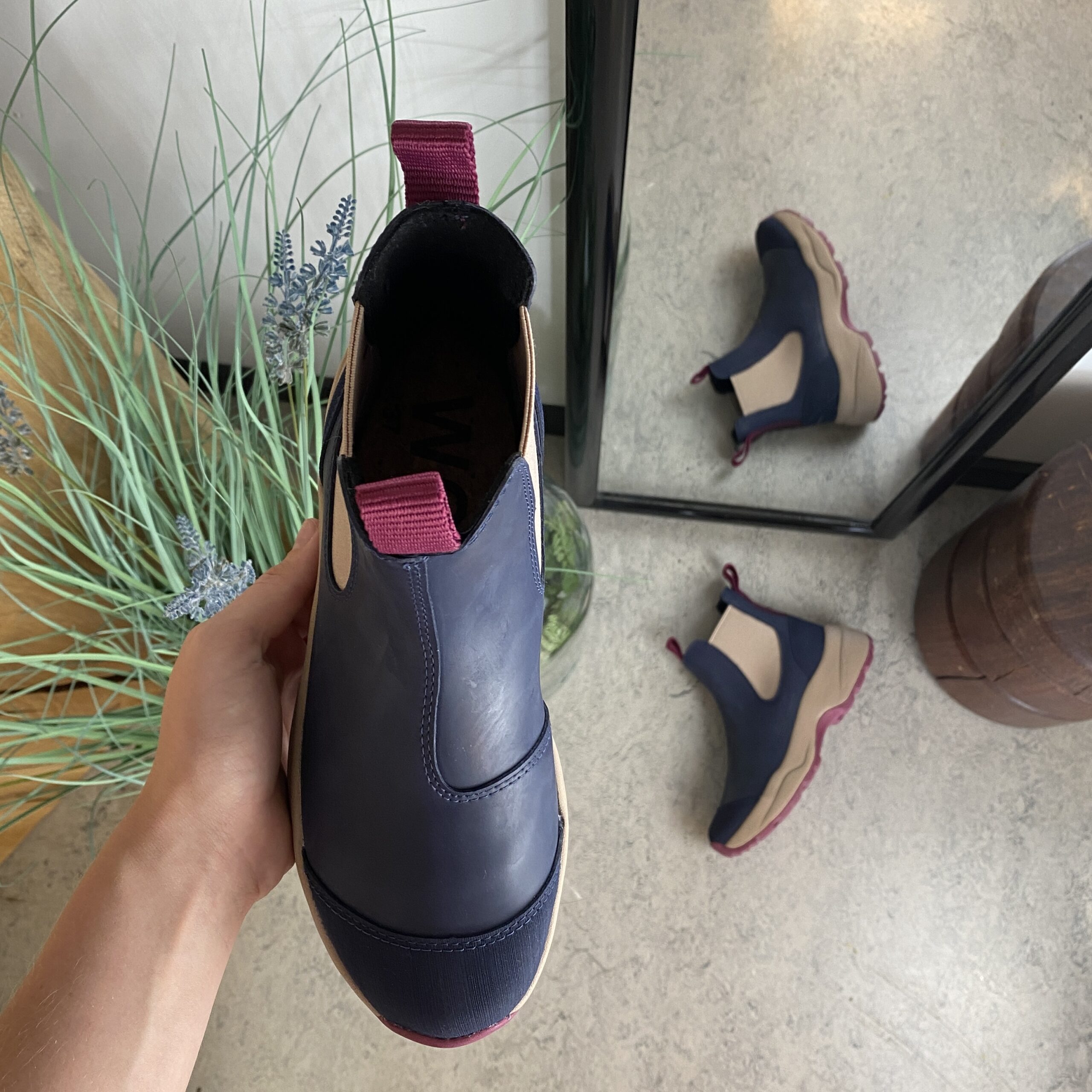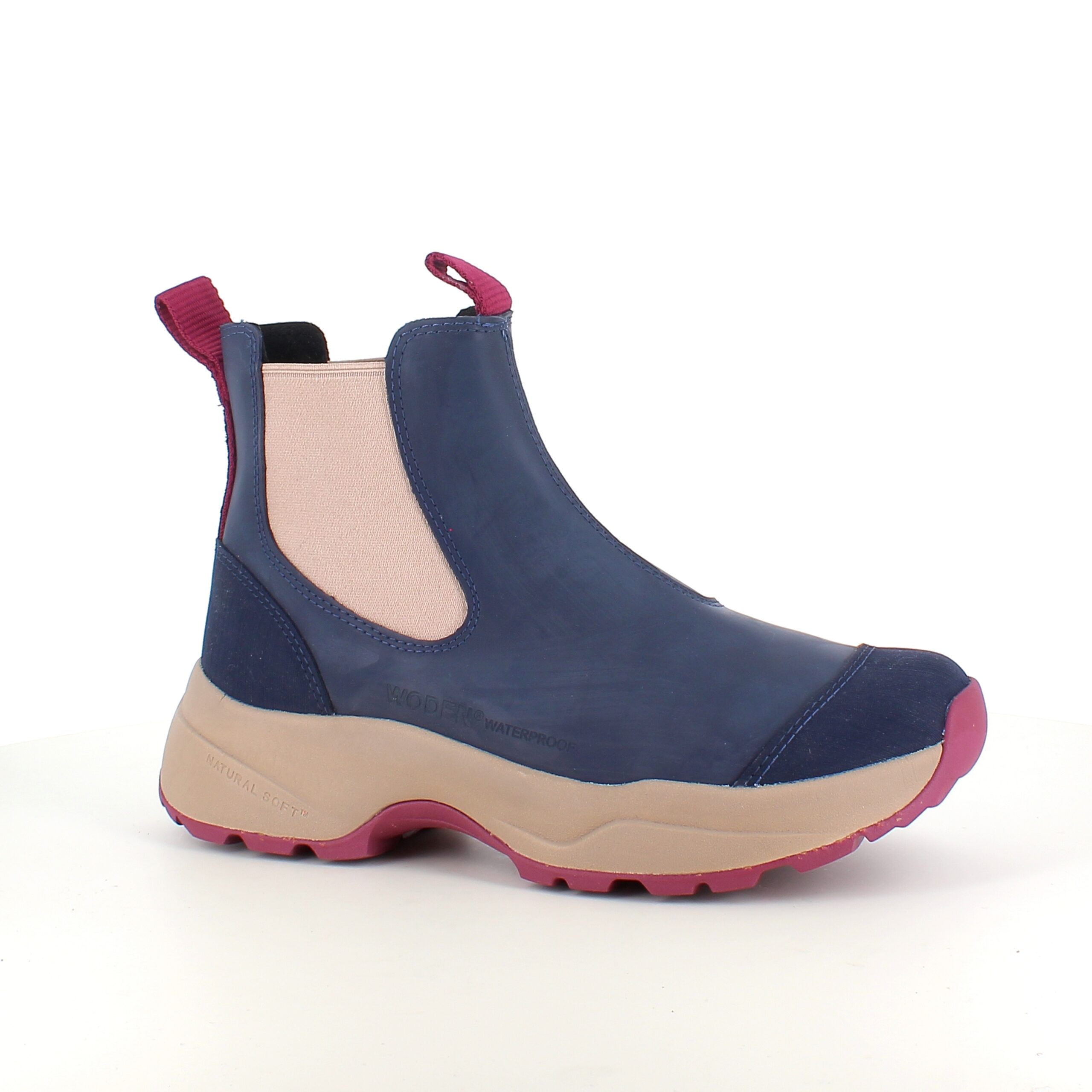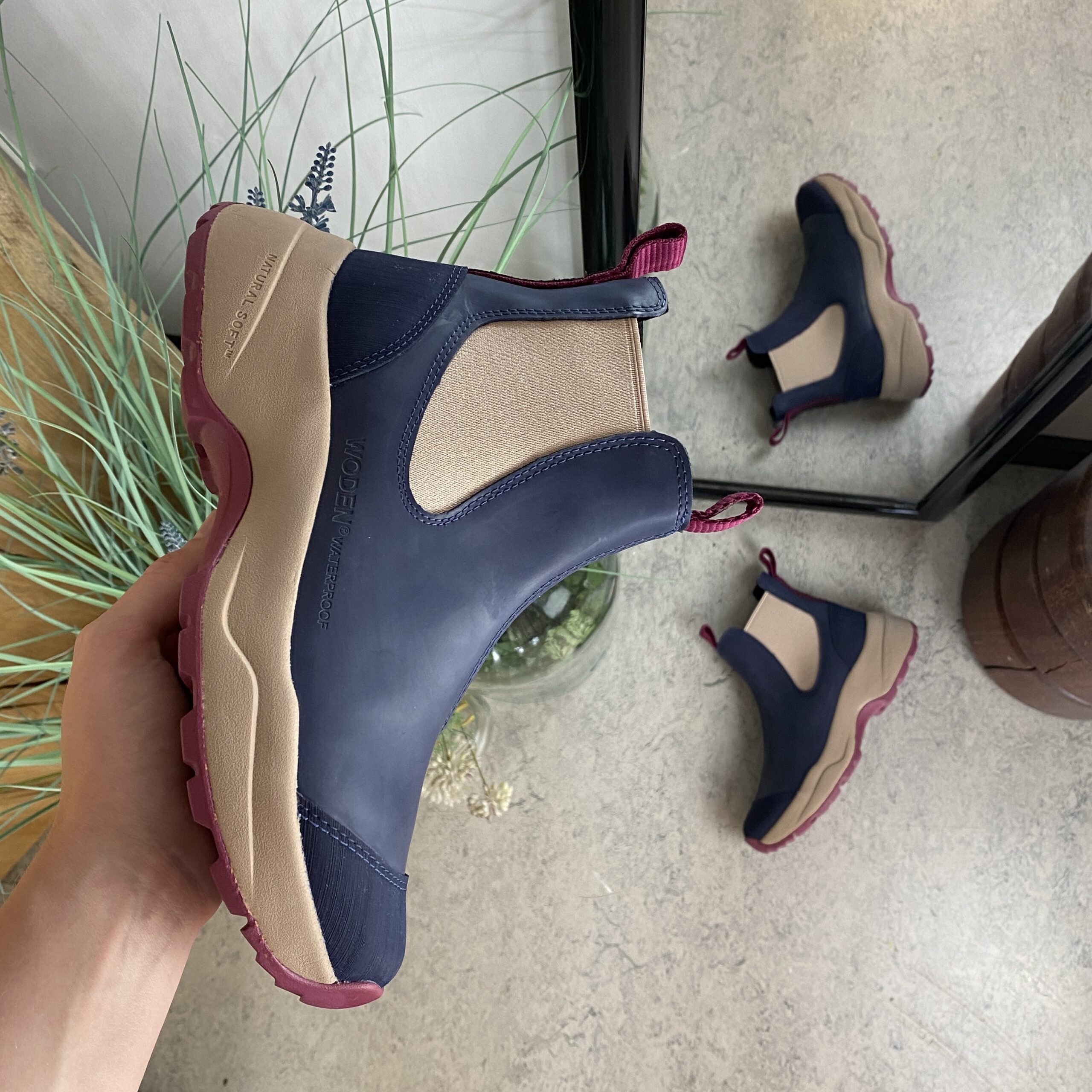 Woden gummistøvlen er en robust og vandtæt støvle. Den har et stilrent, skridsikkert design og er pyntet med fine detaljer i fiskelæder på hælen. Den karakteristiske sål er udviklet med fokus på komfort og fuldender støvlens funktionelle udtryk.