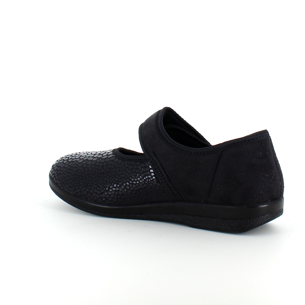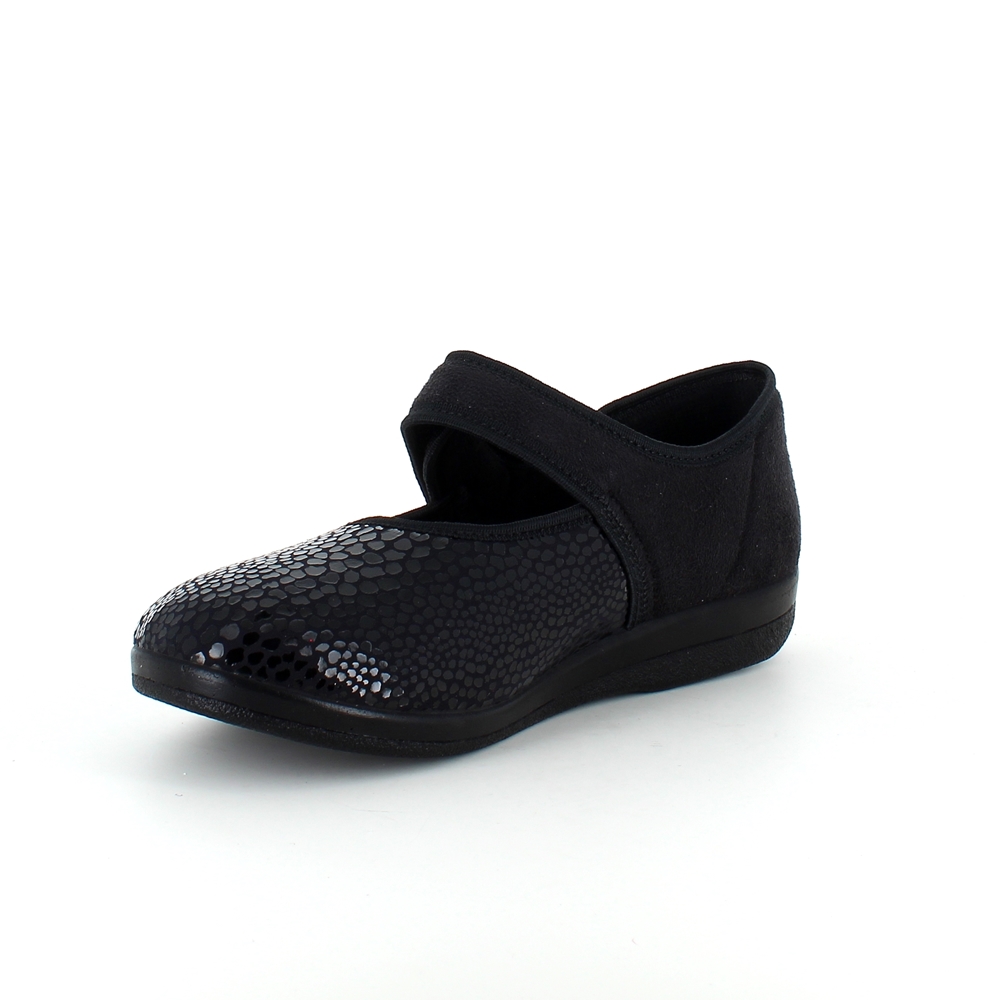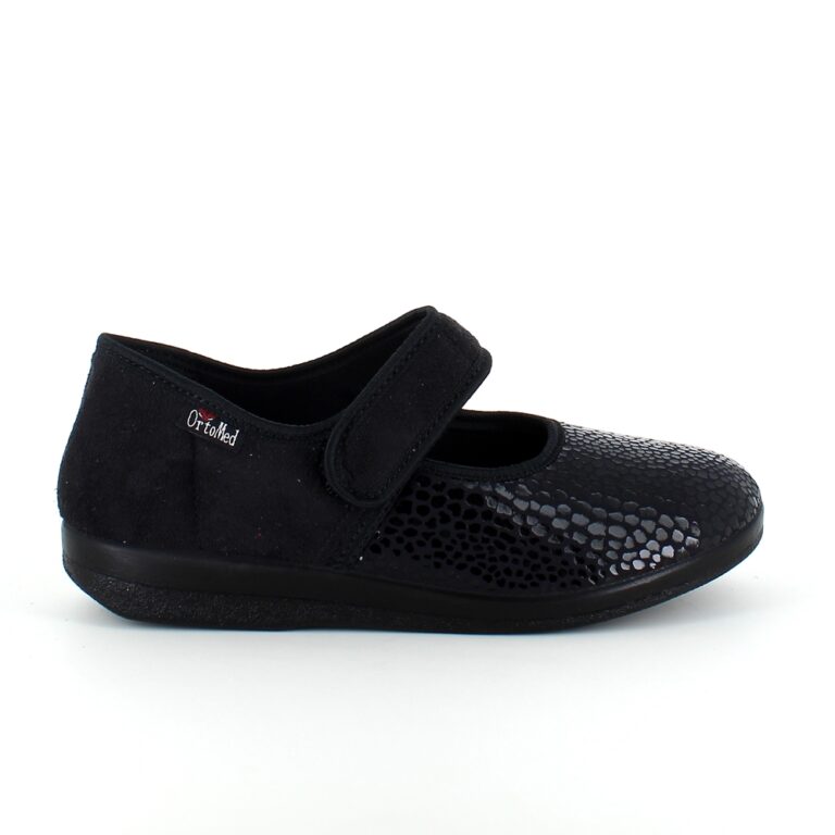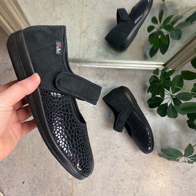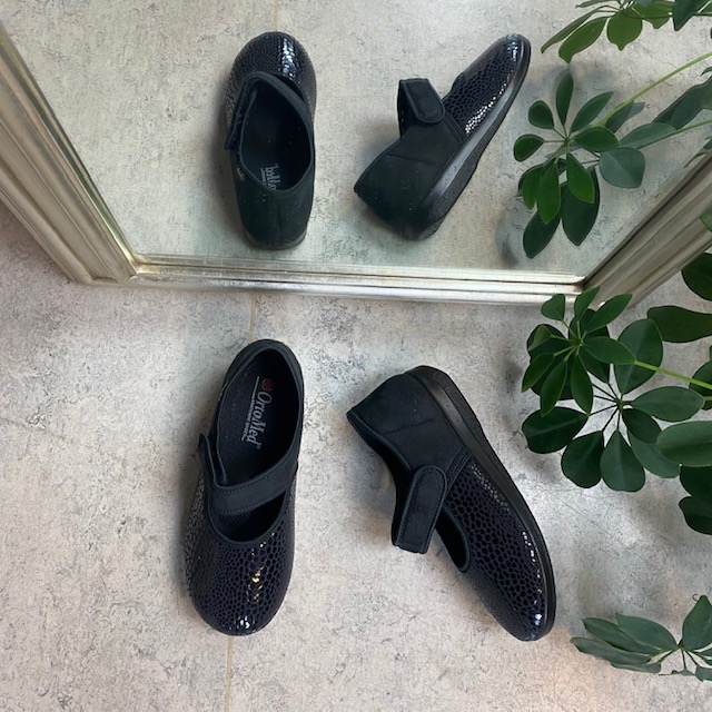 Bred ortopædisk sko i sort med velcro omkring ankel. Forfoden har glat elastisk stof som giver forfoden ekstra plads.