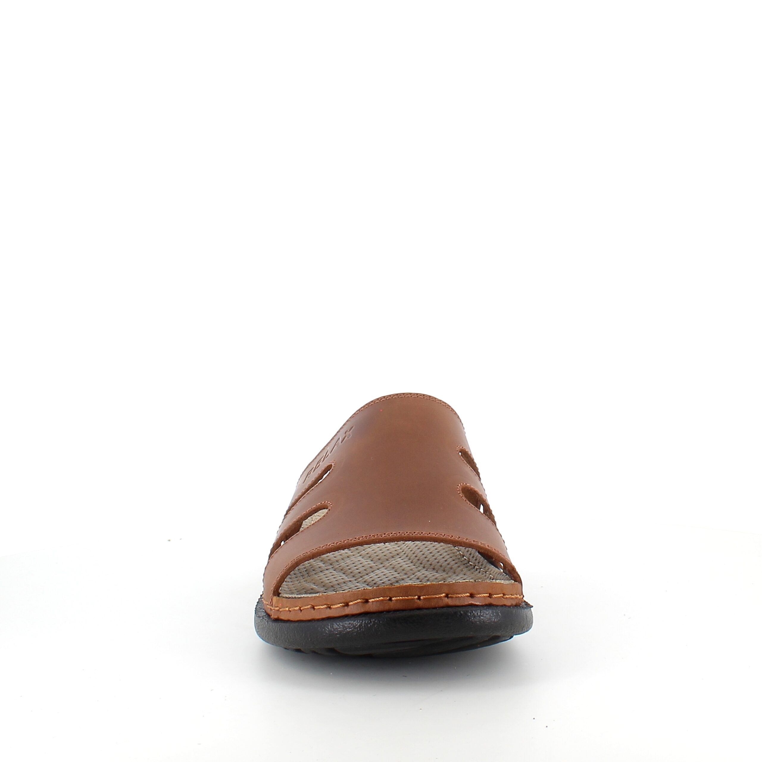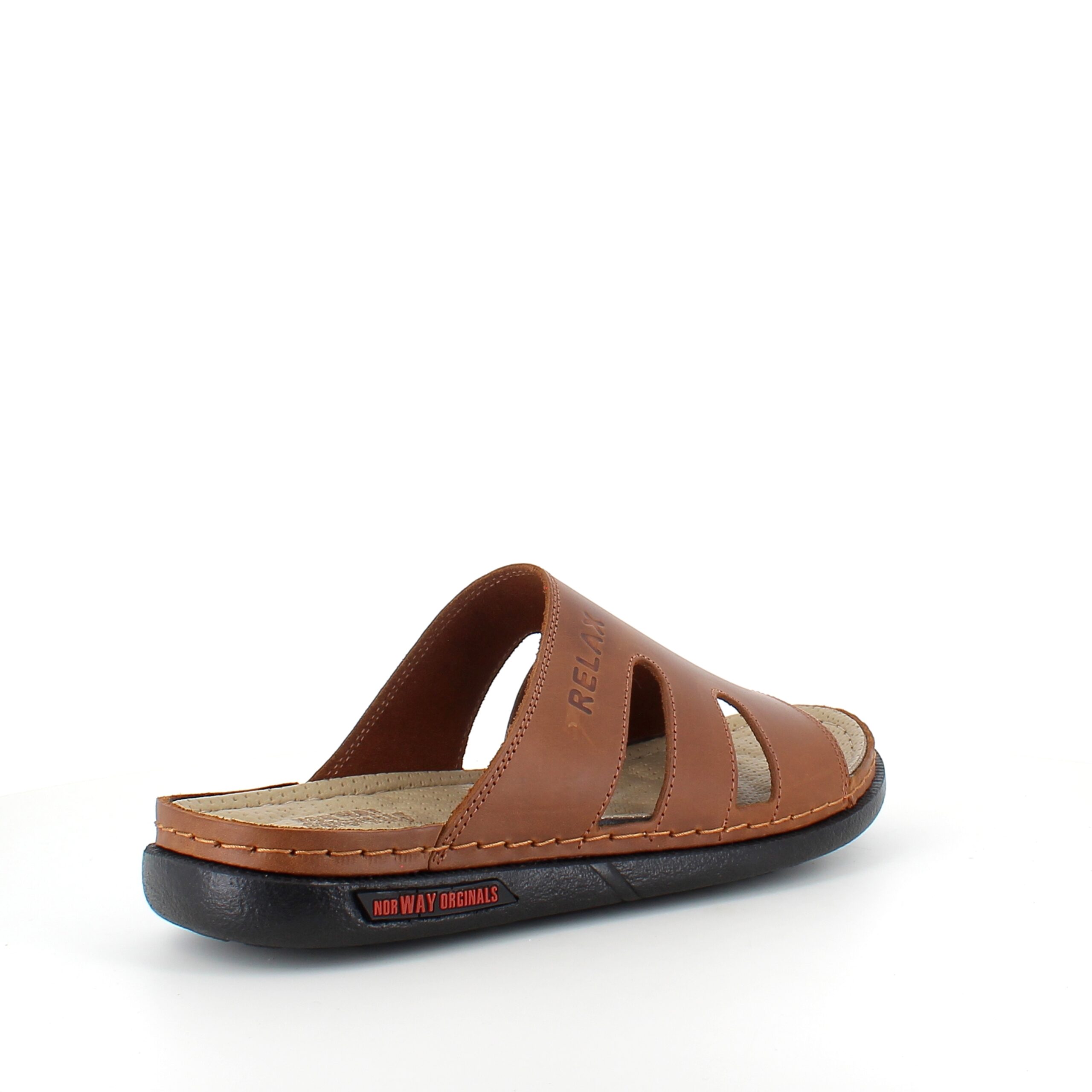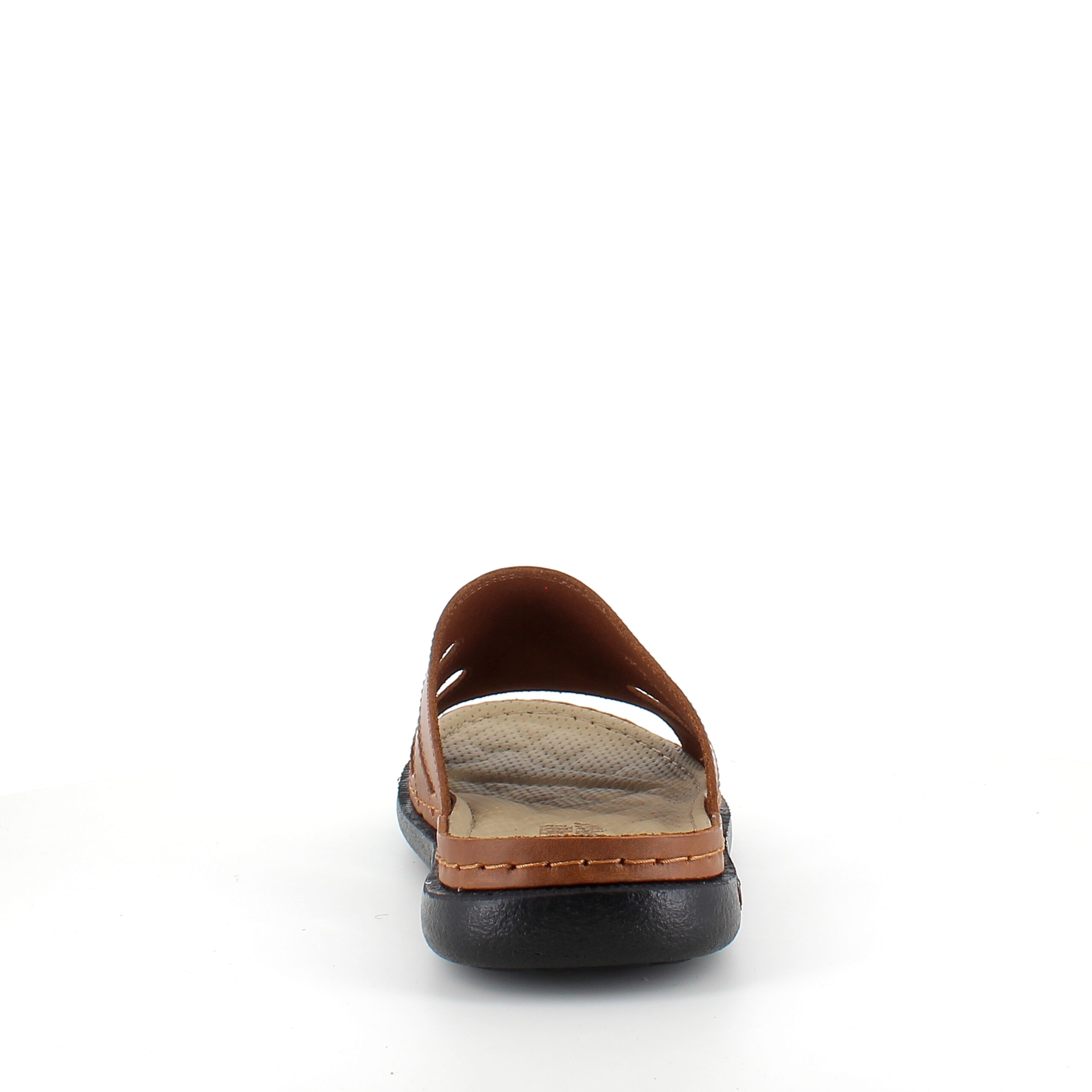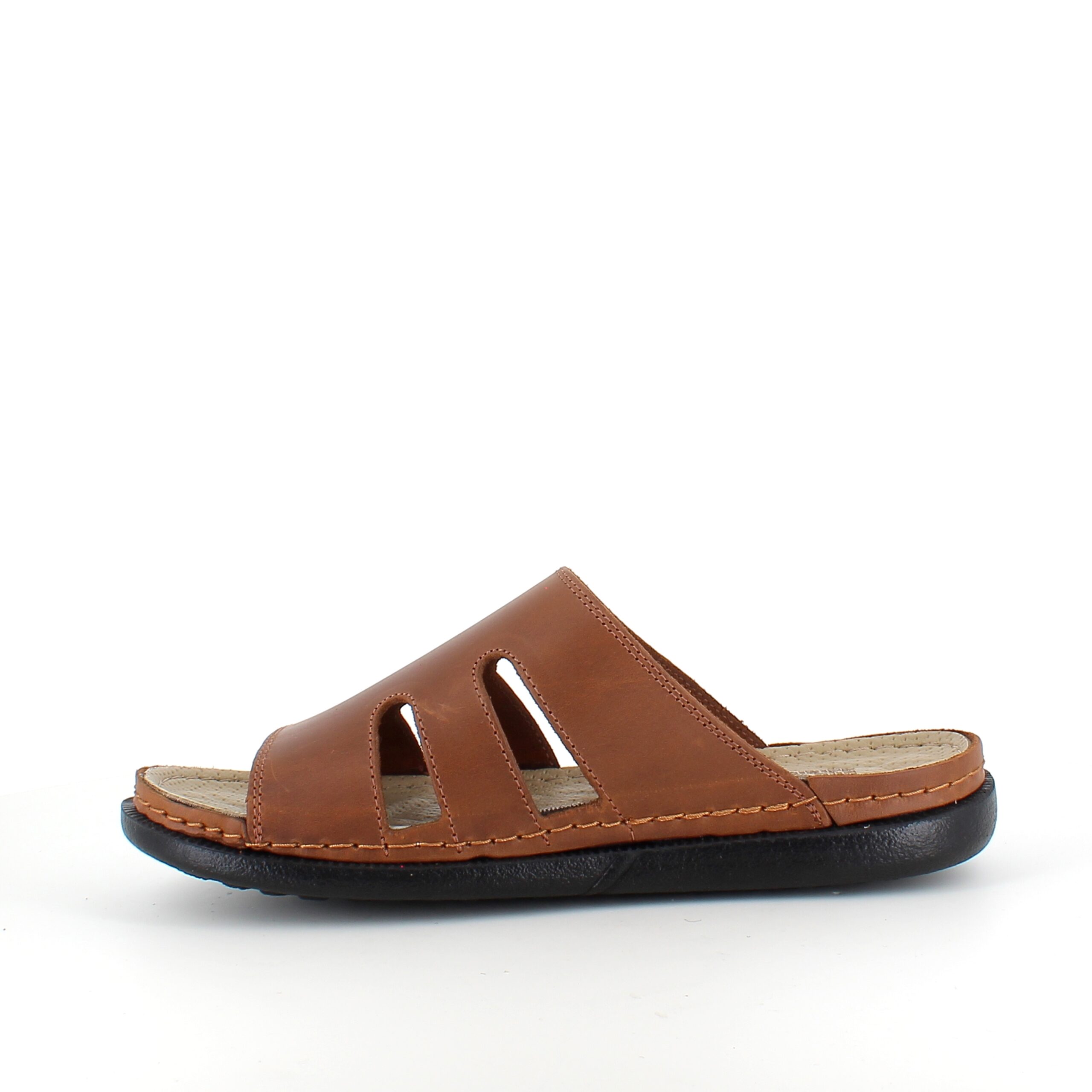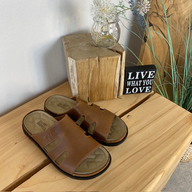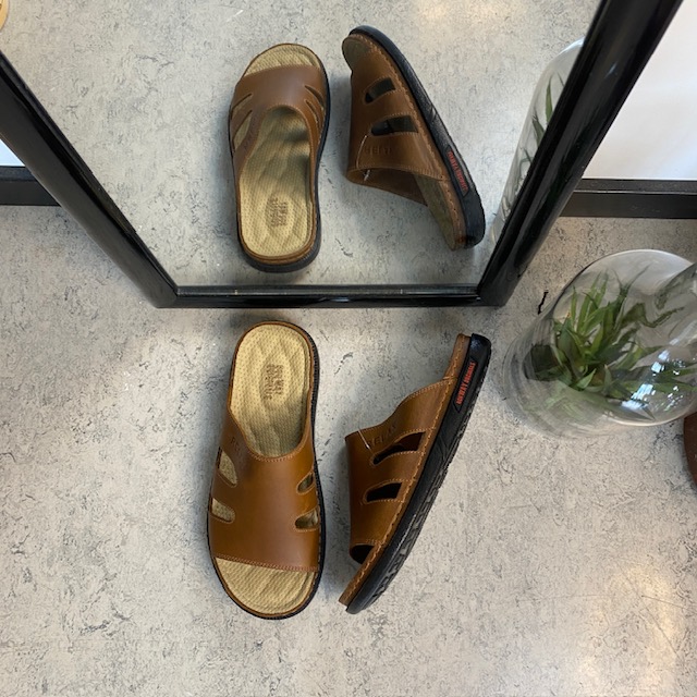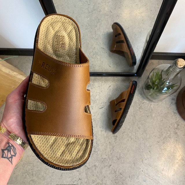 Brun herretøffel-sandal med fokus på komfort.