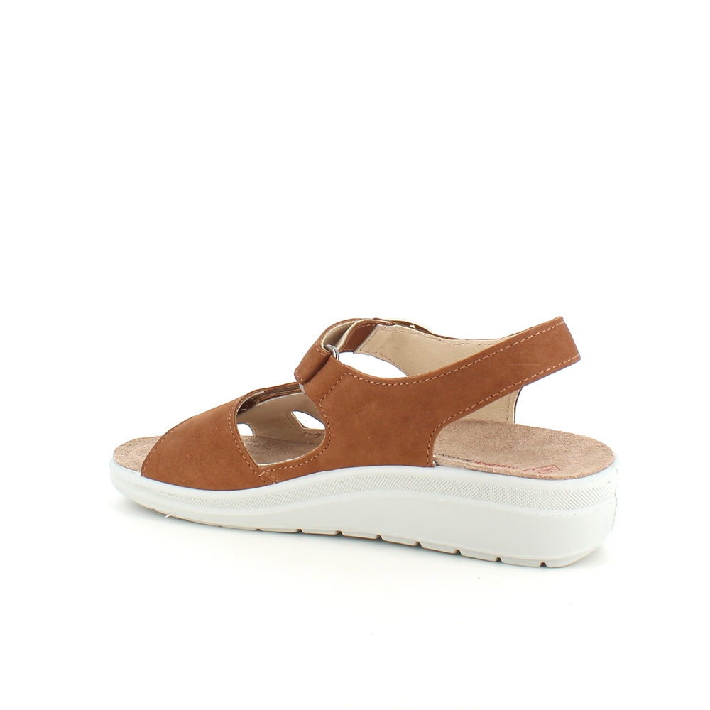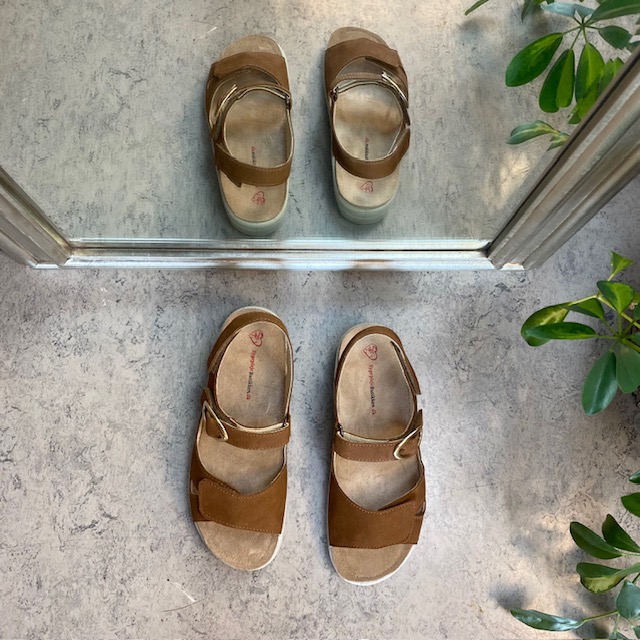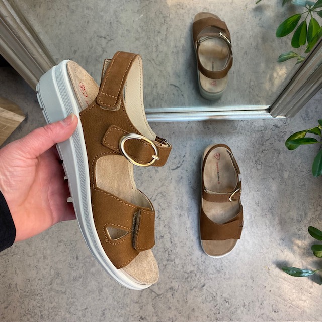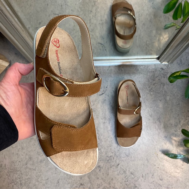 Brun lædersandal med tre justerbare remme og en aftagelig indersål.