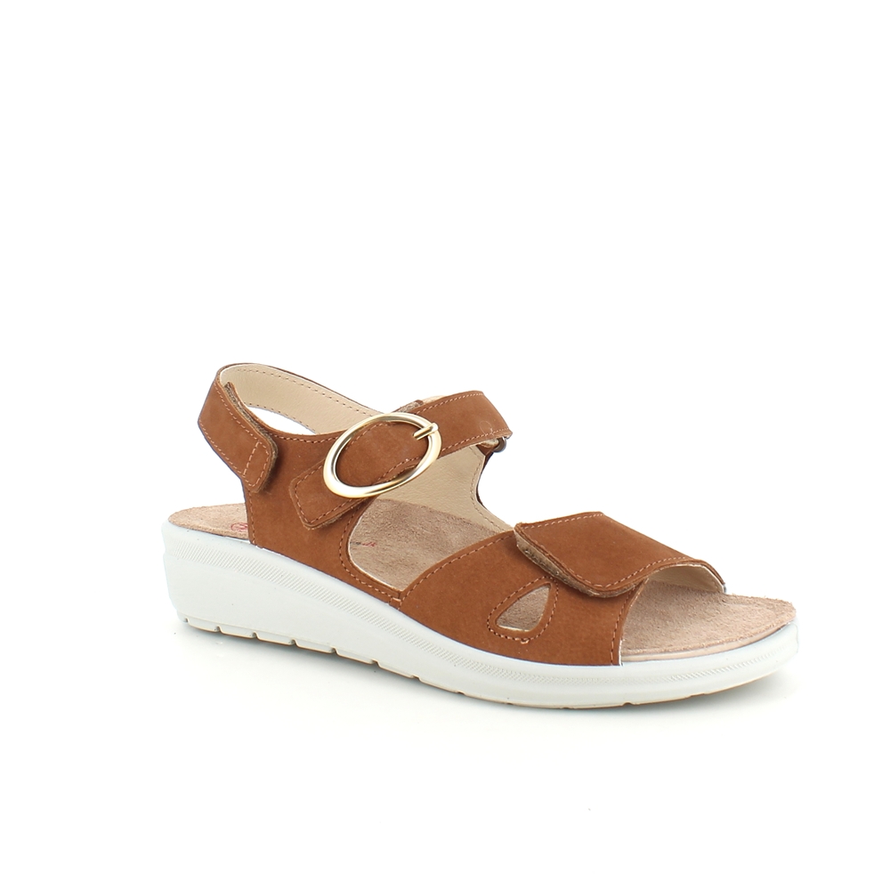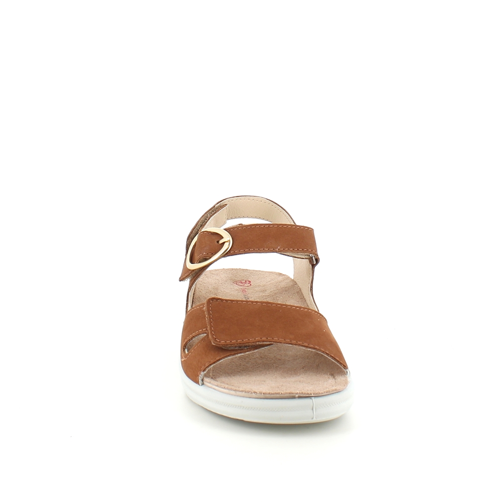 Denne brune lædersandal med tre justerbare remme og en aftagelig indersål er designet til både stil og komfort.