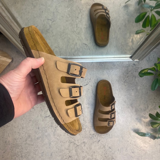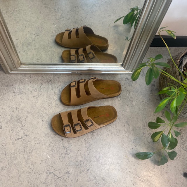 Lækker brun slip-on sandal i skind med tre smalle, justerbare remme. Indersålen har en blød skumsål, der er dækket af ruskind, som strækker sig over mellemsålen for et ekstra touch. Ydersålen har yderligere polstring ved hælen og er ekstremt fleksibel. En virkelig luksuriøs og veludført slip-on sandal. Denne sandal fås i størrelserne 37-42 og fås i flere farver.