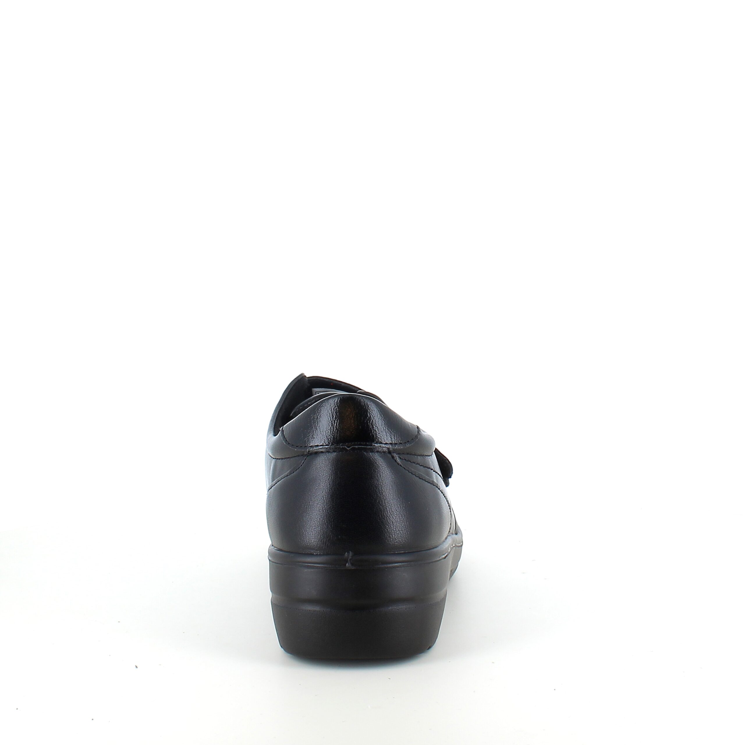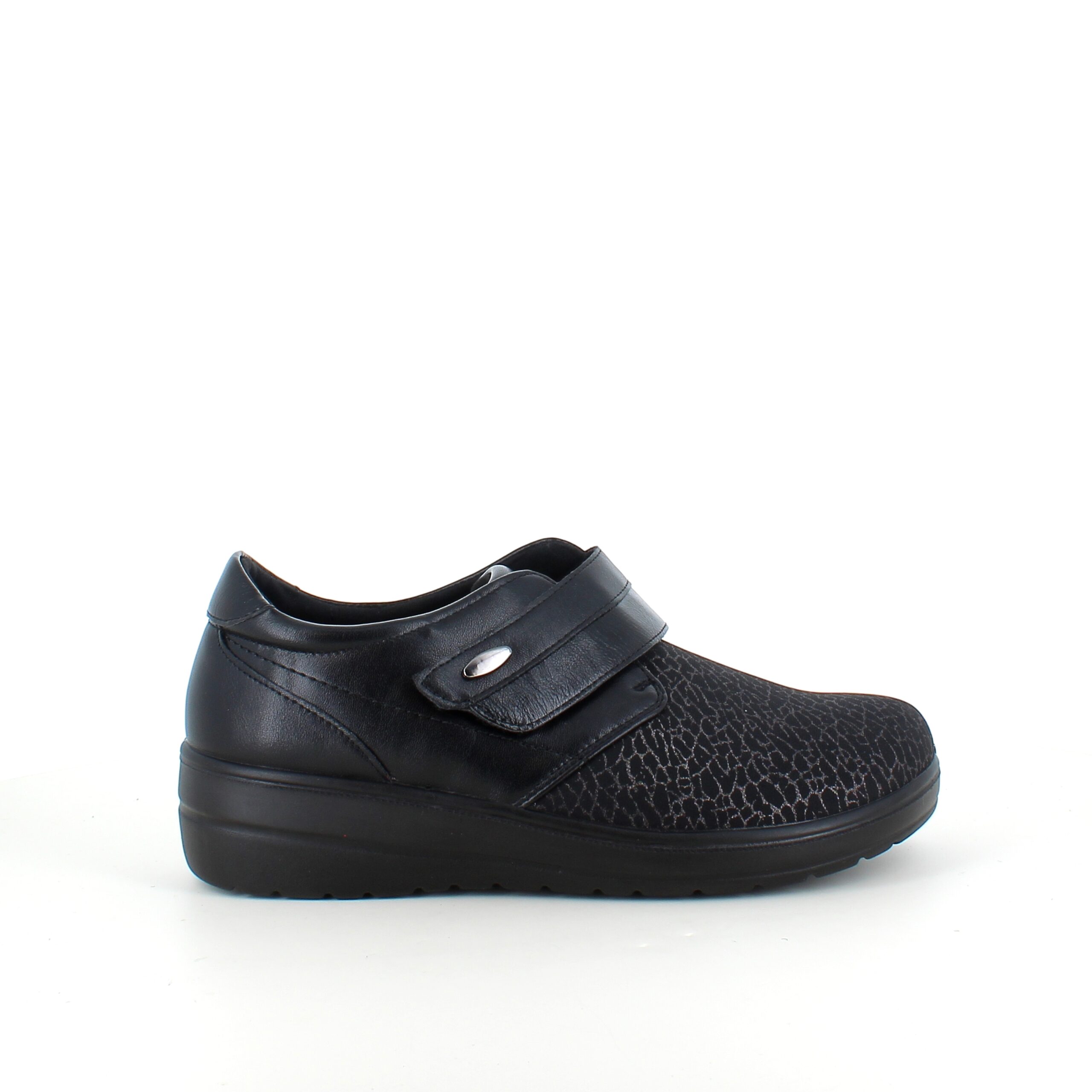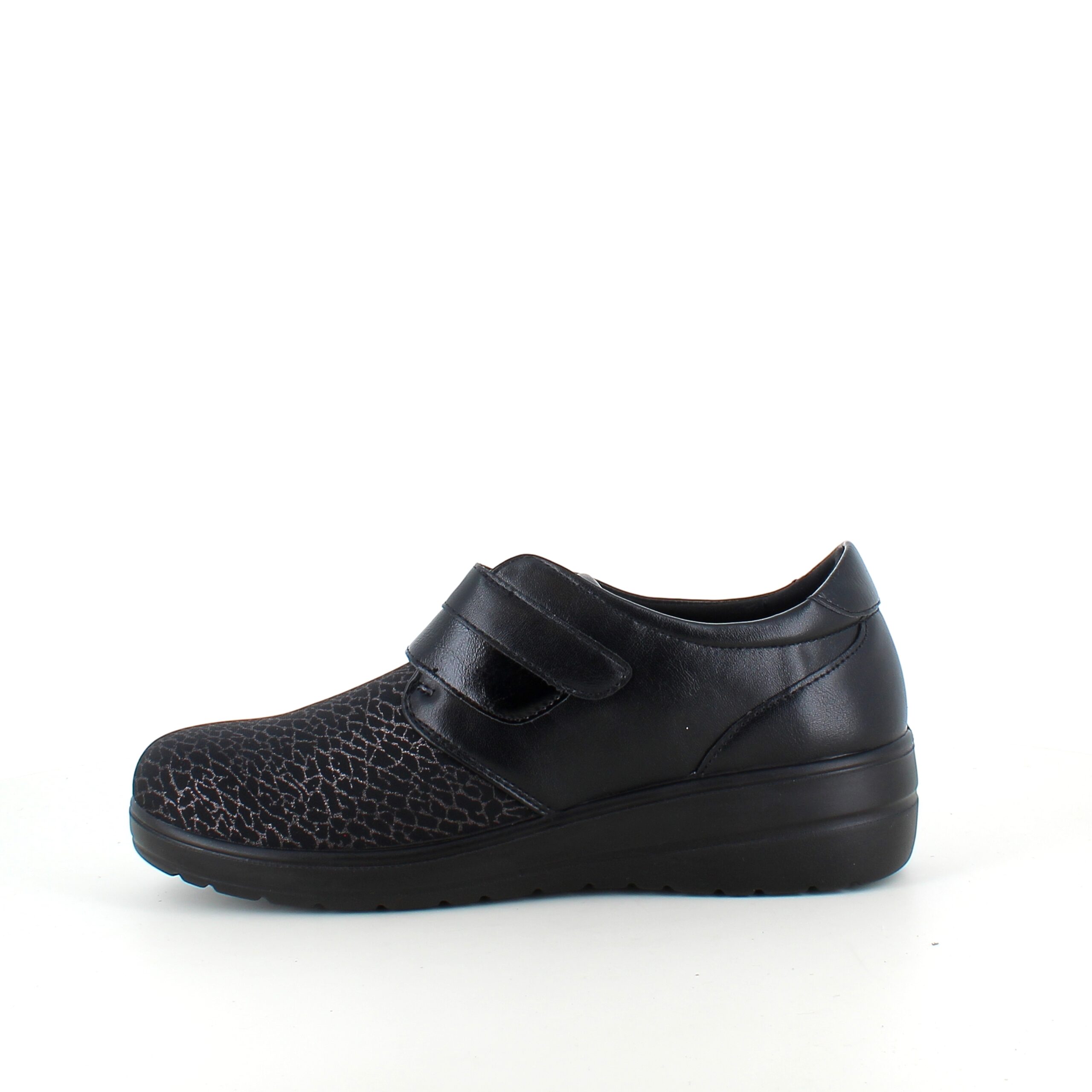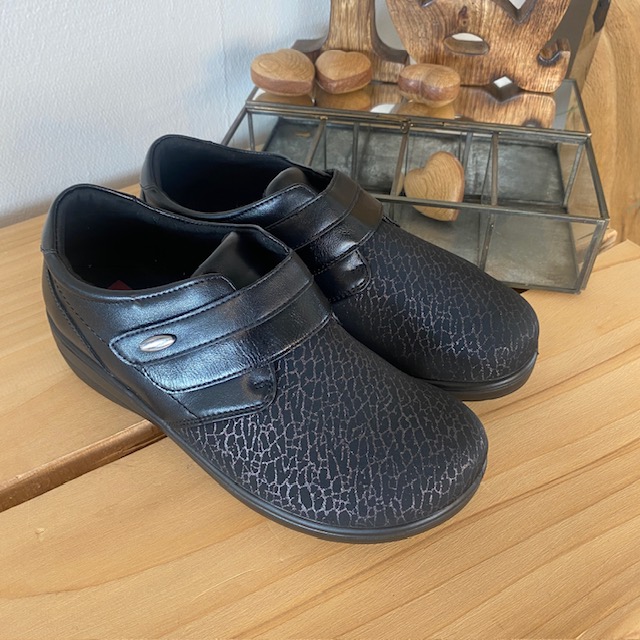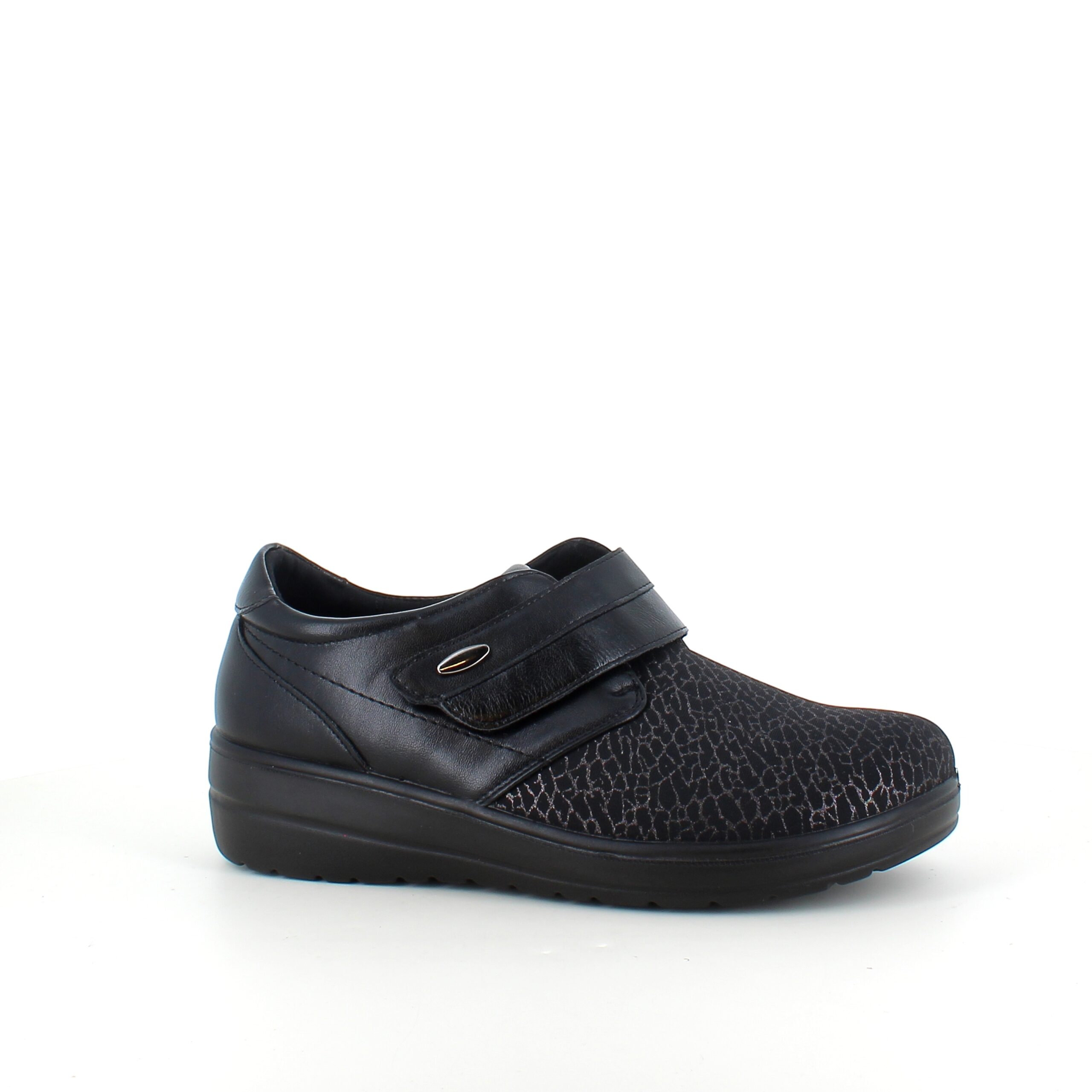 Damesko i sort PU med mønstret overdel, velcrolukning og fleksibel PU-sål