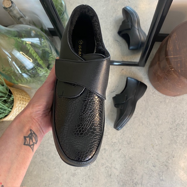 Overdelen er detaljeret med et elegant slangemønster, der giver et moderne look, mens den brede velcrolukning gør skoen nem at få af og på – også for dig, der har brug for ekstra rummelighed.
