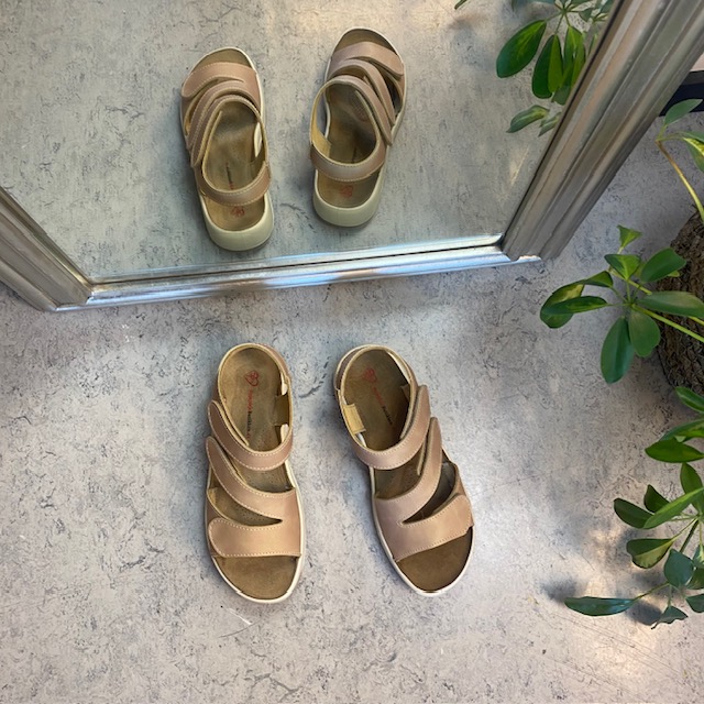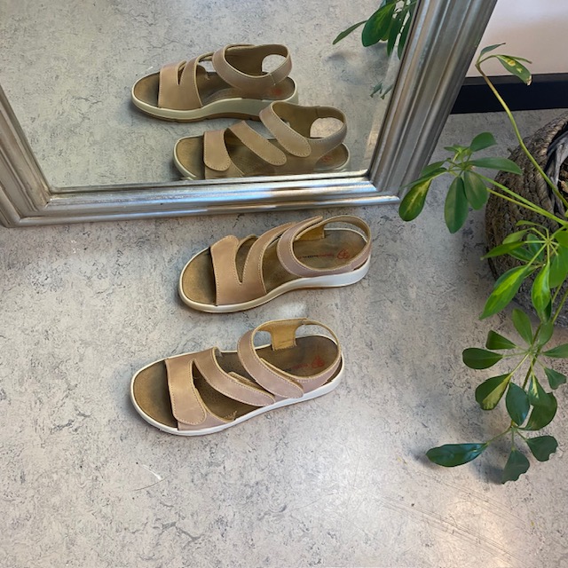 Elegant beige skindsandal med tre justerbare remme så sandalen kan tilpasses præcist til din fod.