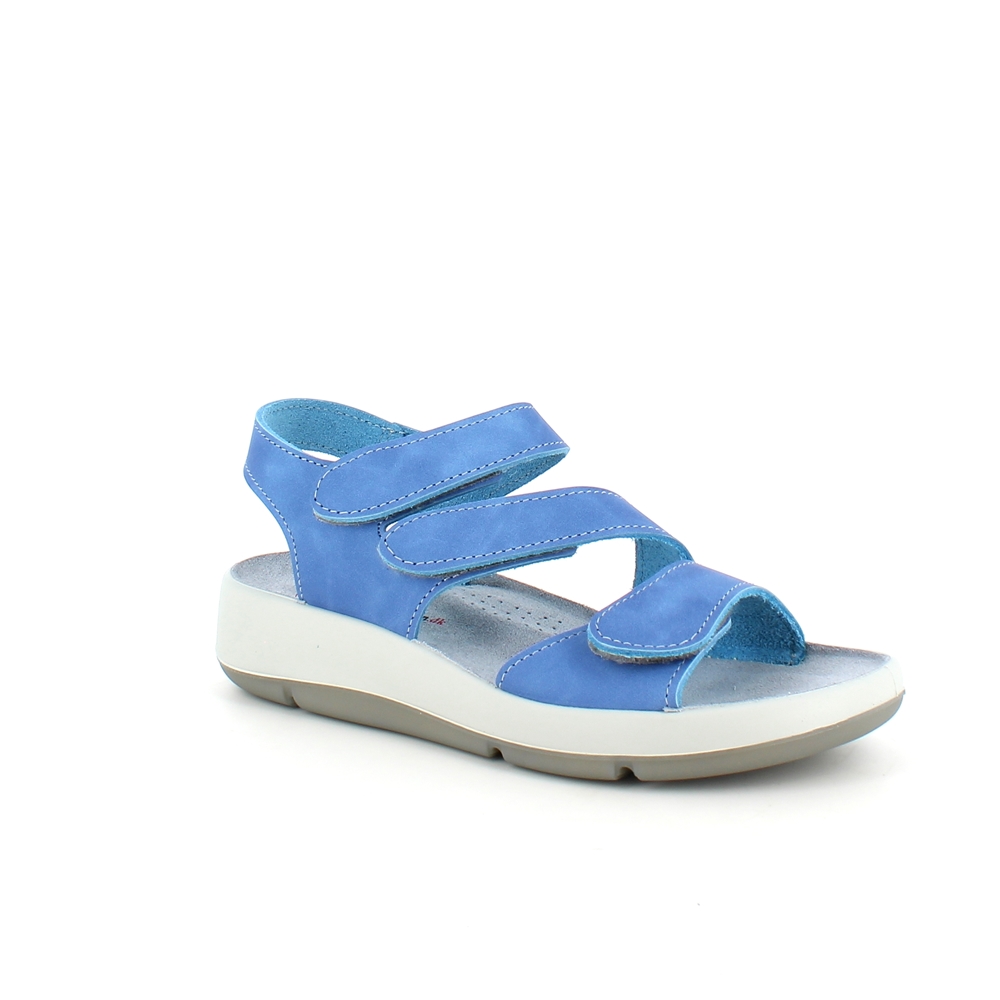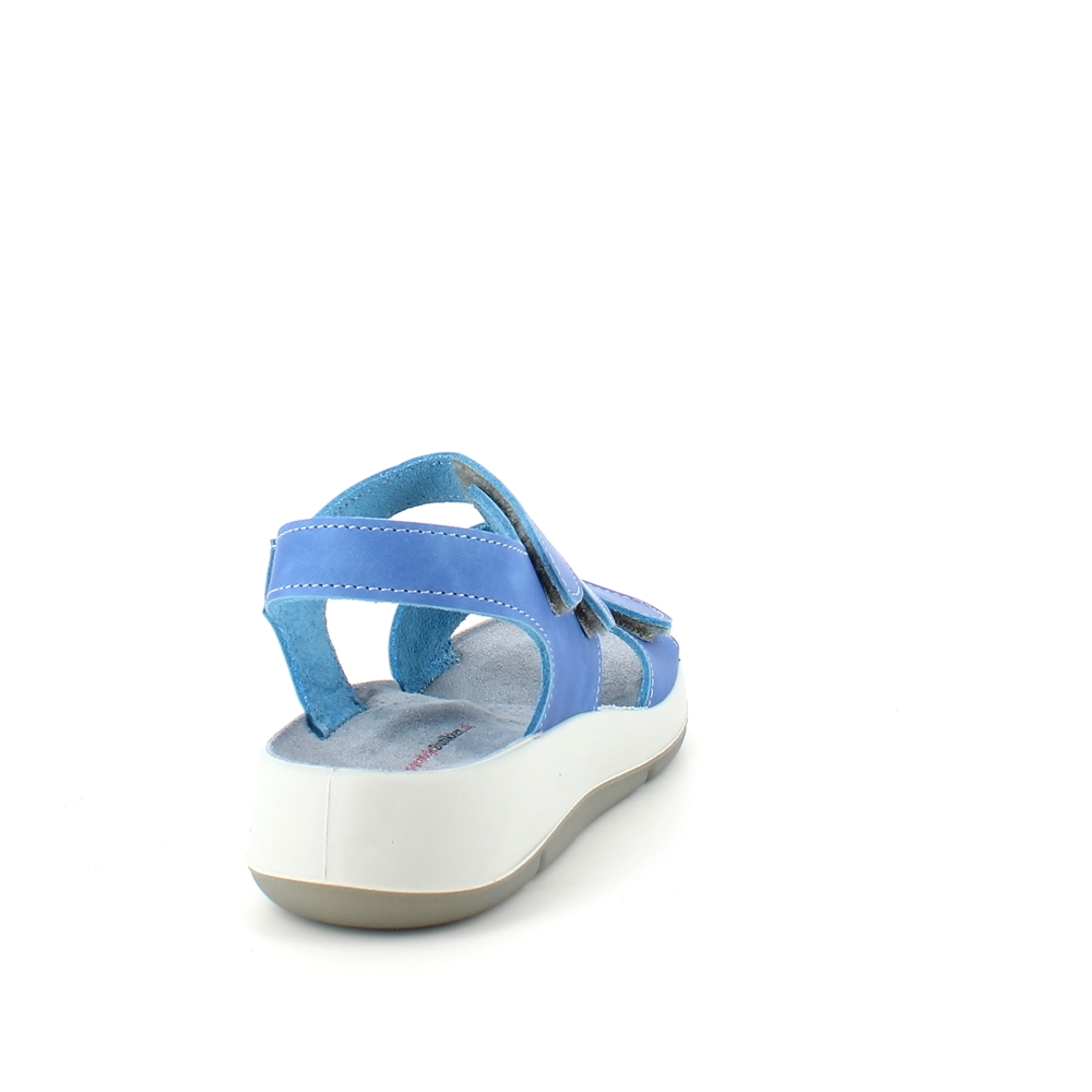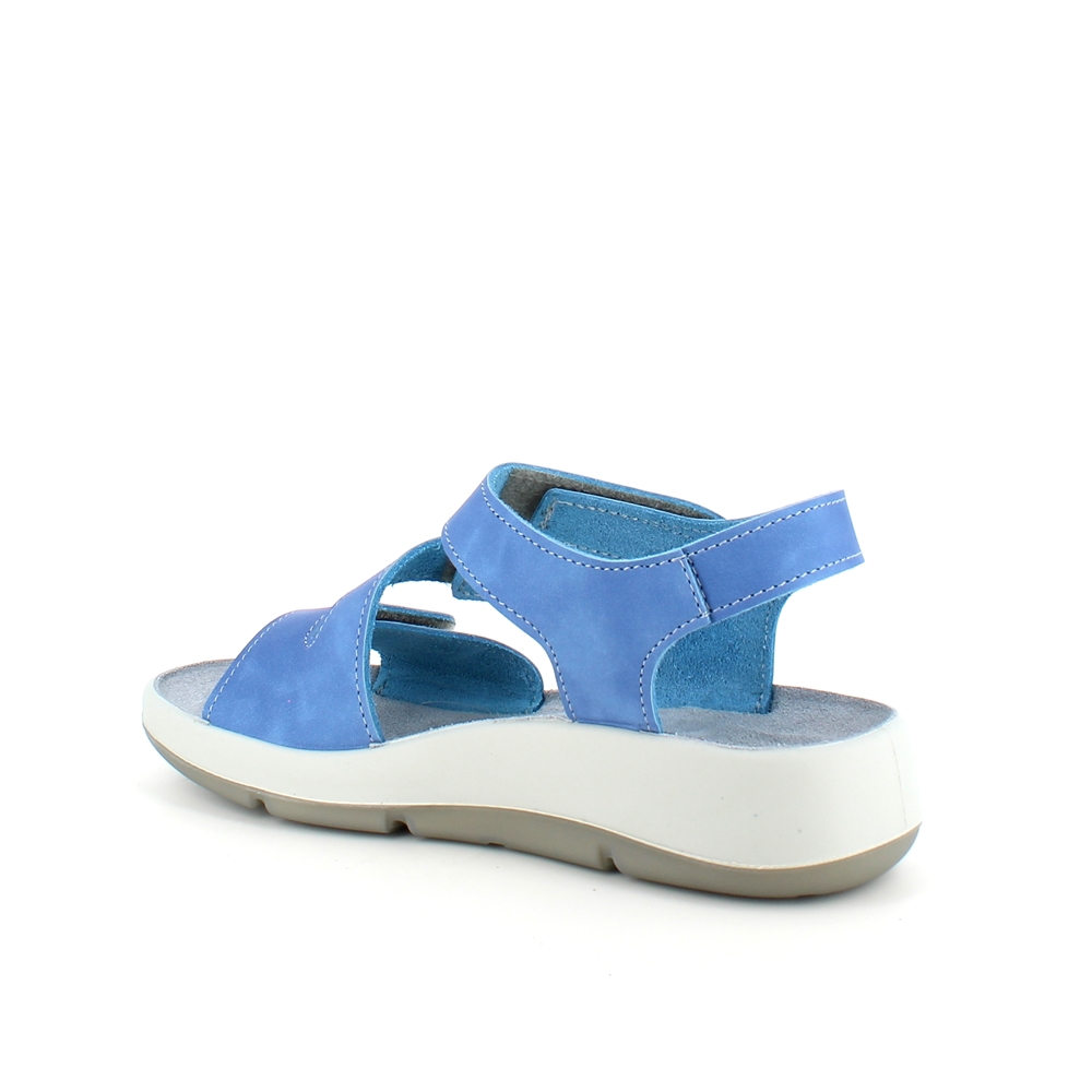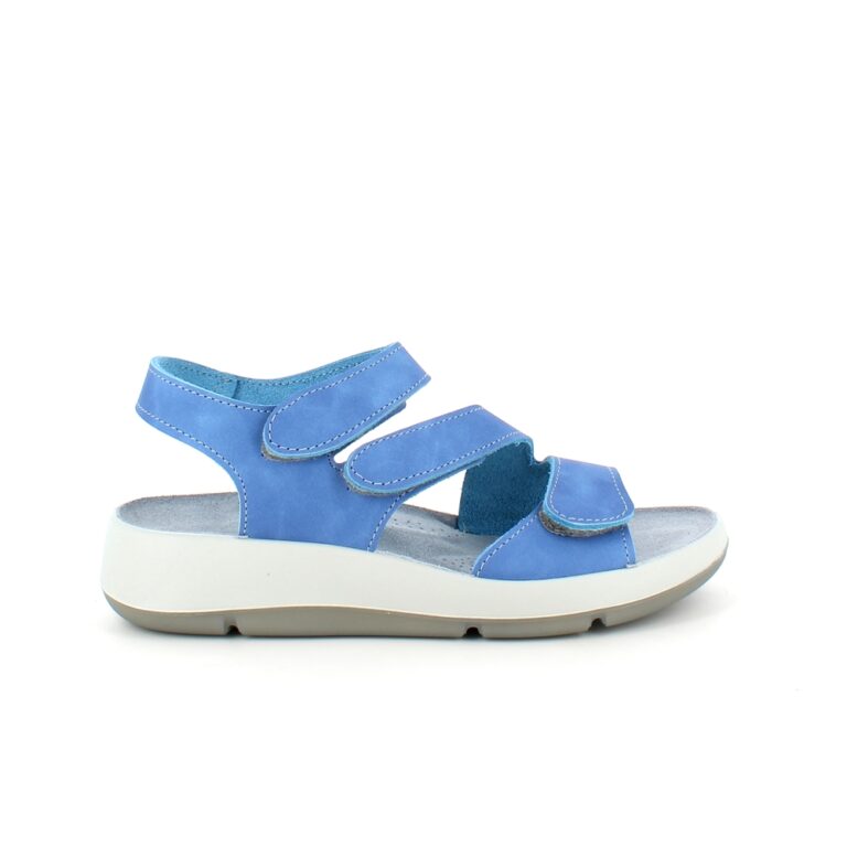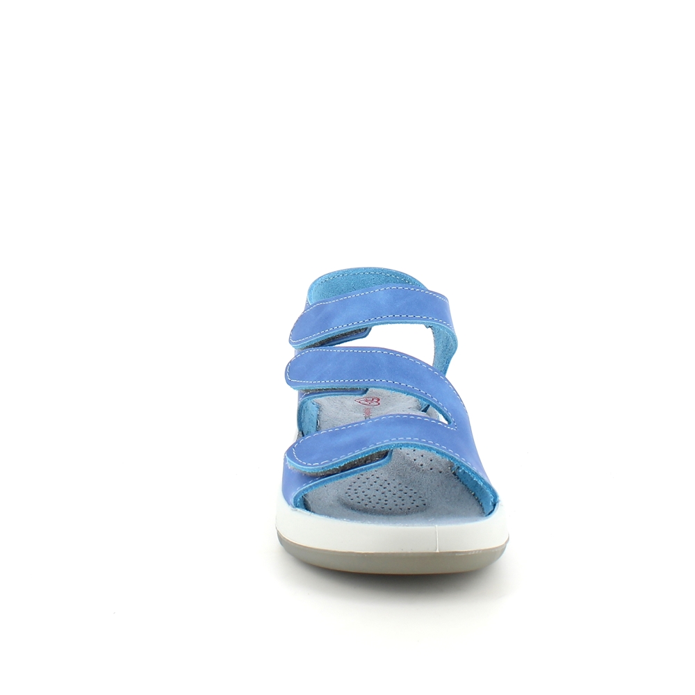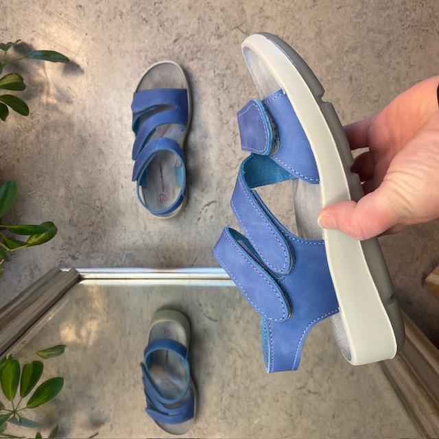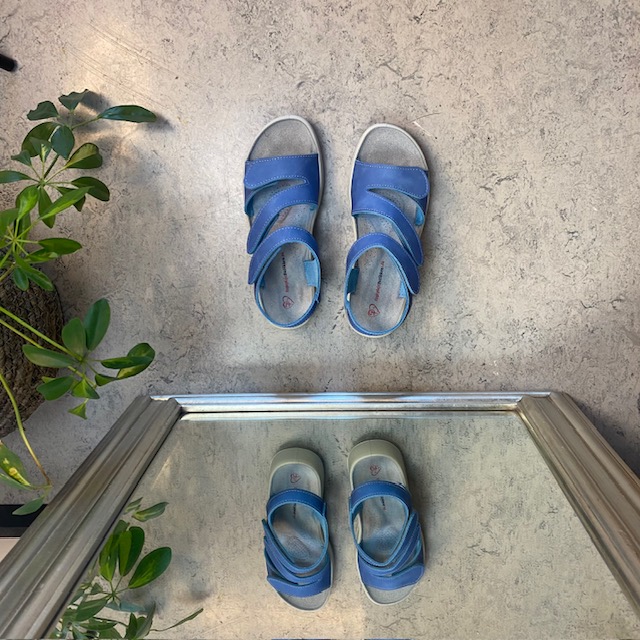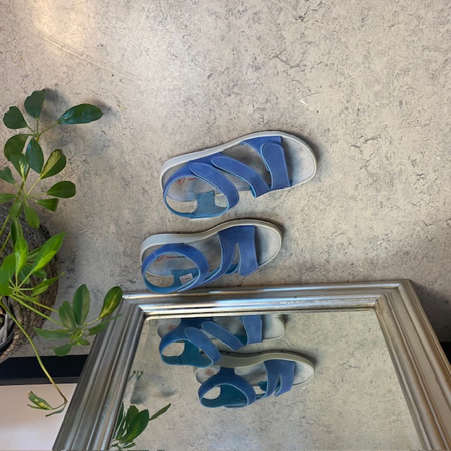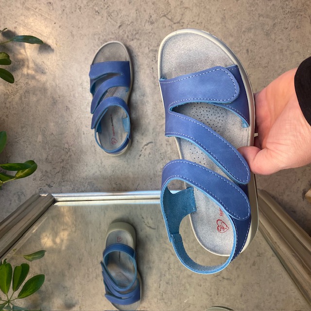 Elegant blå skindsandal med tre justerbare remme så sandalen kan tilpasses præcist til din fod.
