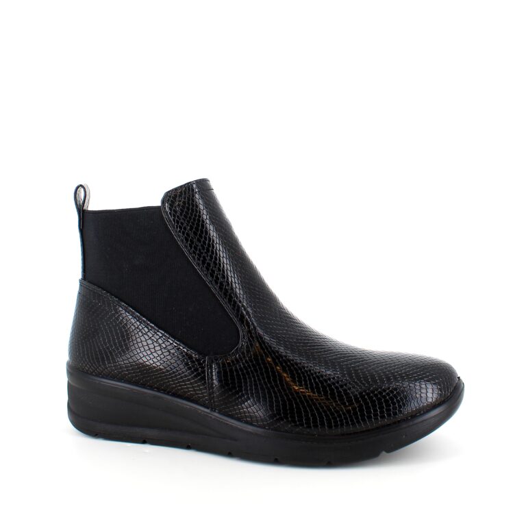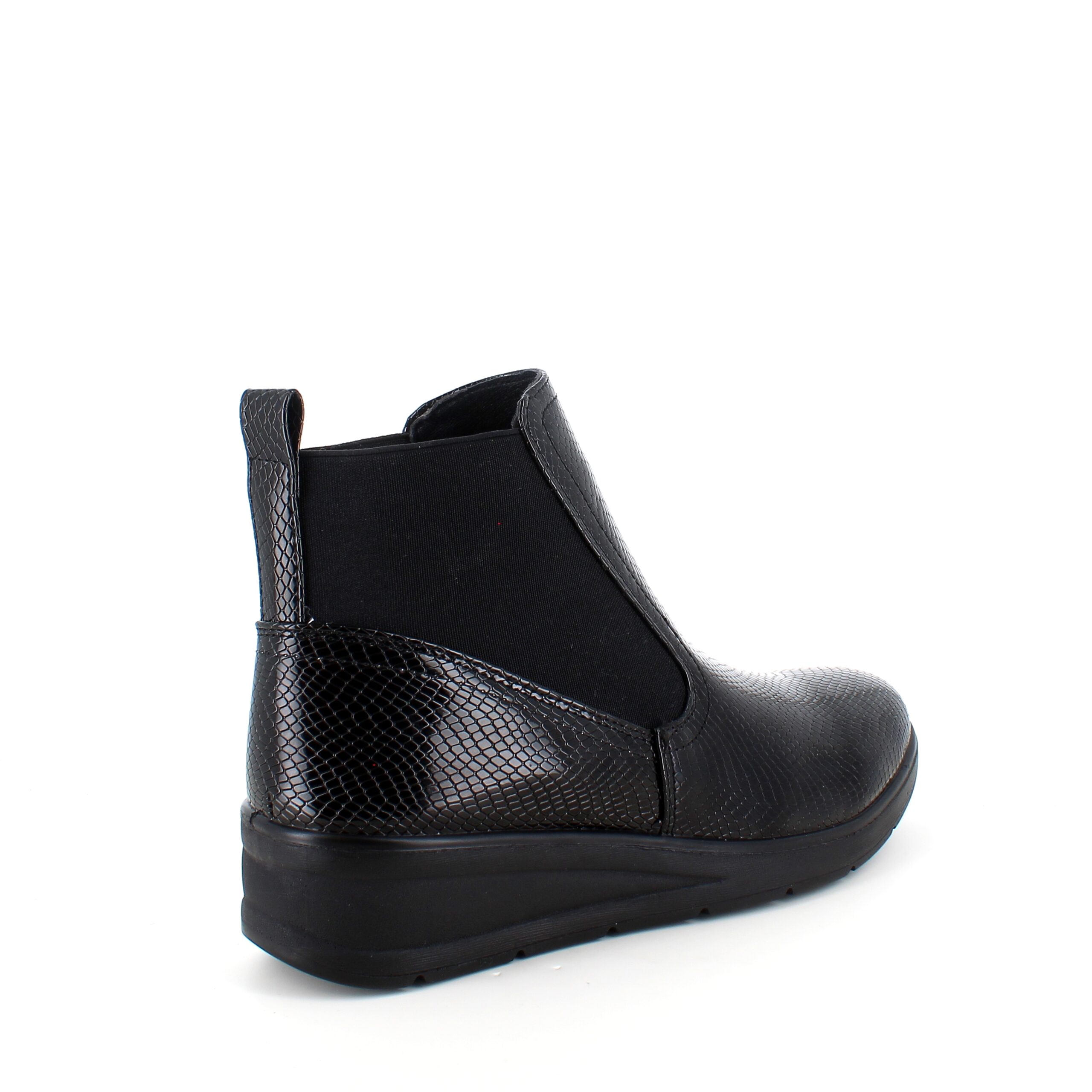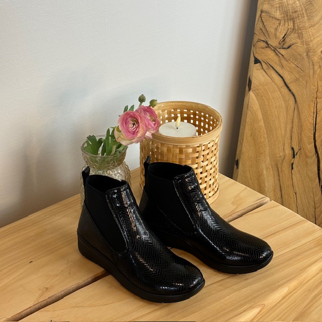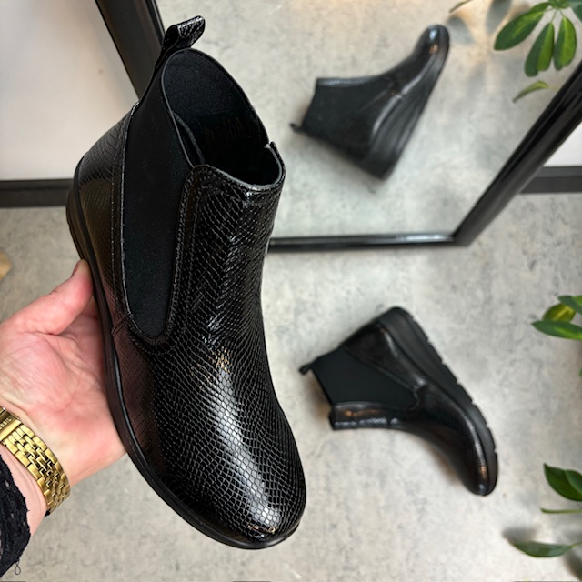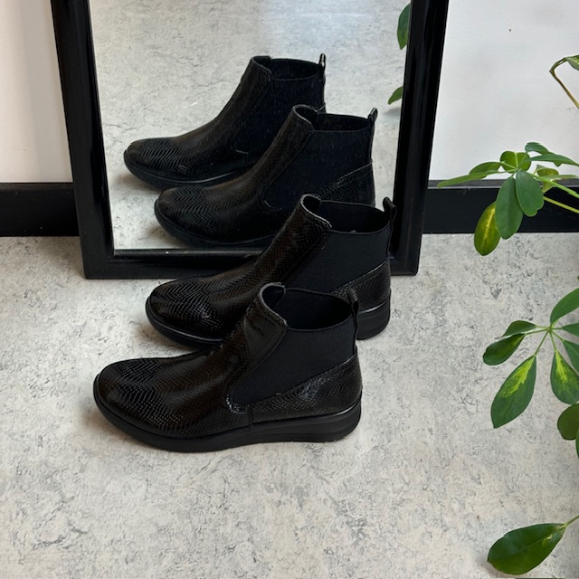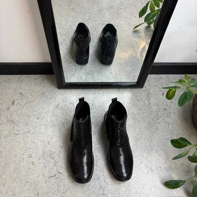 Støvleskaftet har en bred elastisk åbning, hvilket gør det nemt at tage af og på, og det sidder tæt omkring læggen.