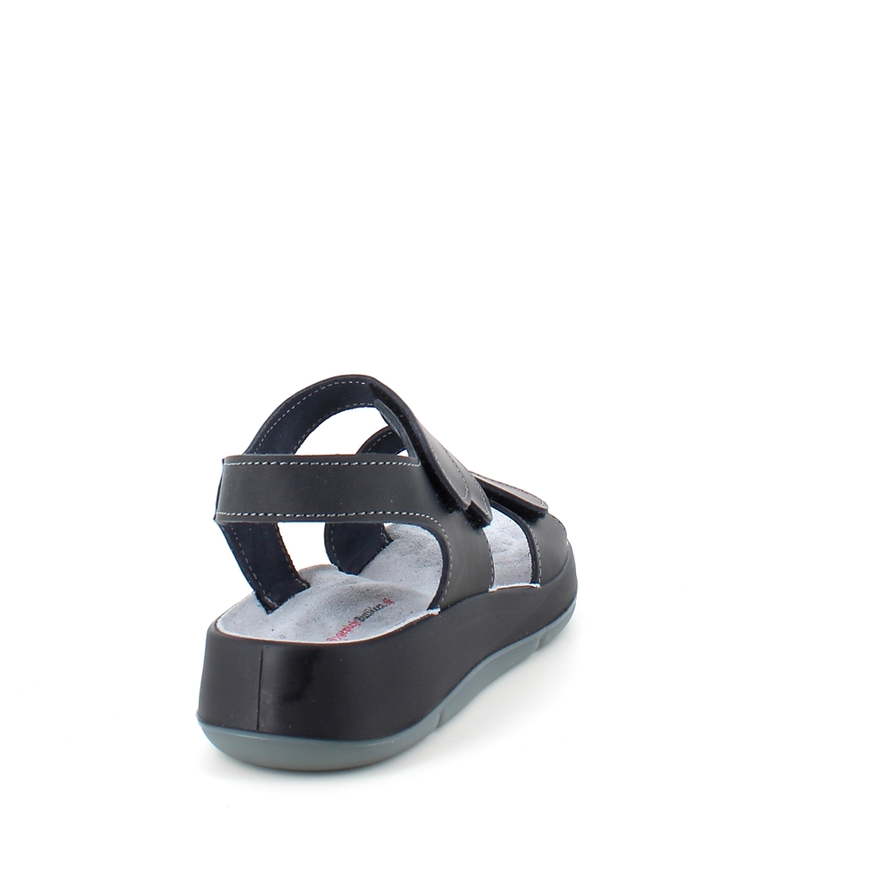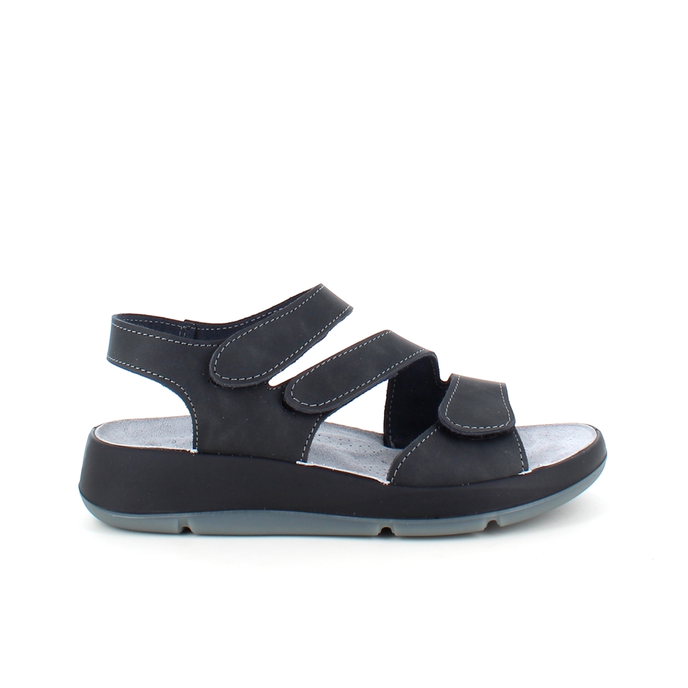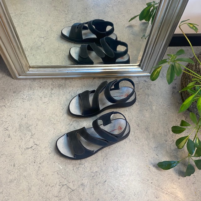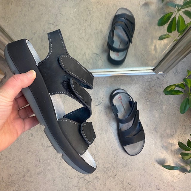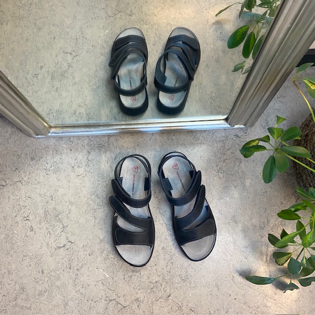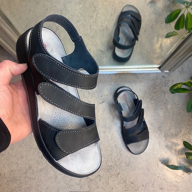 Elegant sort skindsandal med tre justerbare remme så sandalen kan tilpasses præcist til din fod.