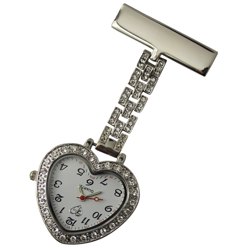 Feminint sygeplejeur med hjerteformet urskive, pyntet med krystaller hele vejen rundt. Sygeplejeuret er 8 cm langt og 3,5 cm bredt.