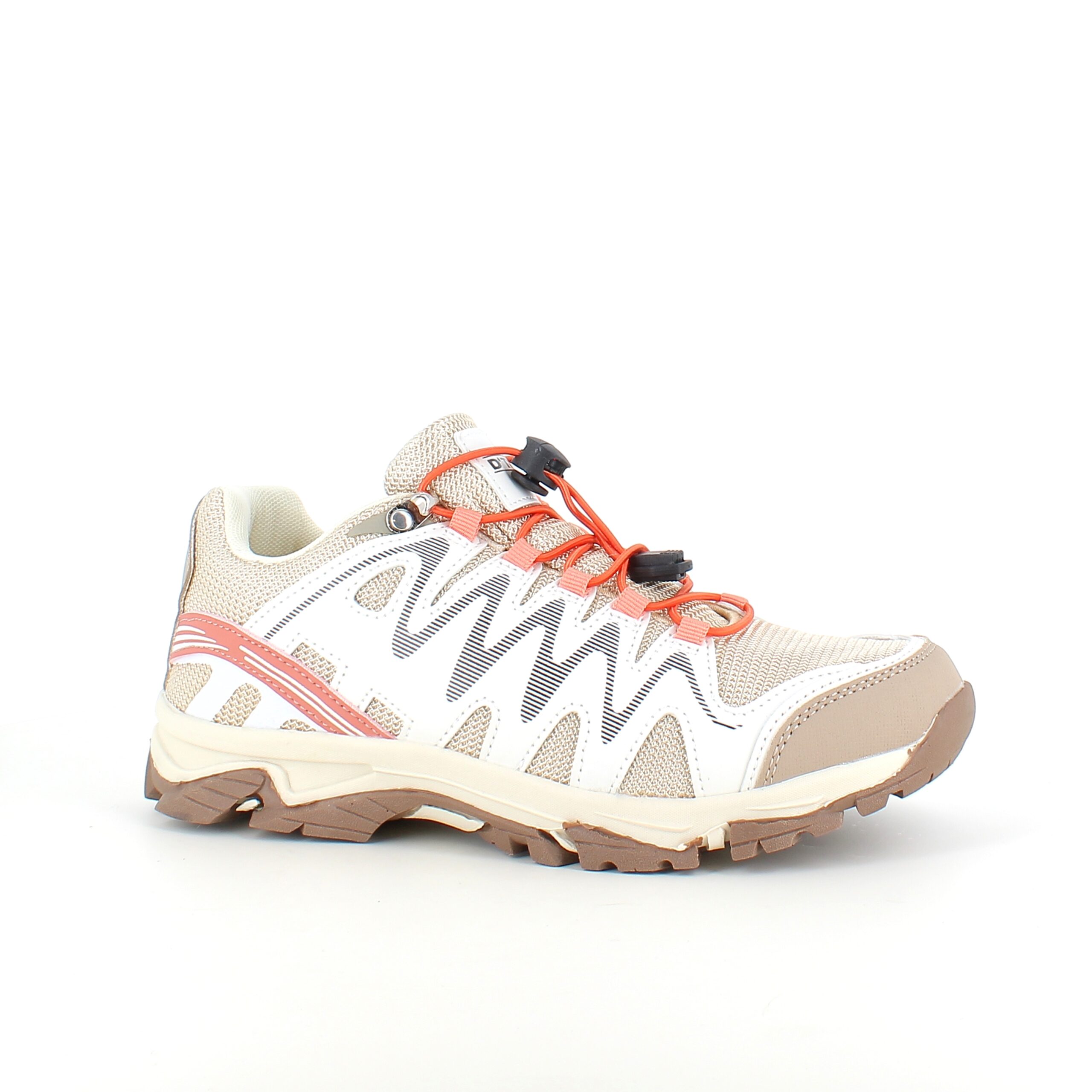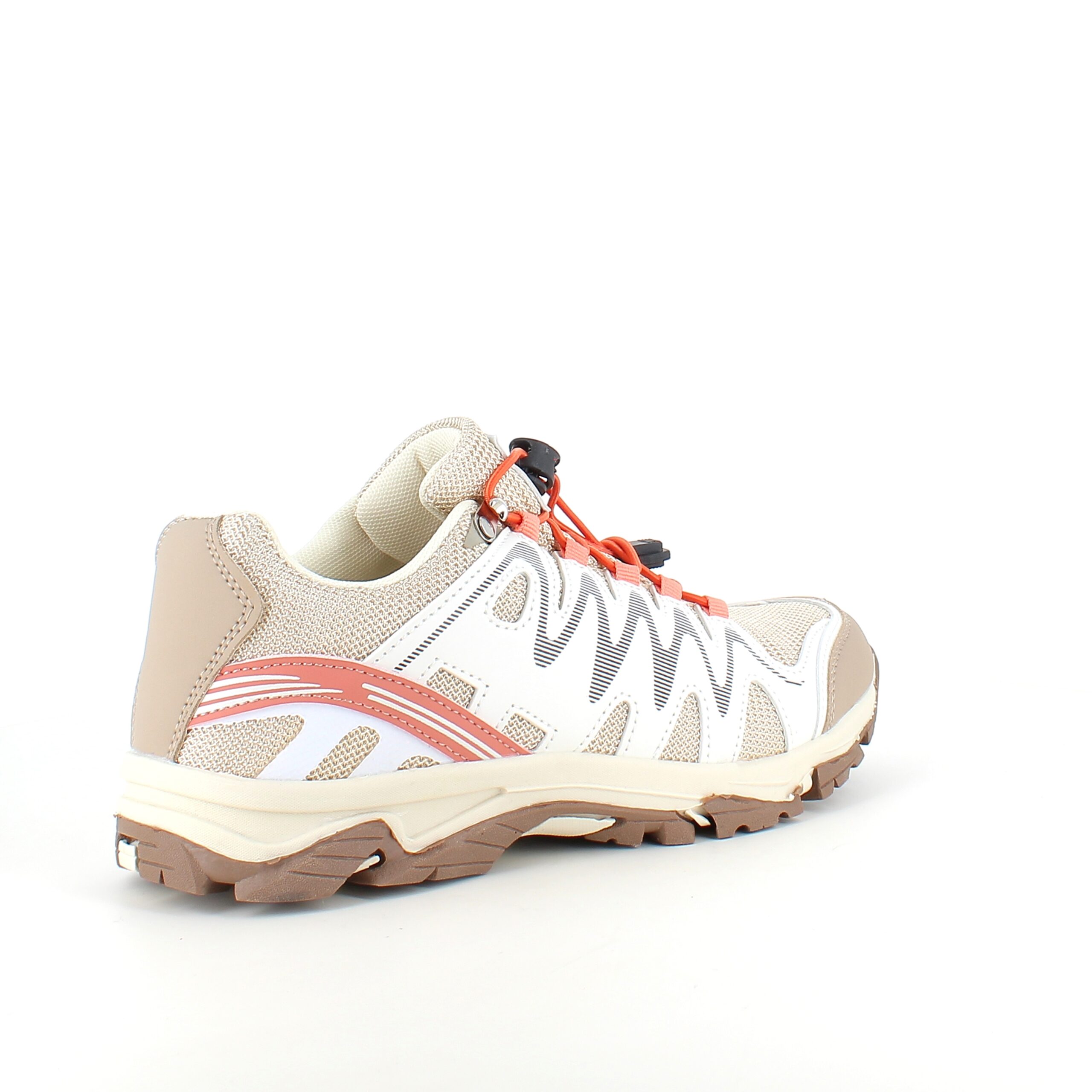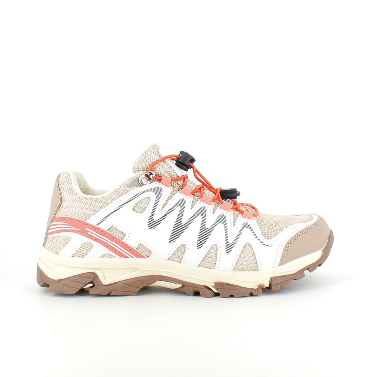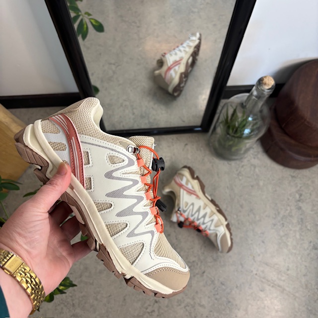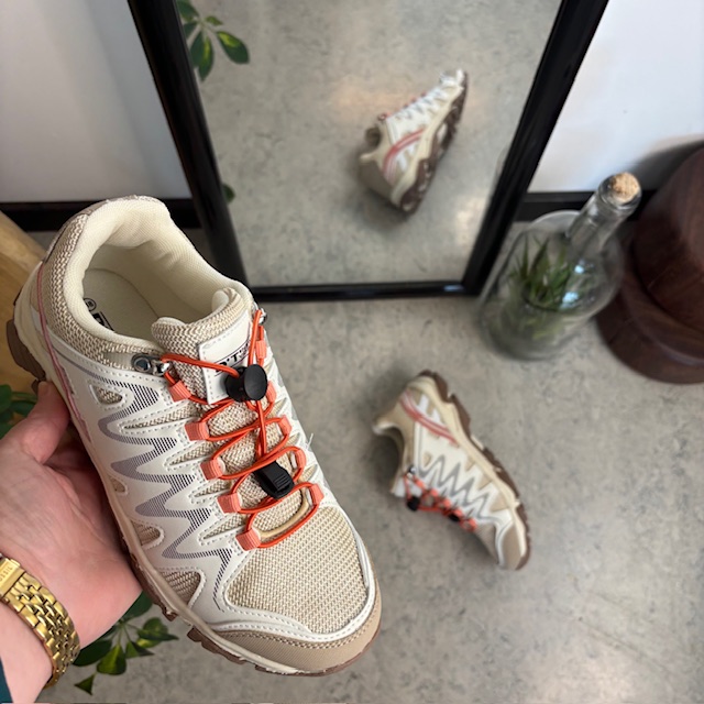 Fleksible beige sneakers med elastiksnørebånd.