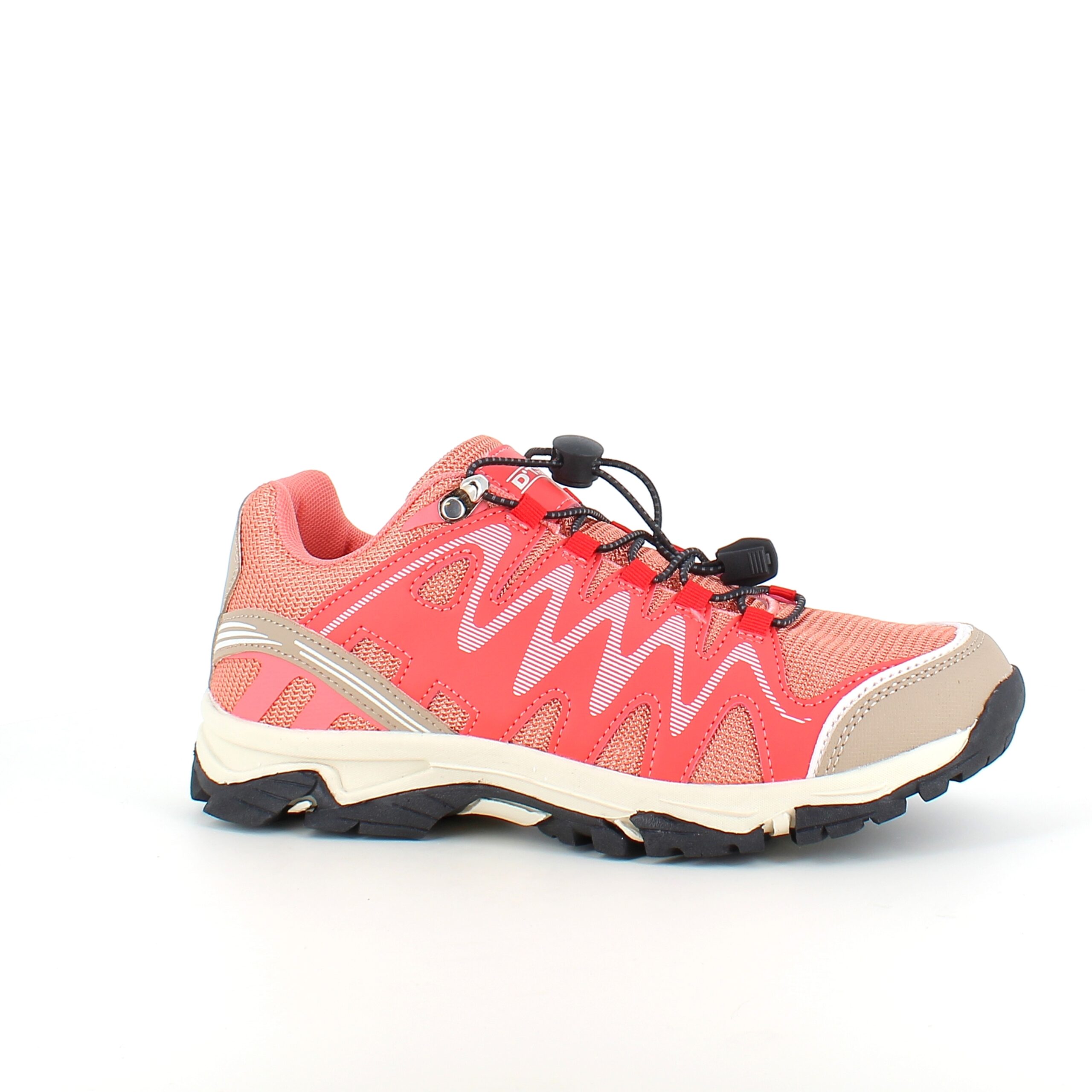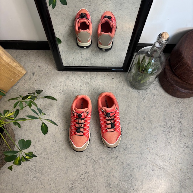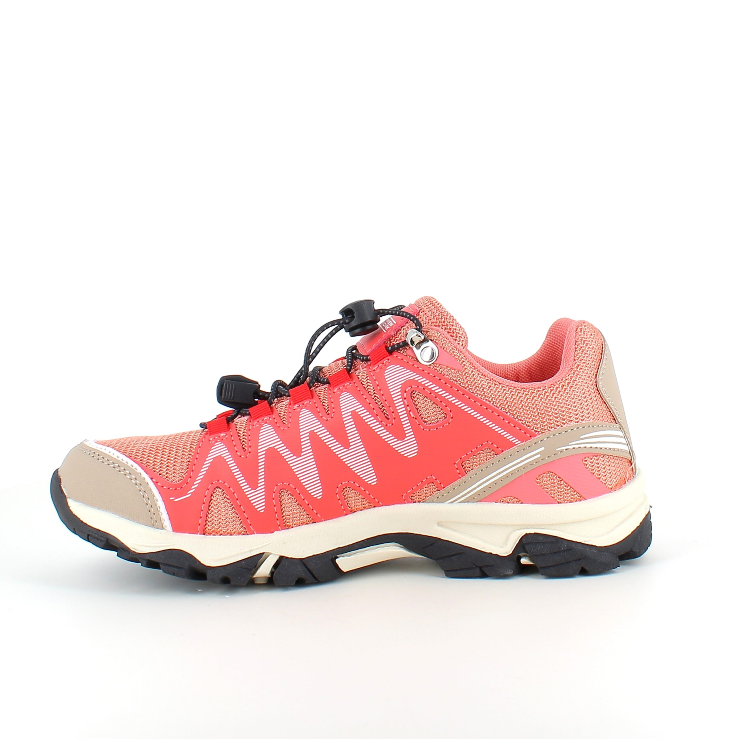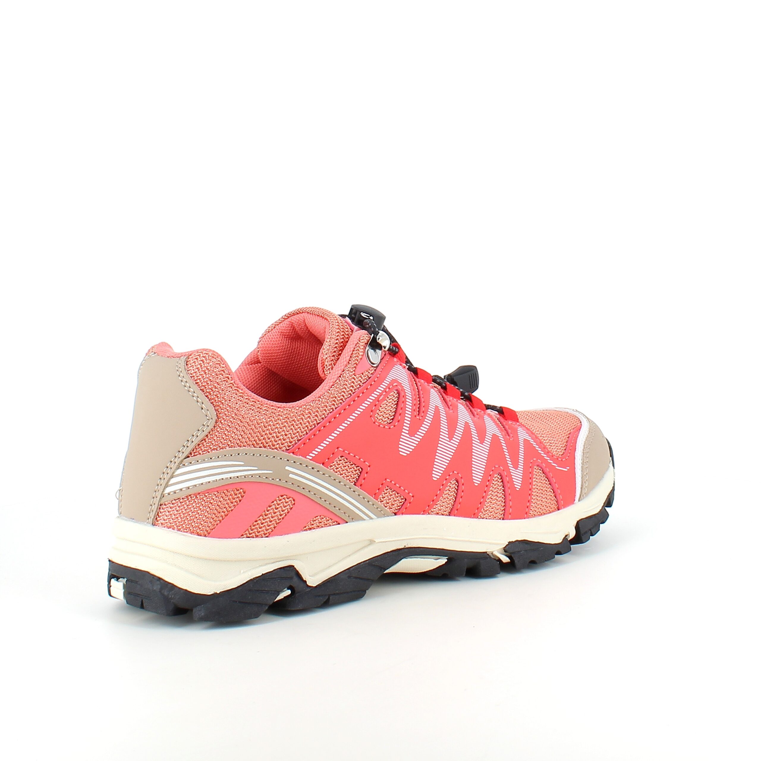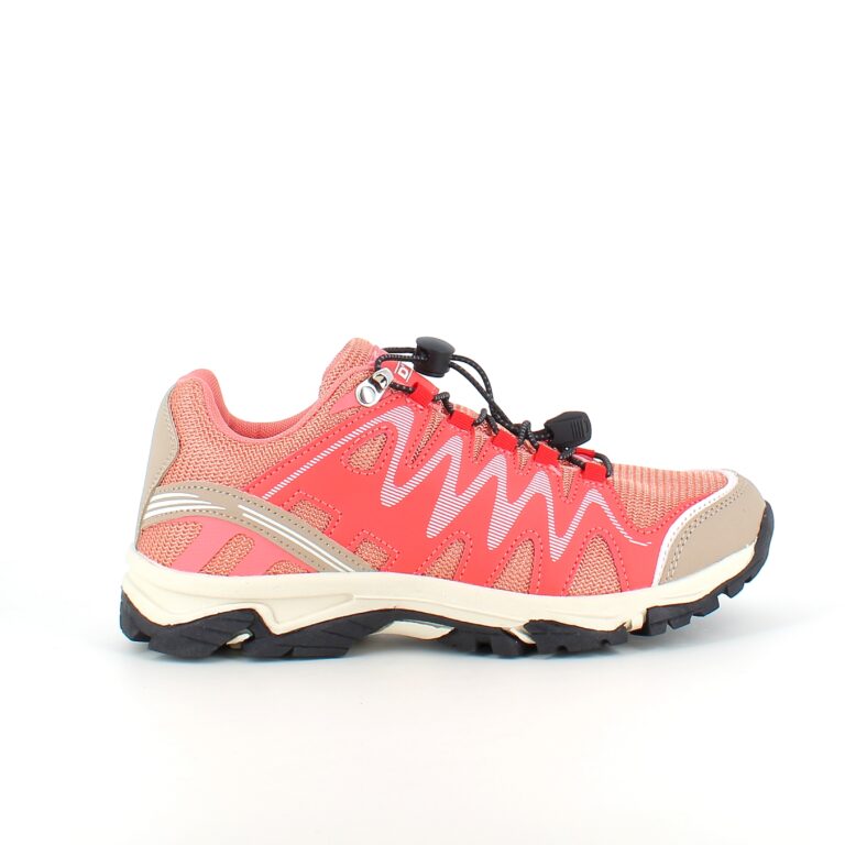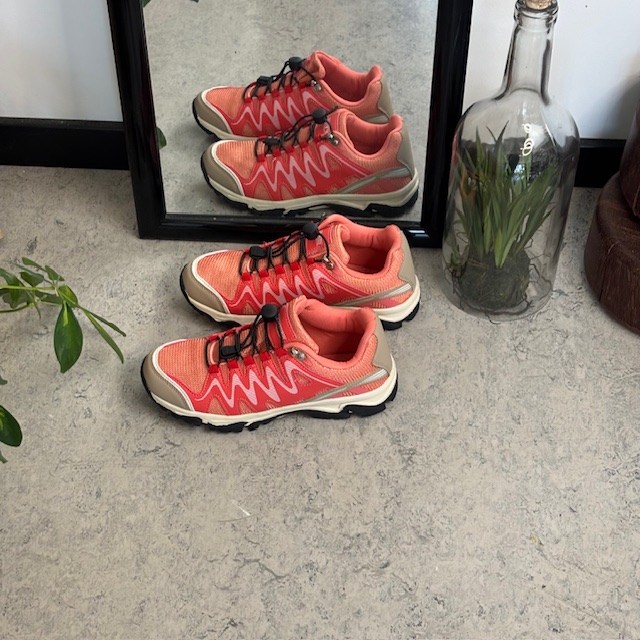 Fleksible laksefarvede sneakers med elastiksnørebånd.