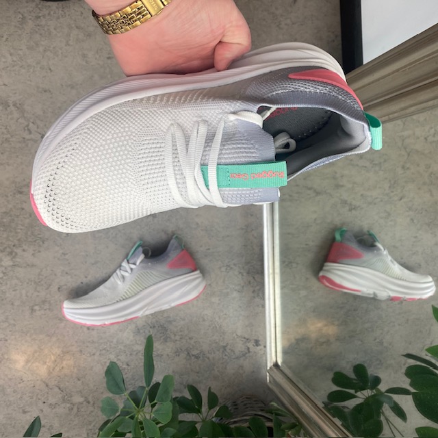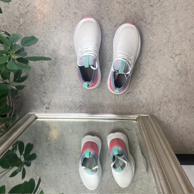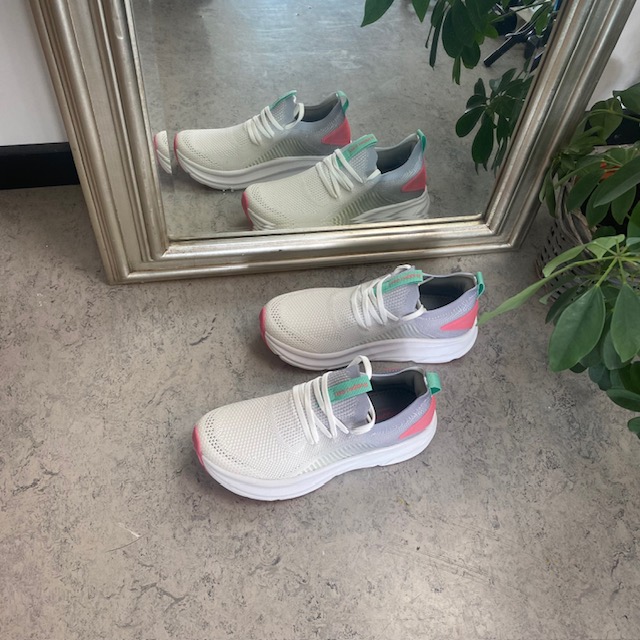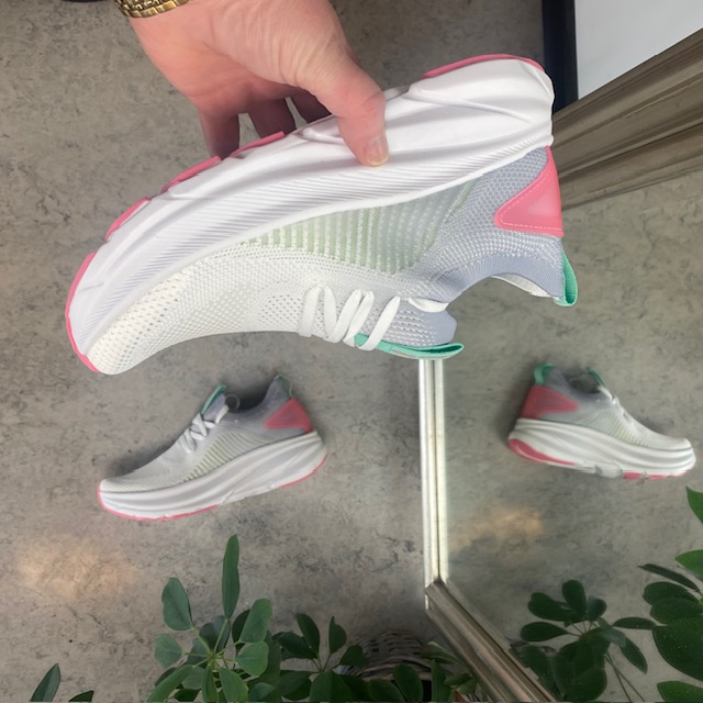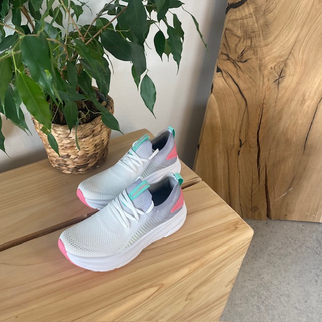 Grå/hvid sko med overdel i strikket mesh som sikre at dine fødder kan ånde. Skoen har elastisk slip on åbning og pynte snøre. Åbningen er ekstra foret, hvilket gør at skoen sidder godt fast om hælen. Indersålen er en blød skumsål. Mellemsålen har masser af stødabsorbering. Ydersålen har groft mønster som sikre et godt greb i underlaget. Skoen kommer i størrelse 36 – 41