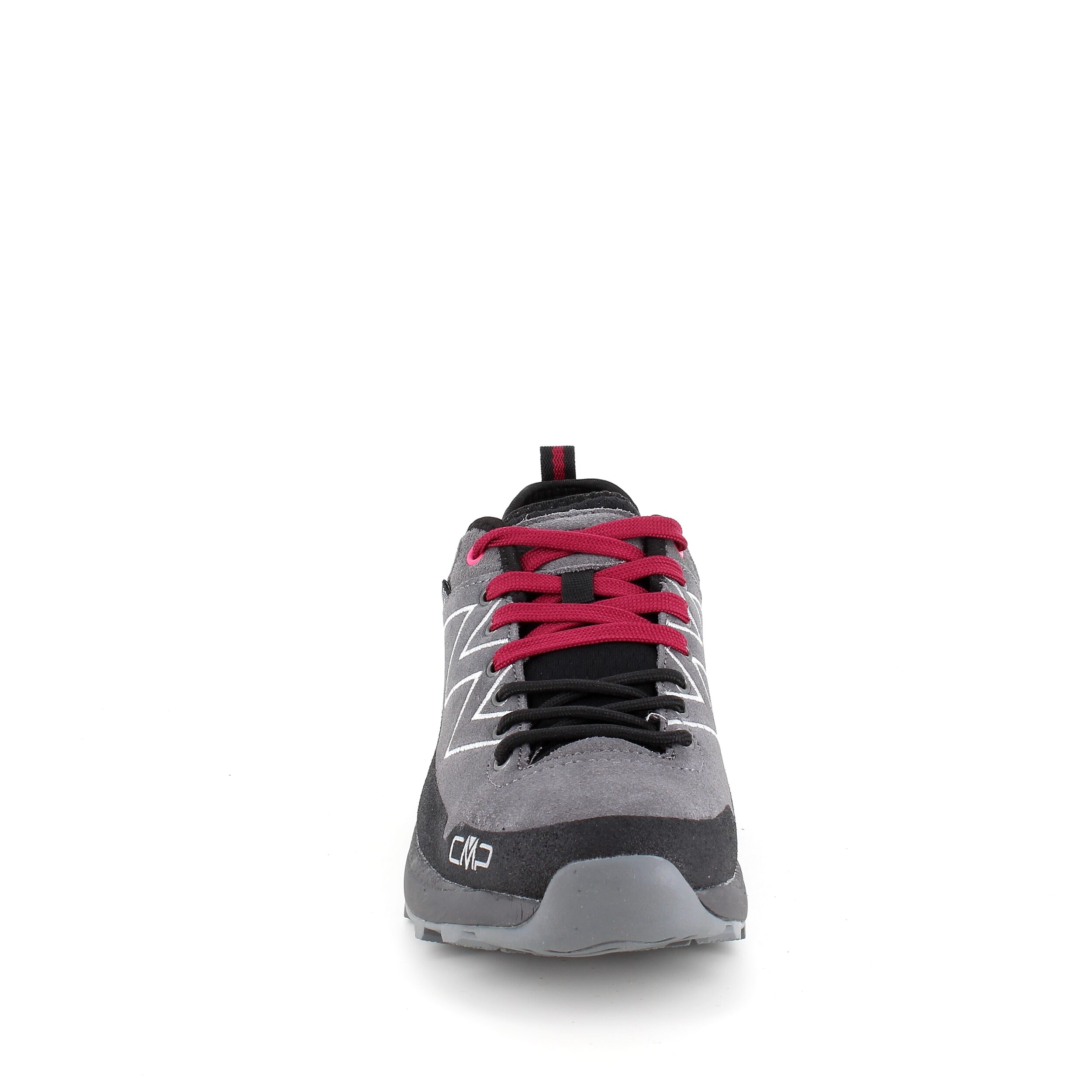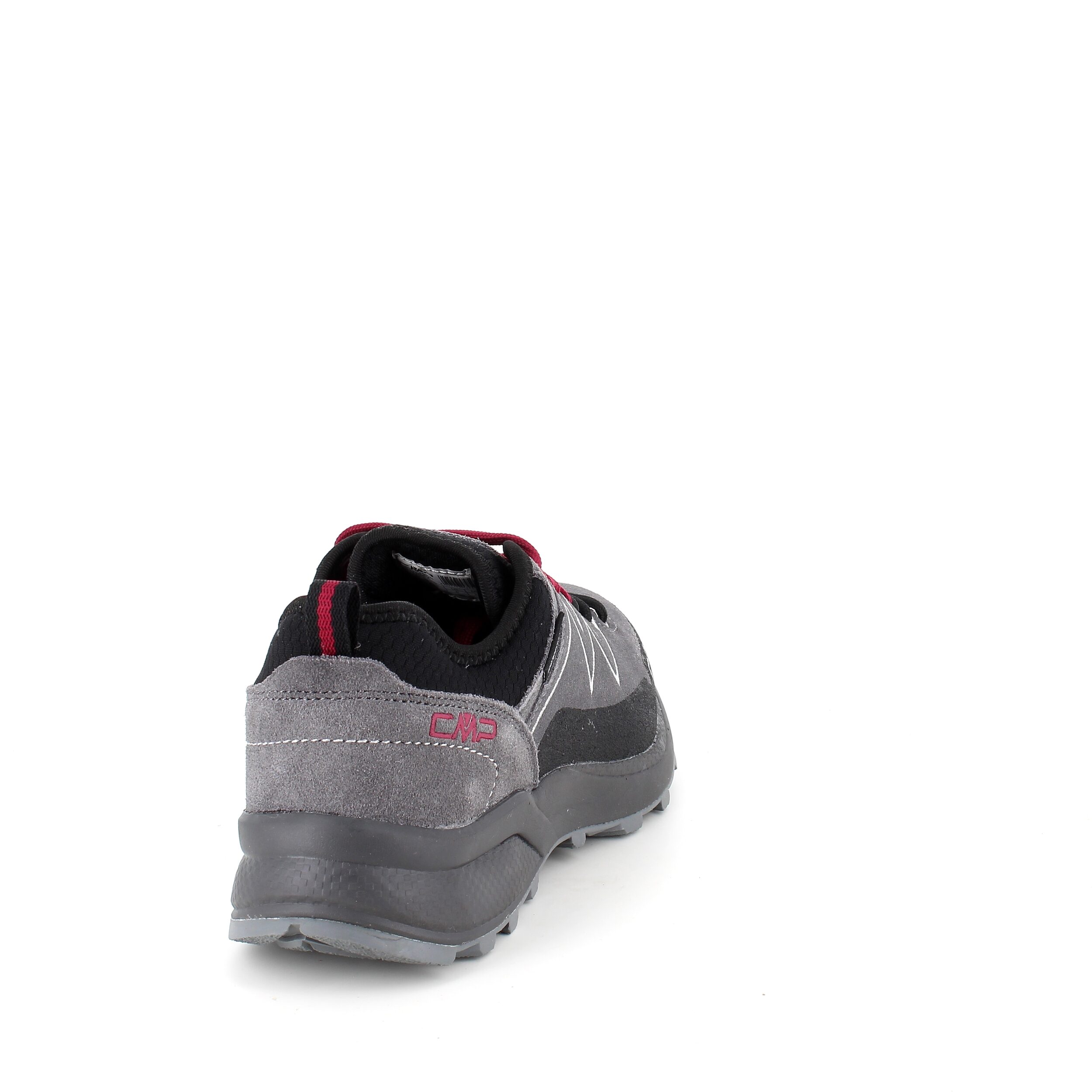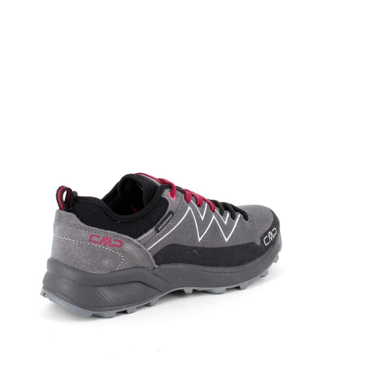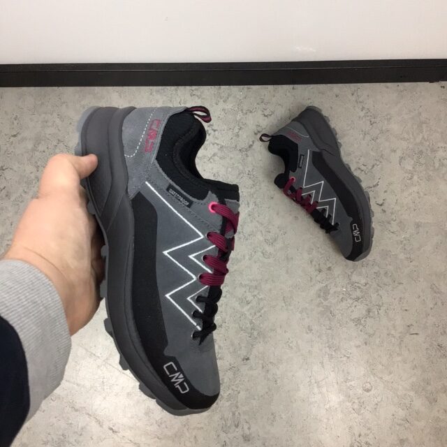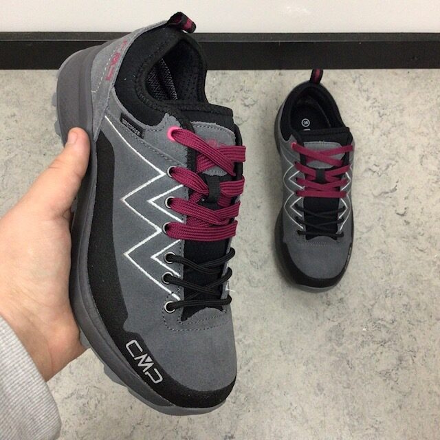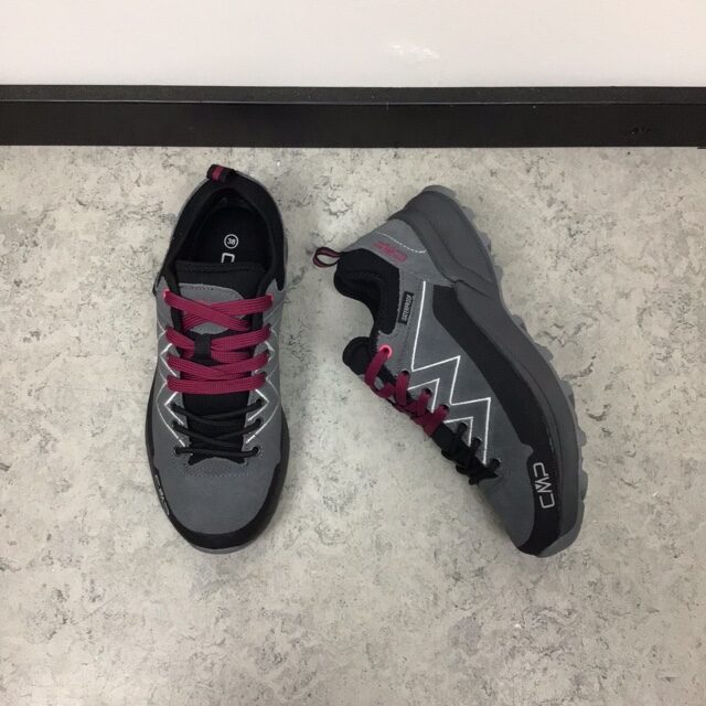 Vandreskoen er i grå med sorte og bordeaux detaljer