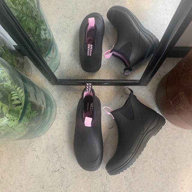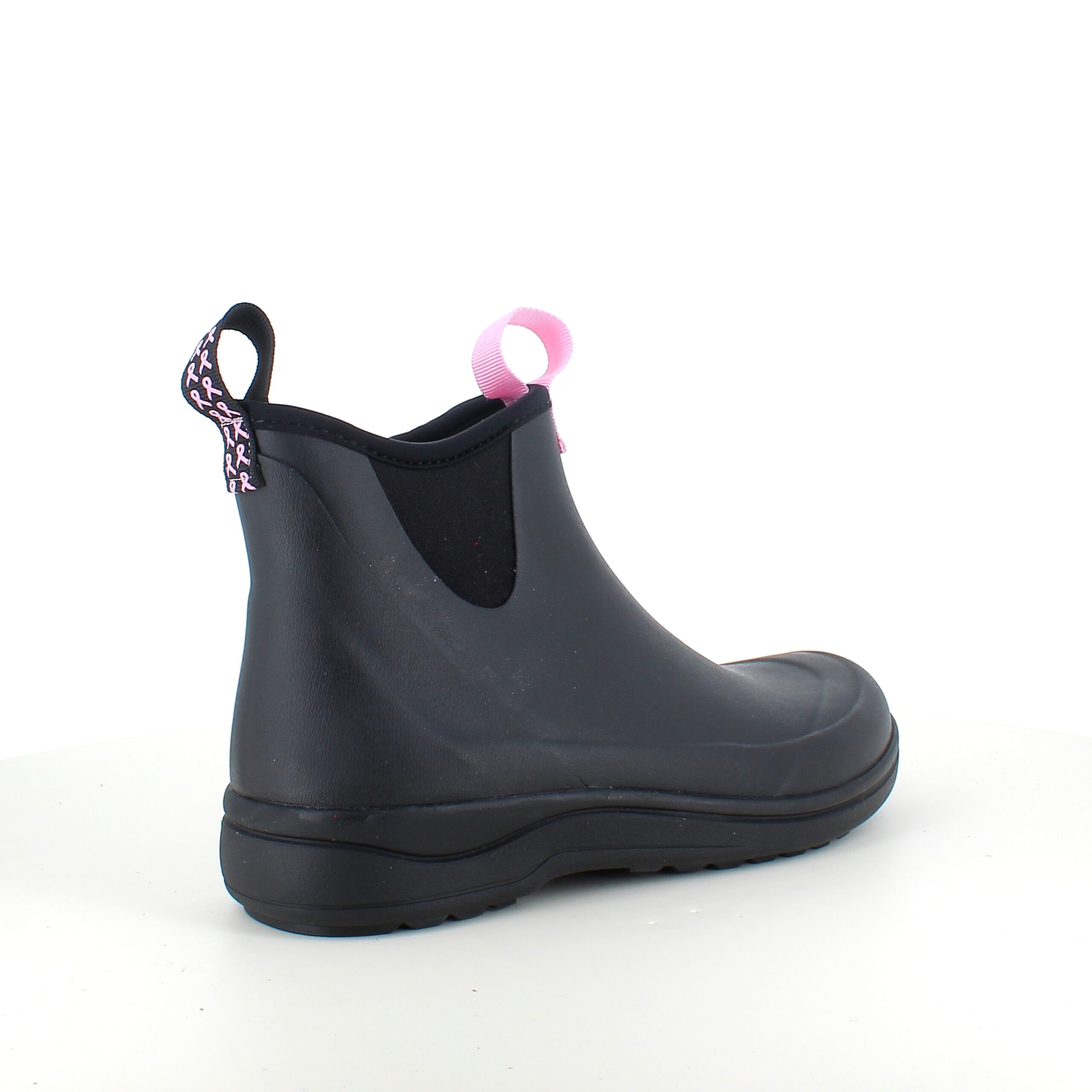 Oplev vores sorte gummistøvler, skabt med omtanke og i samarbejde med Støt Brysterne, hvor den genkendelige lyserøde farve elegant fremhæves i bunden af støvlen samt i den dekorative sløjfe, der pryder den ene strop.