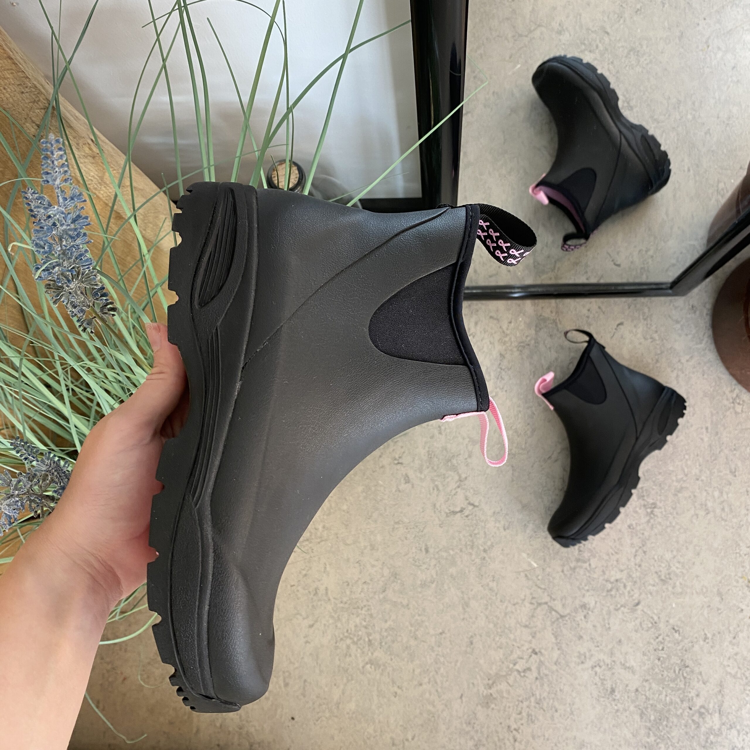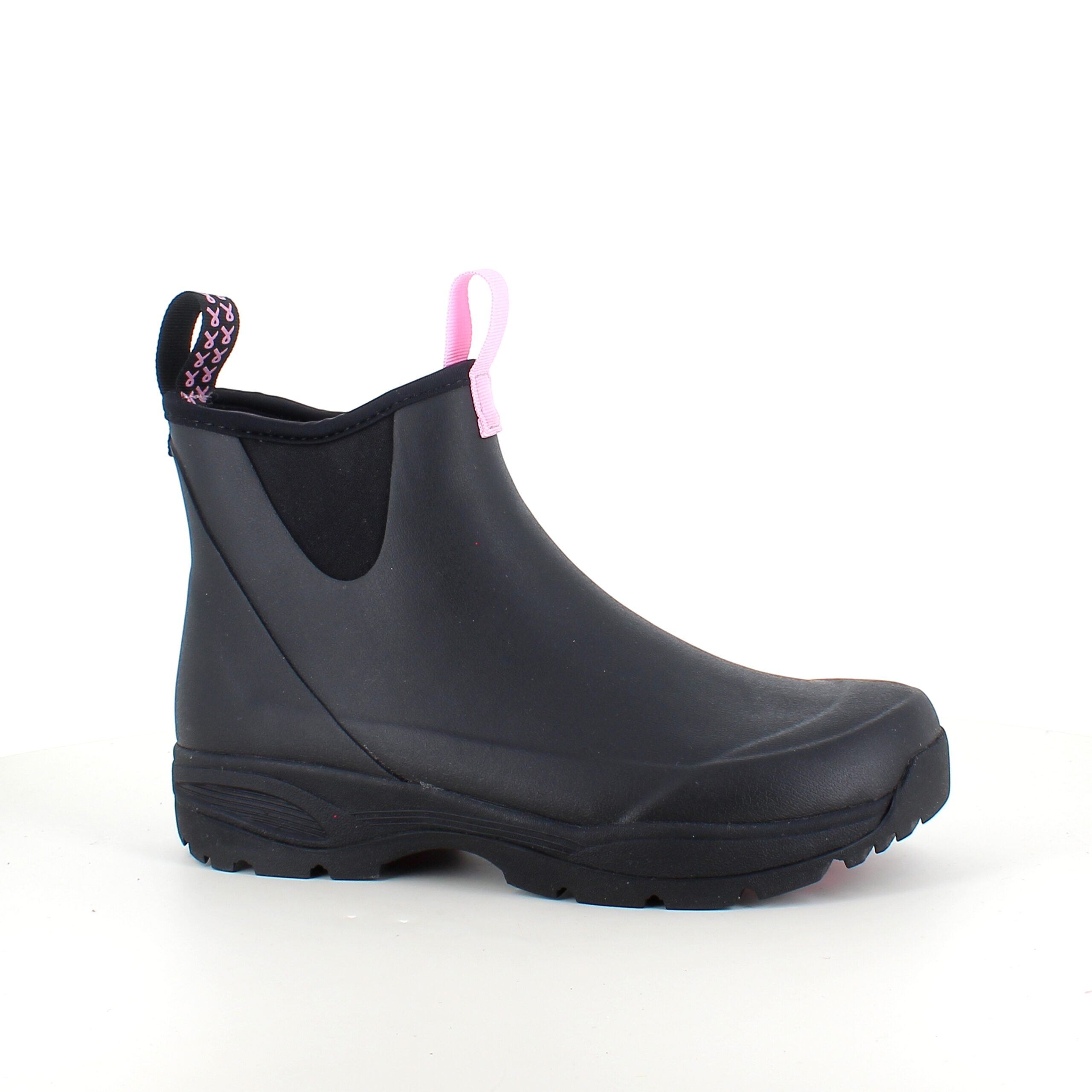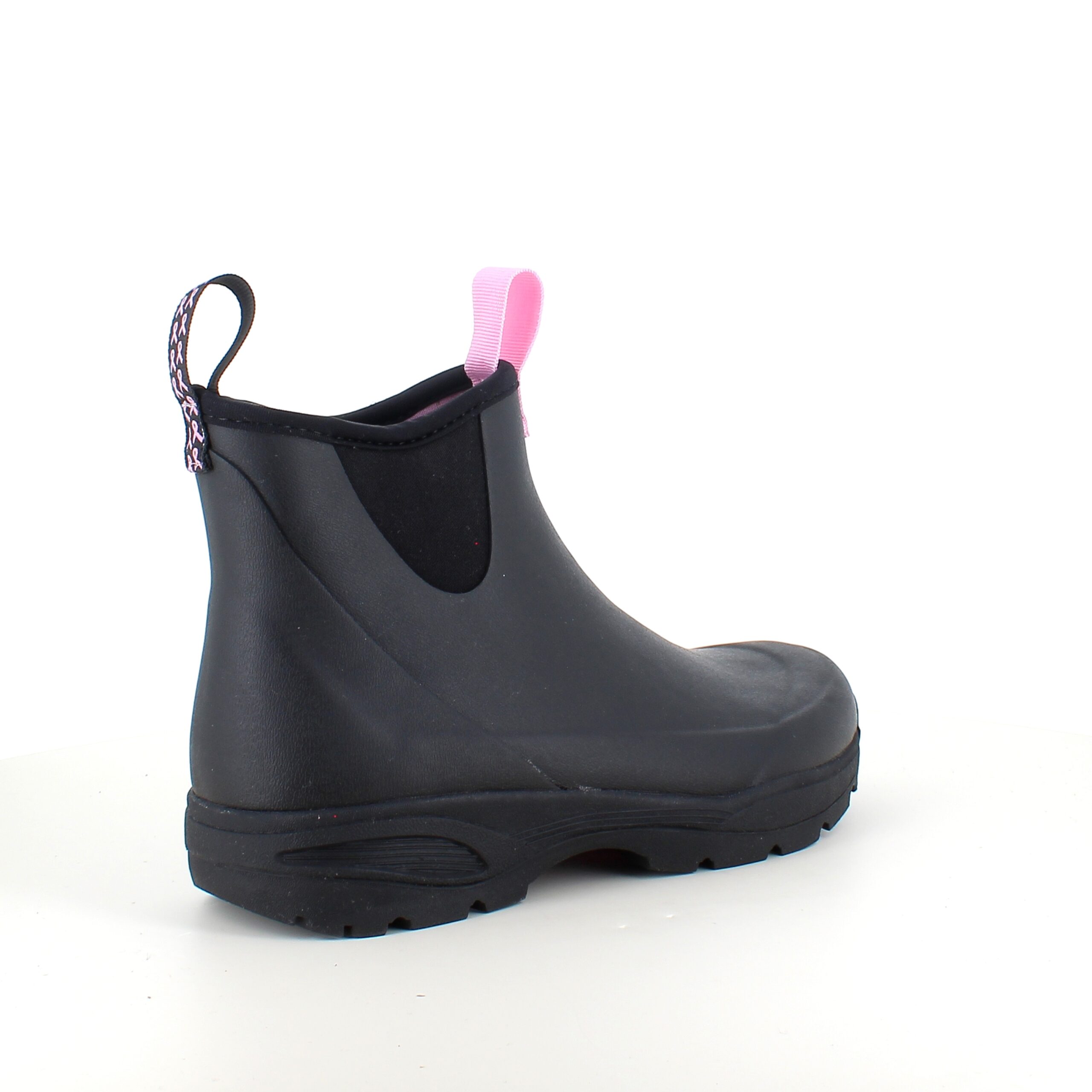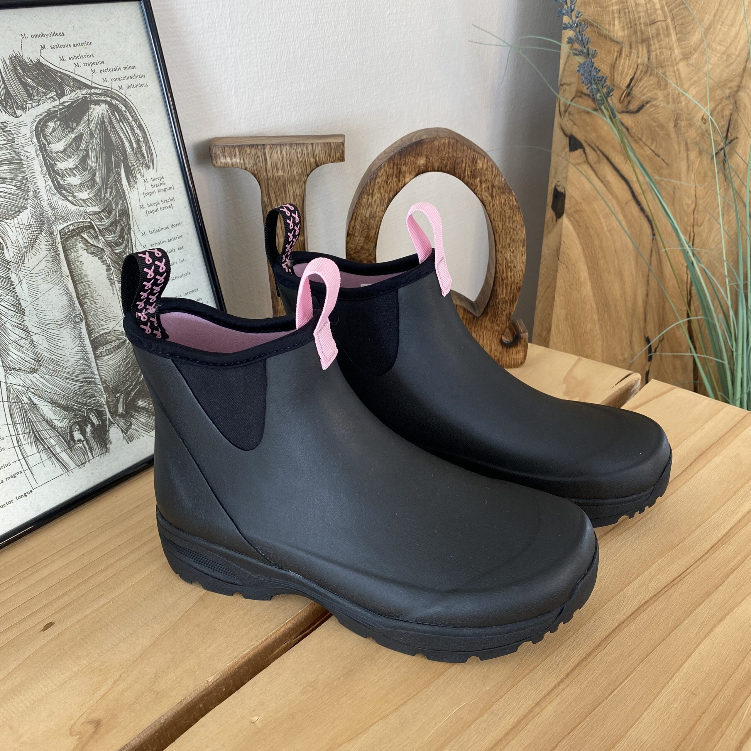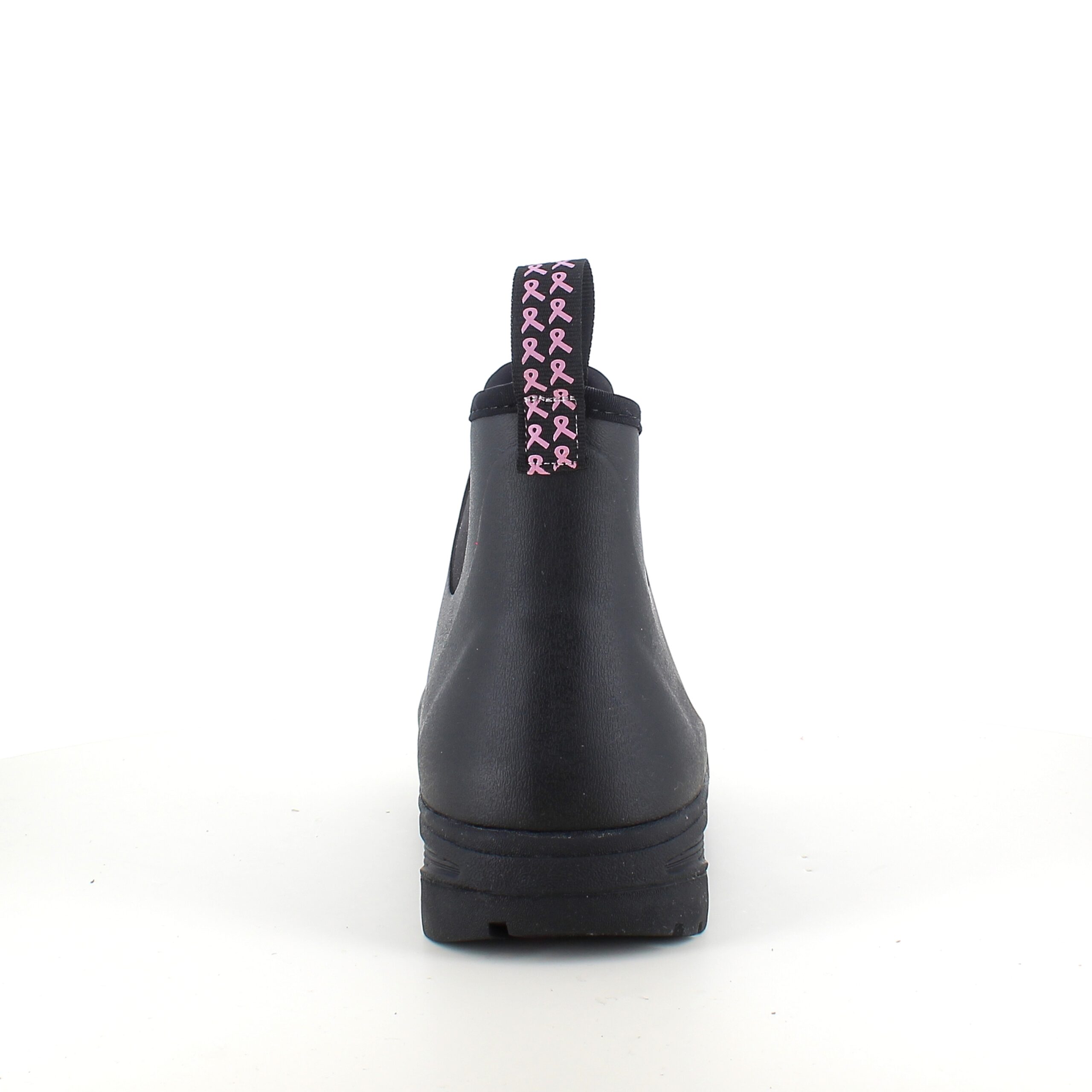 Oplev vores sorte gummistøvler, skabt med omtanke og i samarbejde med Støt Brysterne, hvor den genkendelige lyserøde farve elegant fremhæves i bunden af støvlen samt i den dekorative sløjfe, der pryder den ene strop.