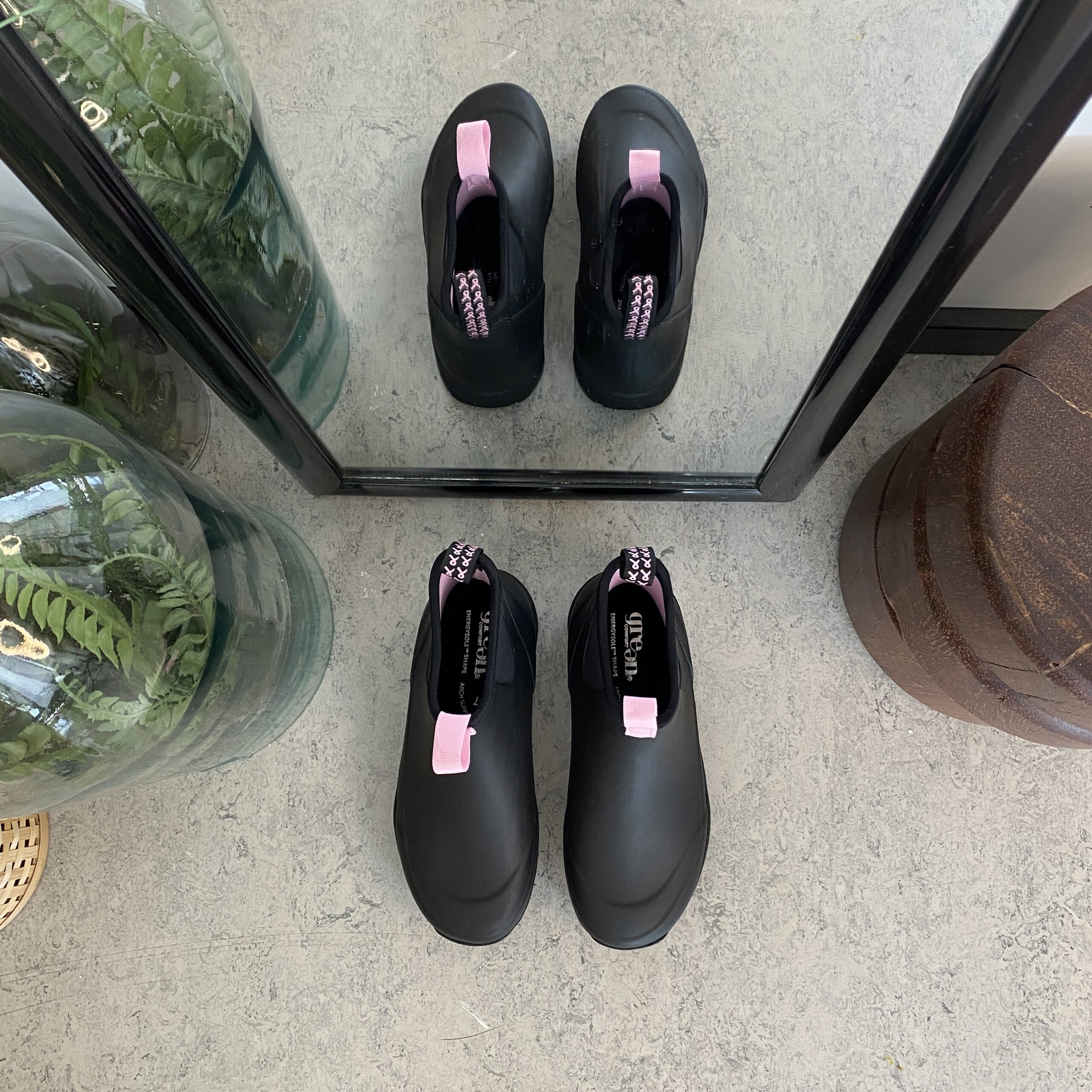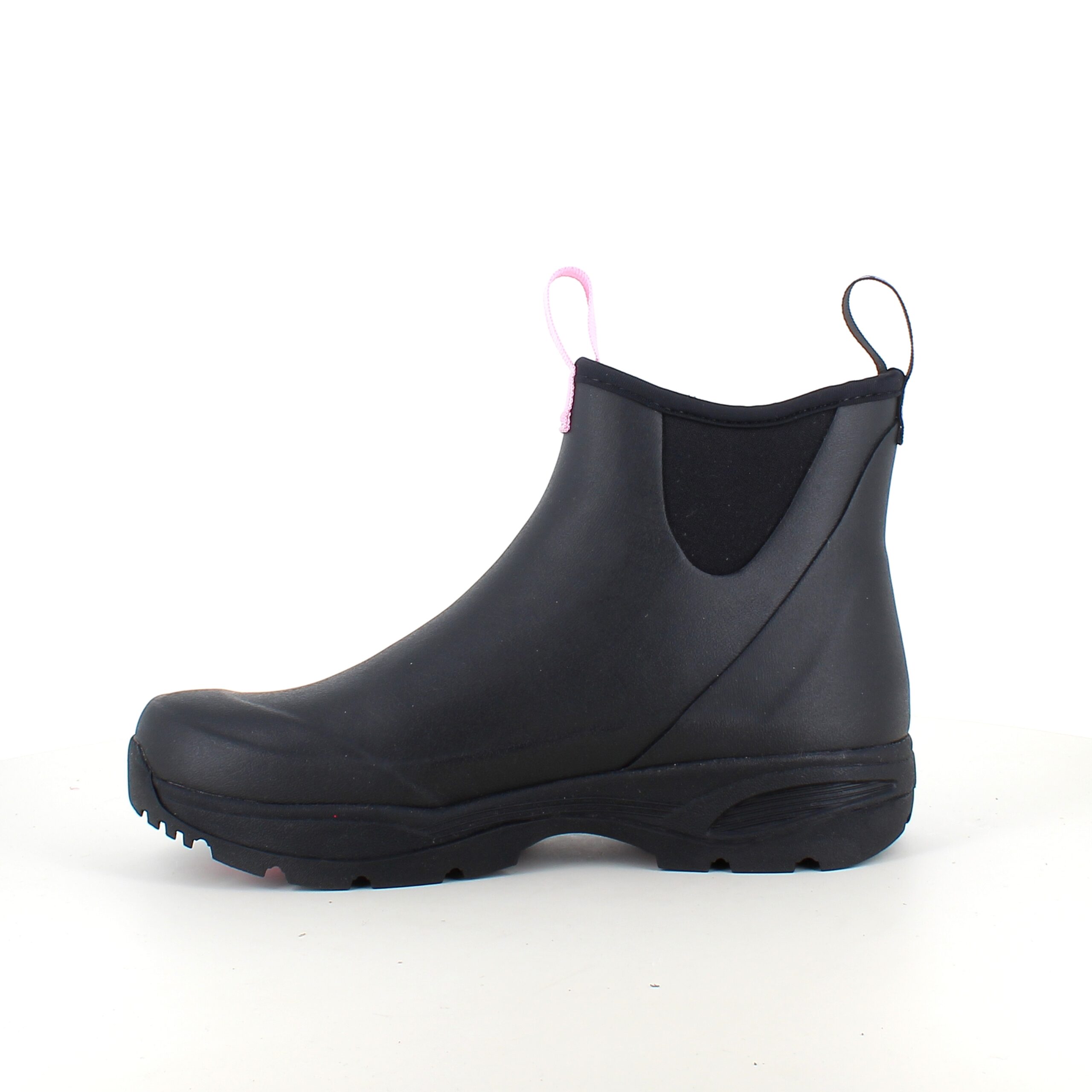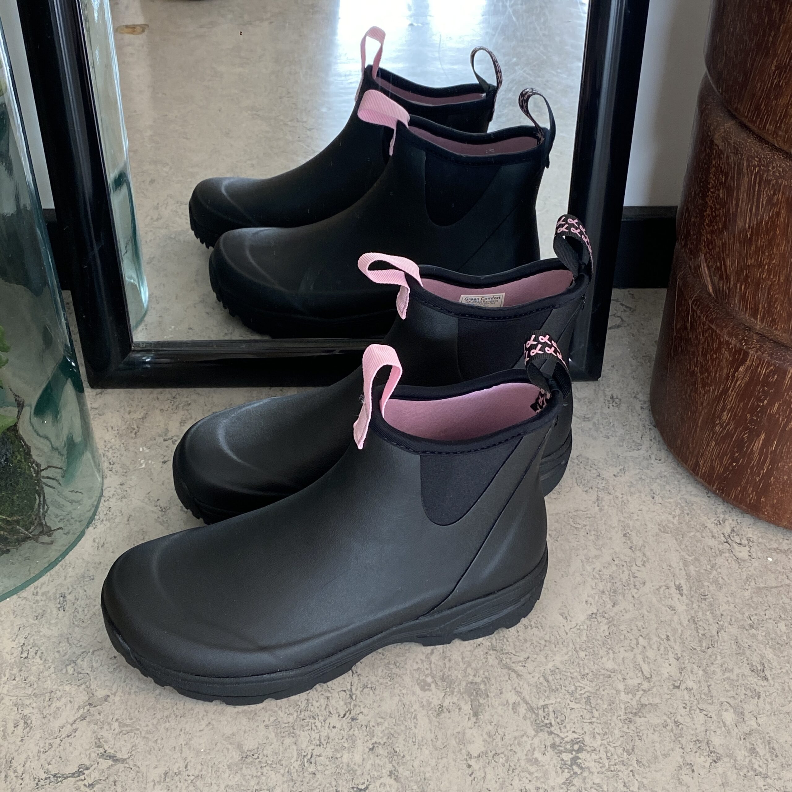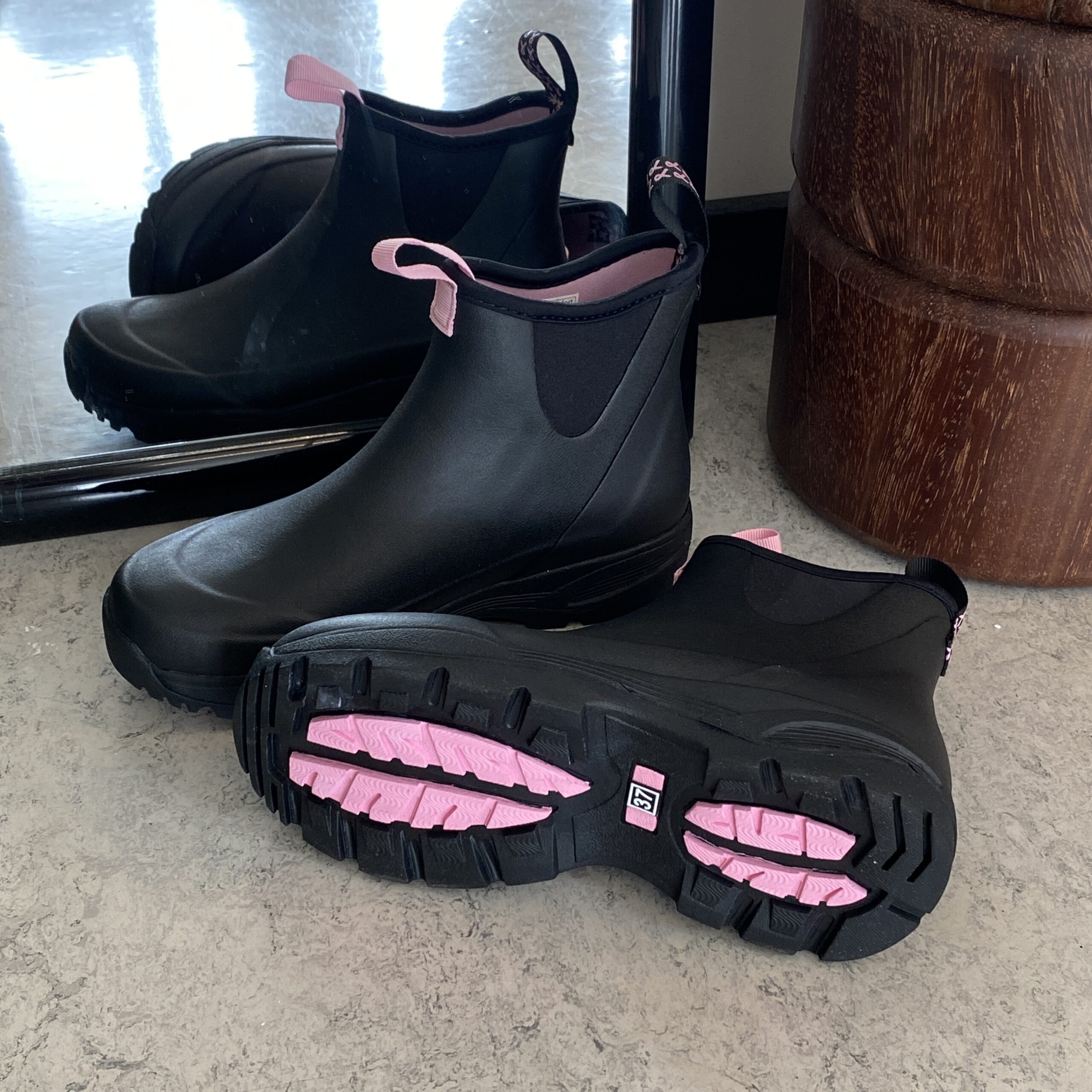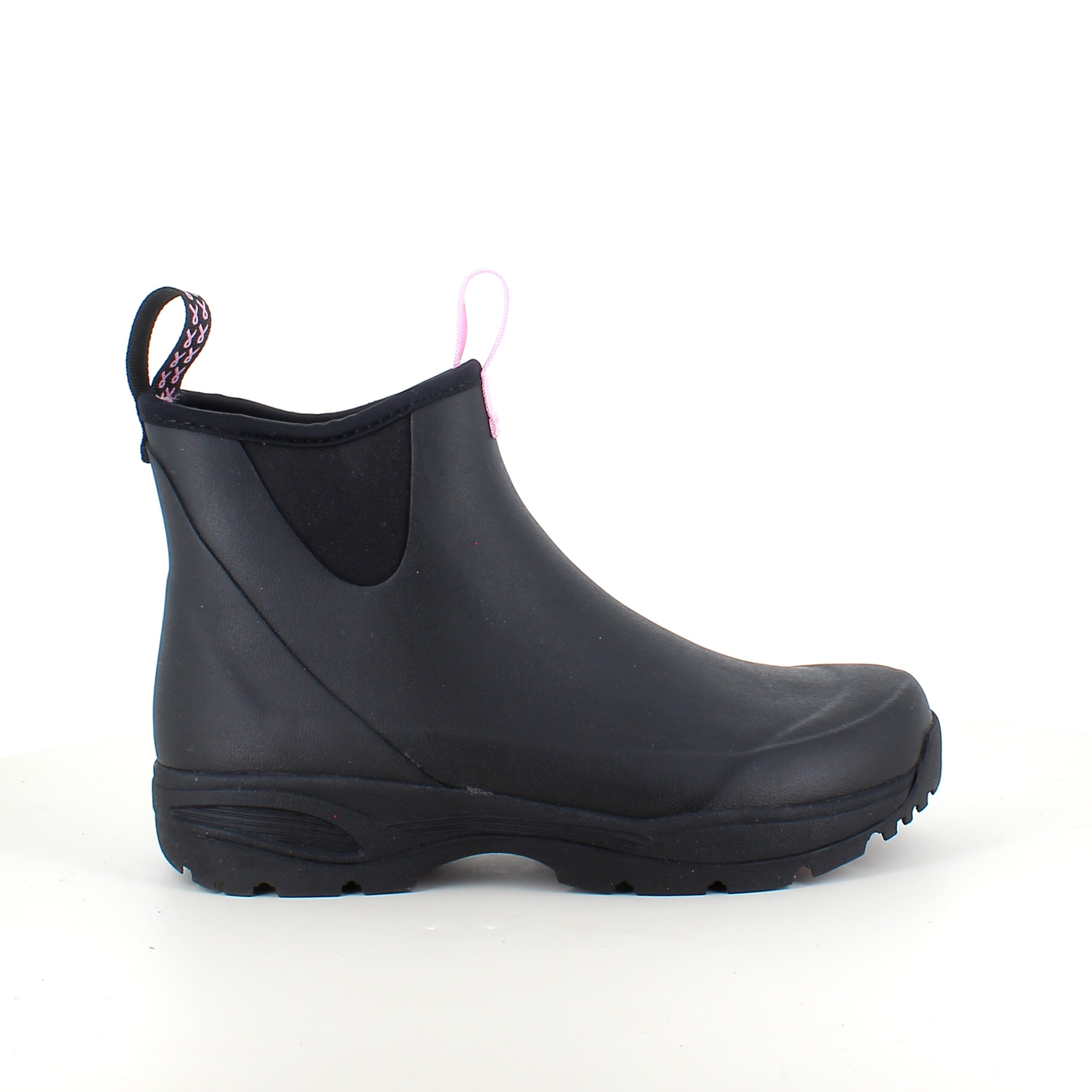 Oplev vores sorte gummistøvler, skabt med omtanke og i samarbejde med Støt Brysterne, hvor den genkendelige lyserøde farve elegant fremhæves i bunden af støvlen samt i den dekorative sløjfe, der pryder den ene strop.