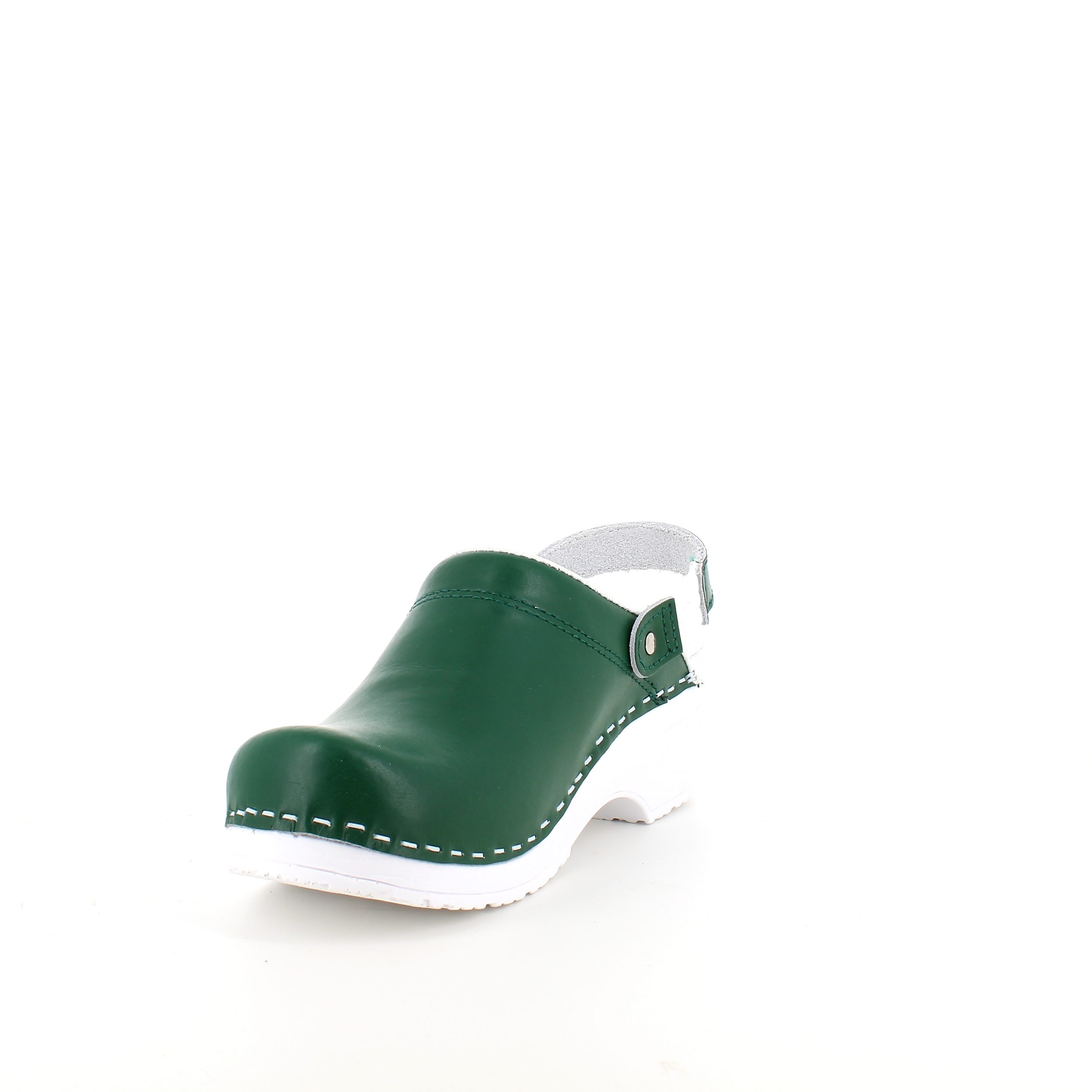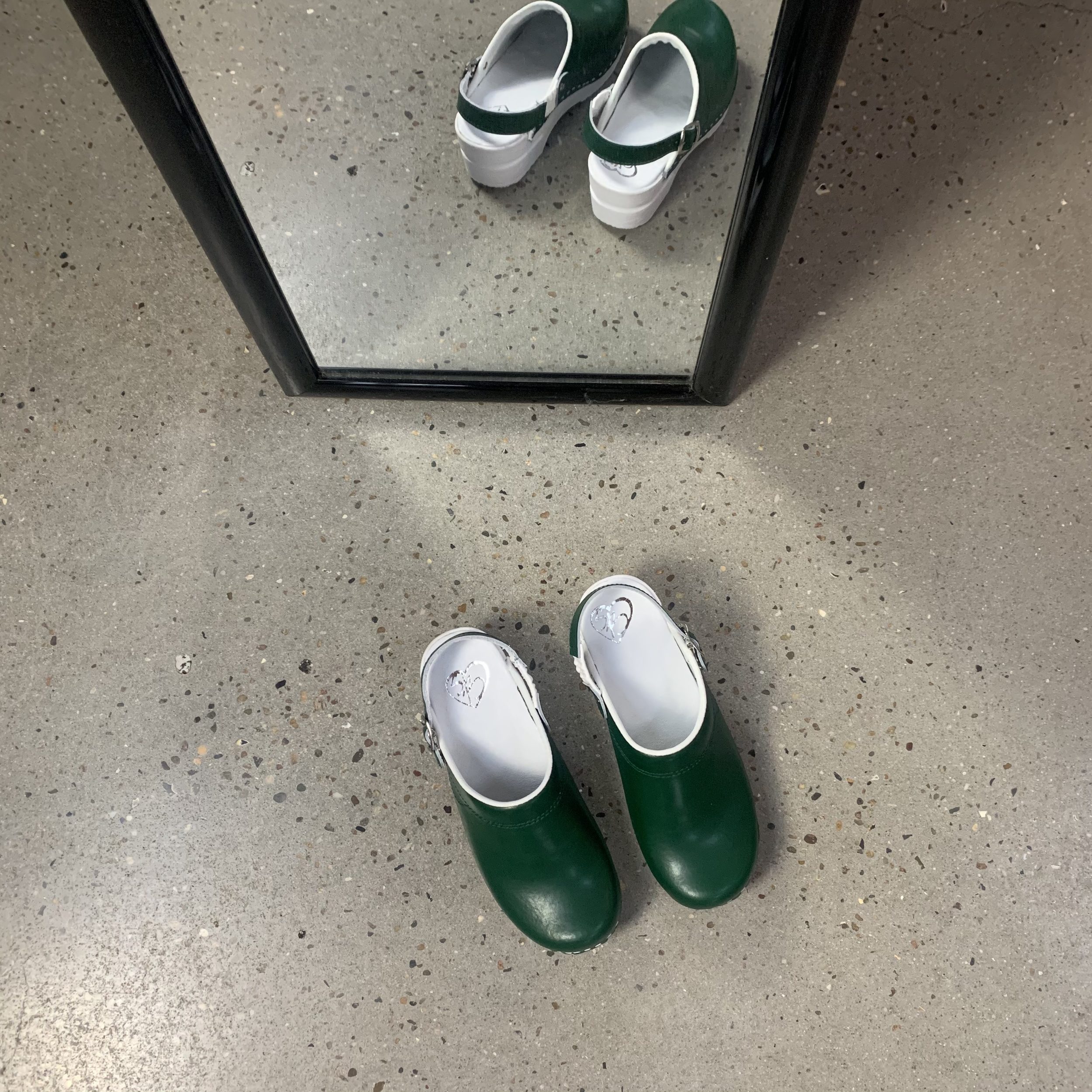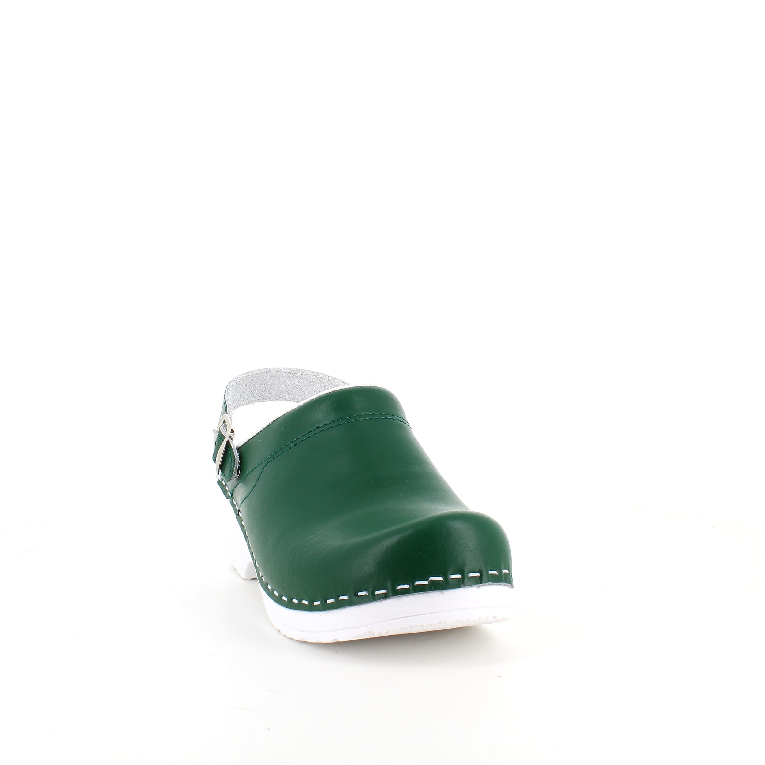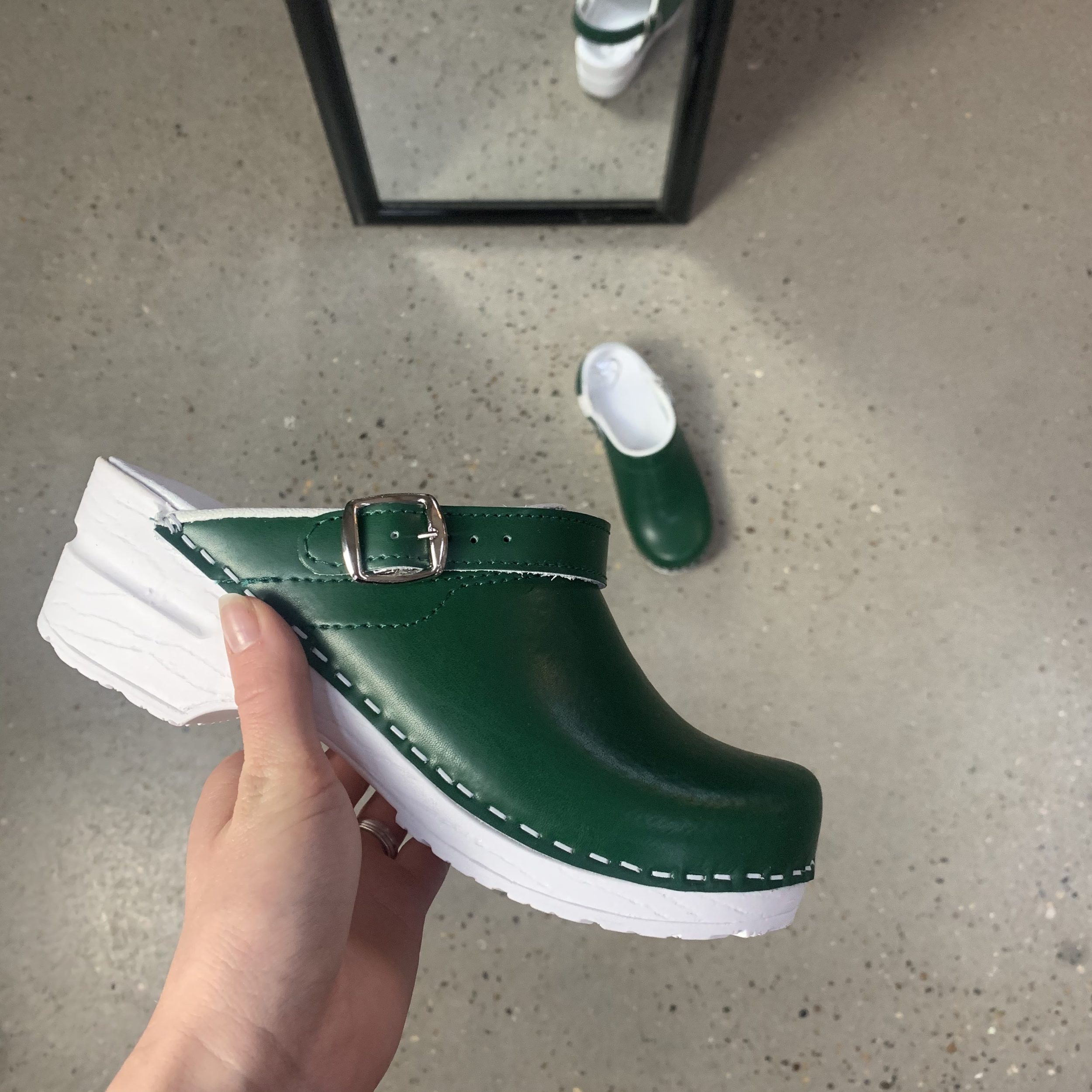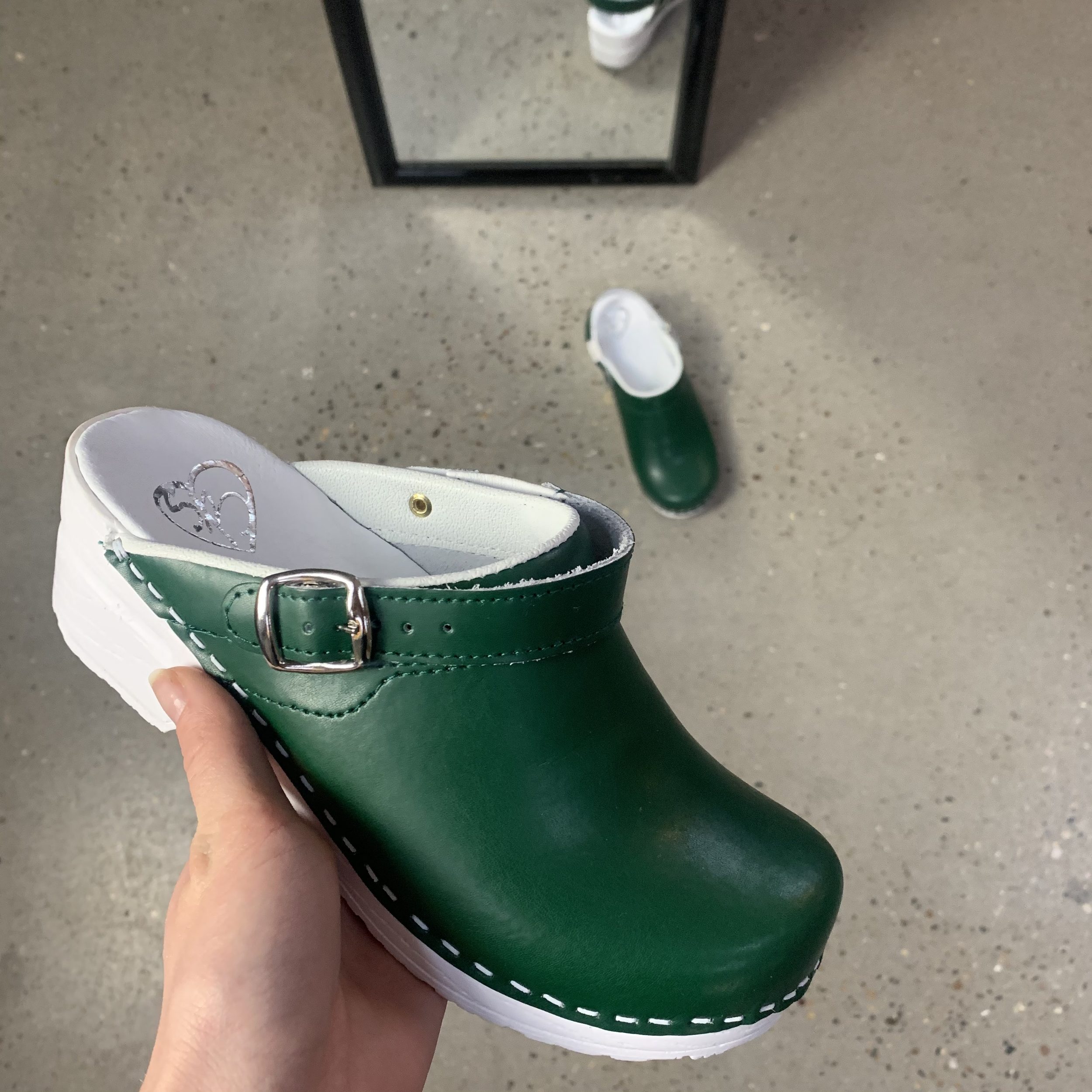 Skindtræsko i grøn med bagrem. Så den kan bruges med eller uden rem.