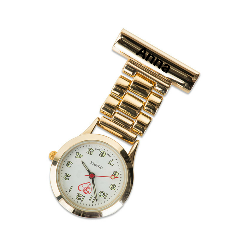 Bredt sygeplejeur i stål som er 6 cm langt og 3,5 cm bredt. Uret fås både i guld og stål.