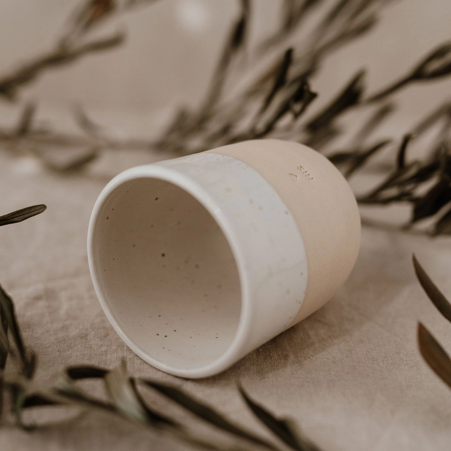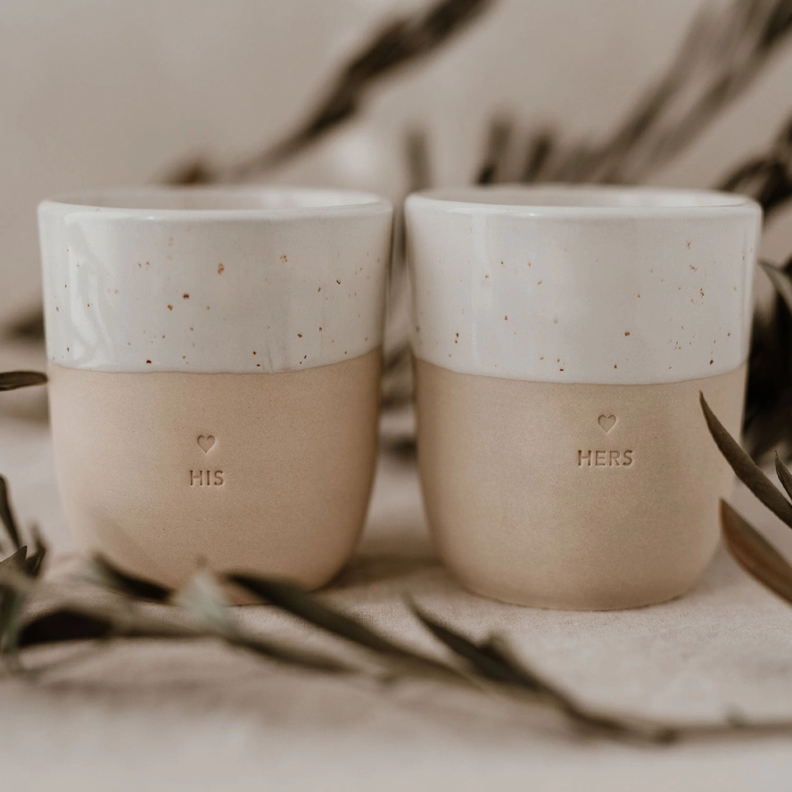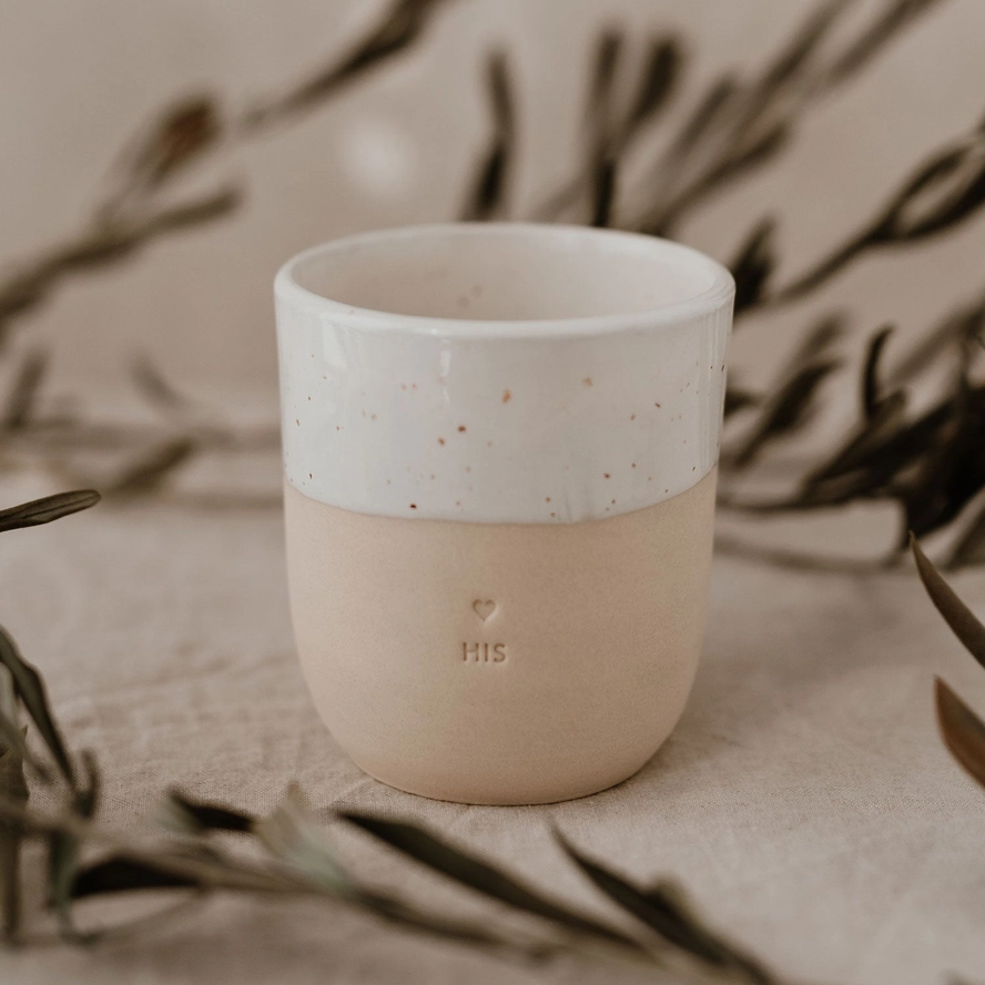 Dette stilrene keramik krus er designet i et nordisk og minimalistisk udtryk med en naturlig beige bund og en glaseret hvid top med små rustikke prikker. Som en personlig detalje er der indgraveret et lille hjerte samt teksten His, hvilket gør koppen ideel som en kærlig gave til ham, du holder af.