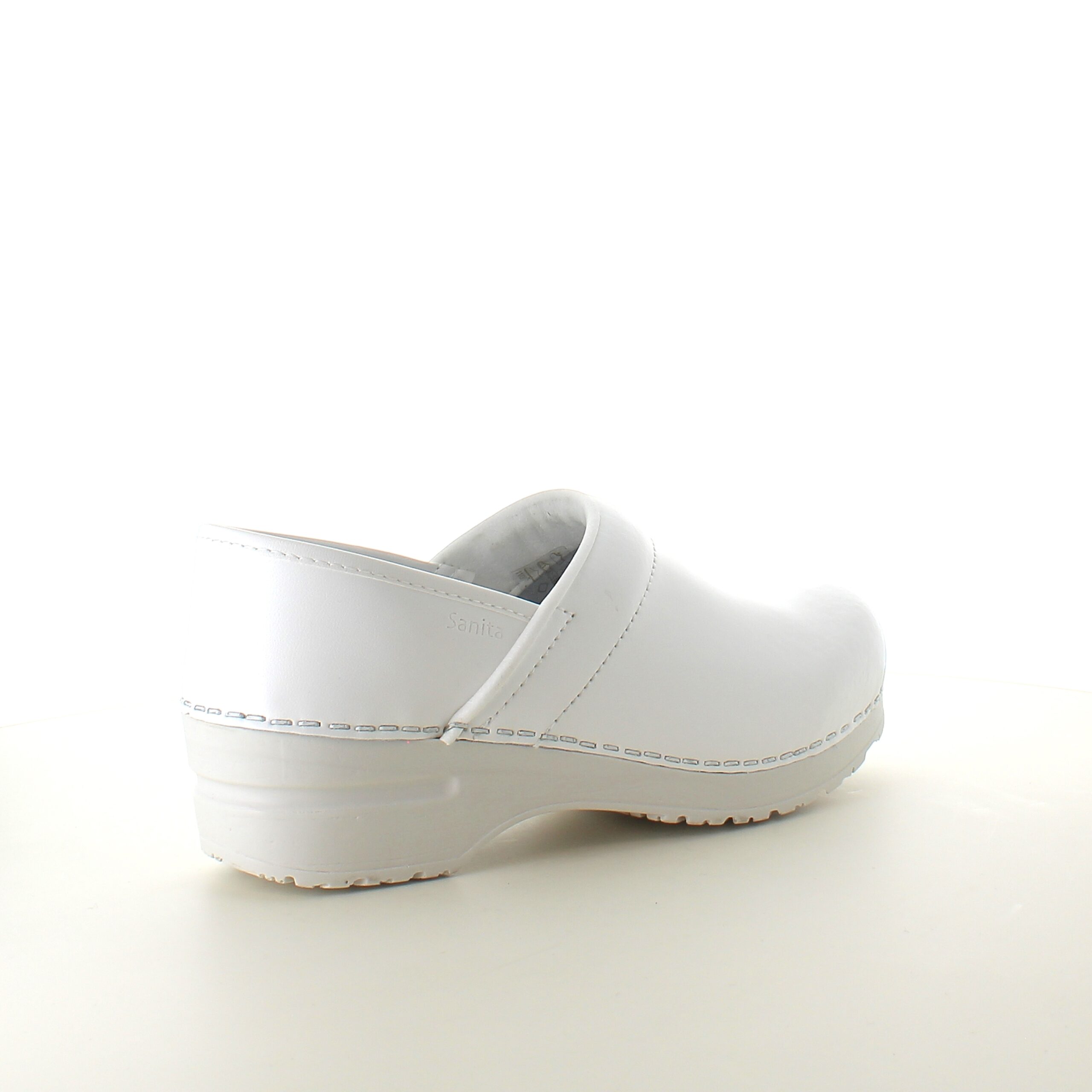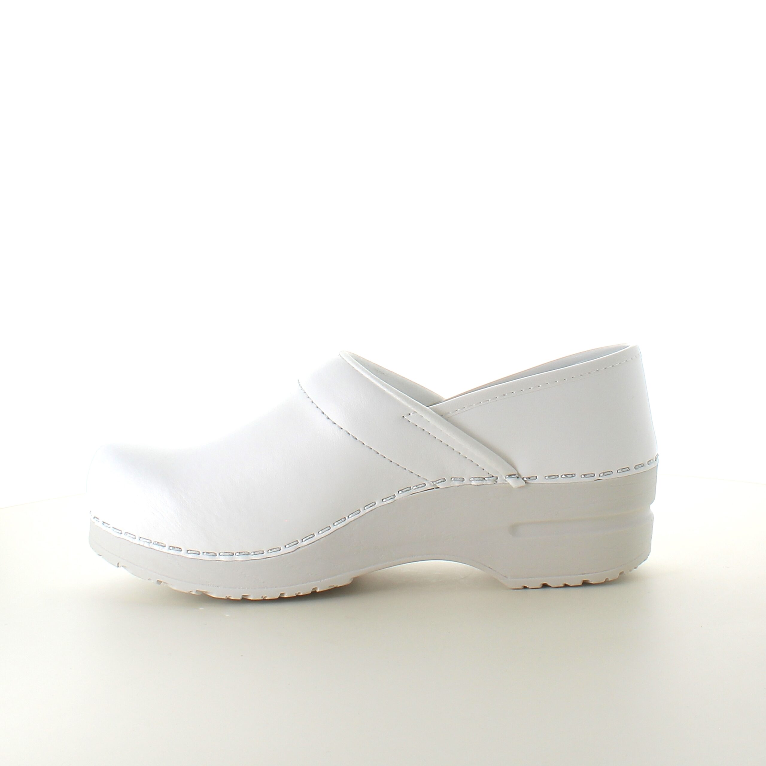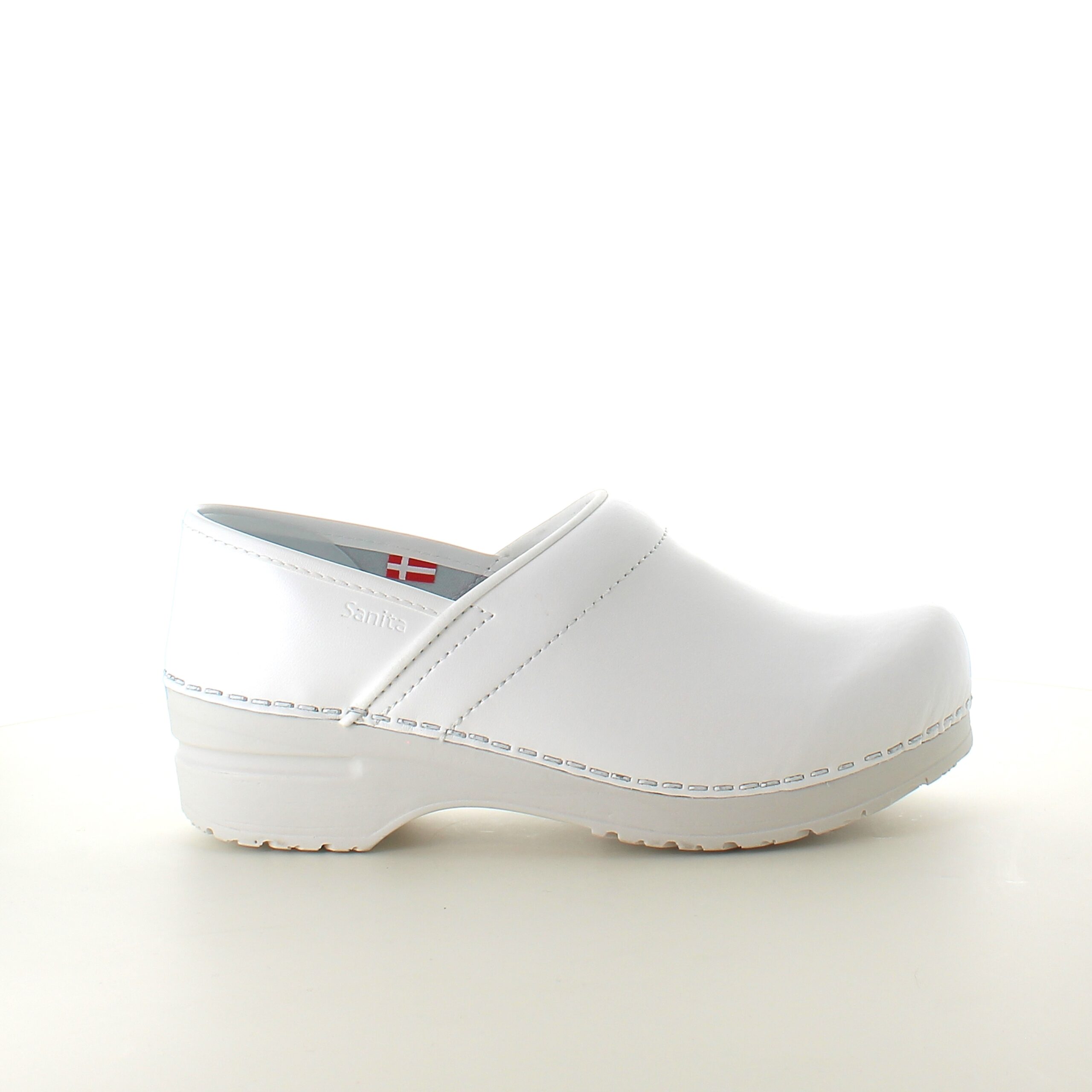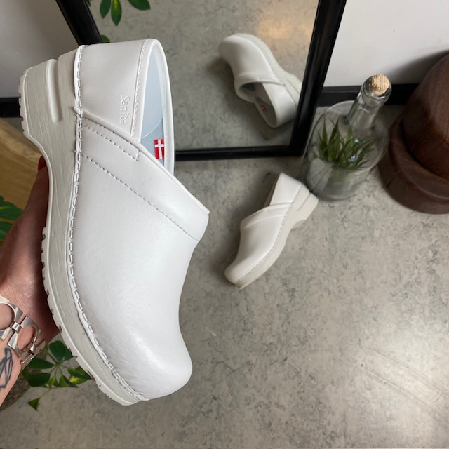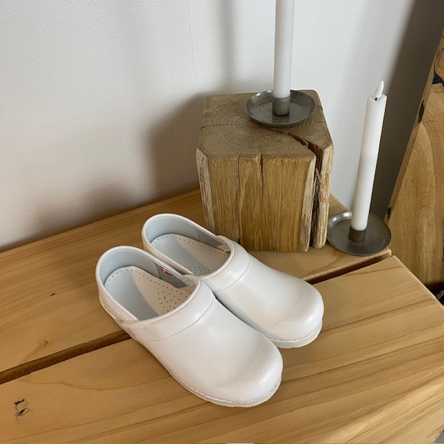 Hvid fleksibel Sanita-træsko med hælkappe.