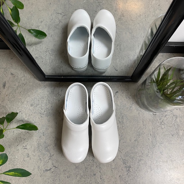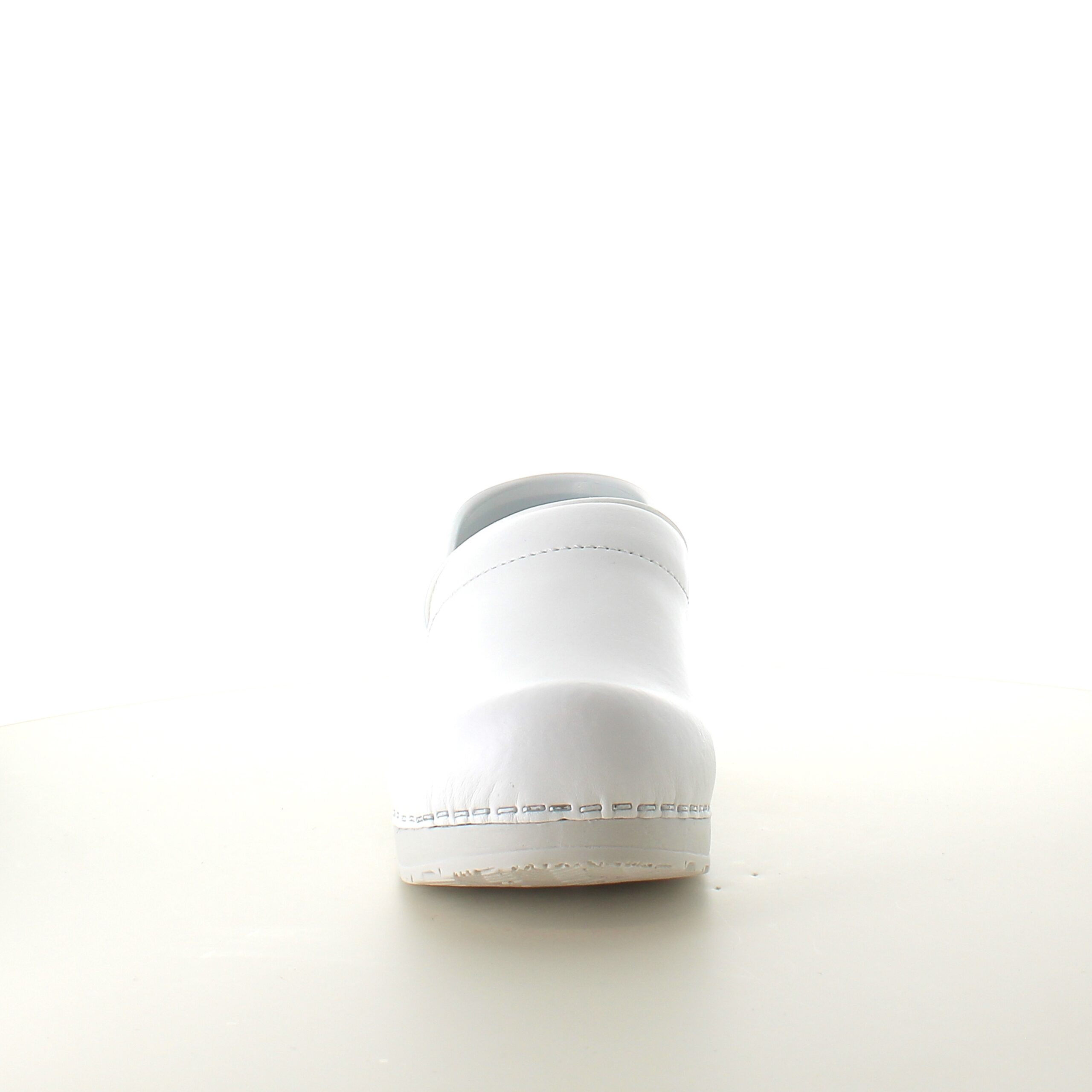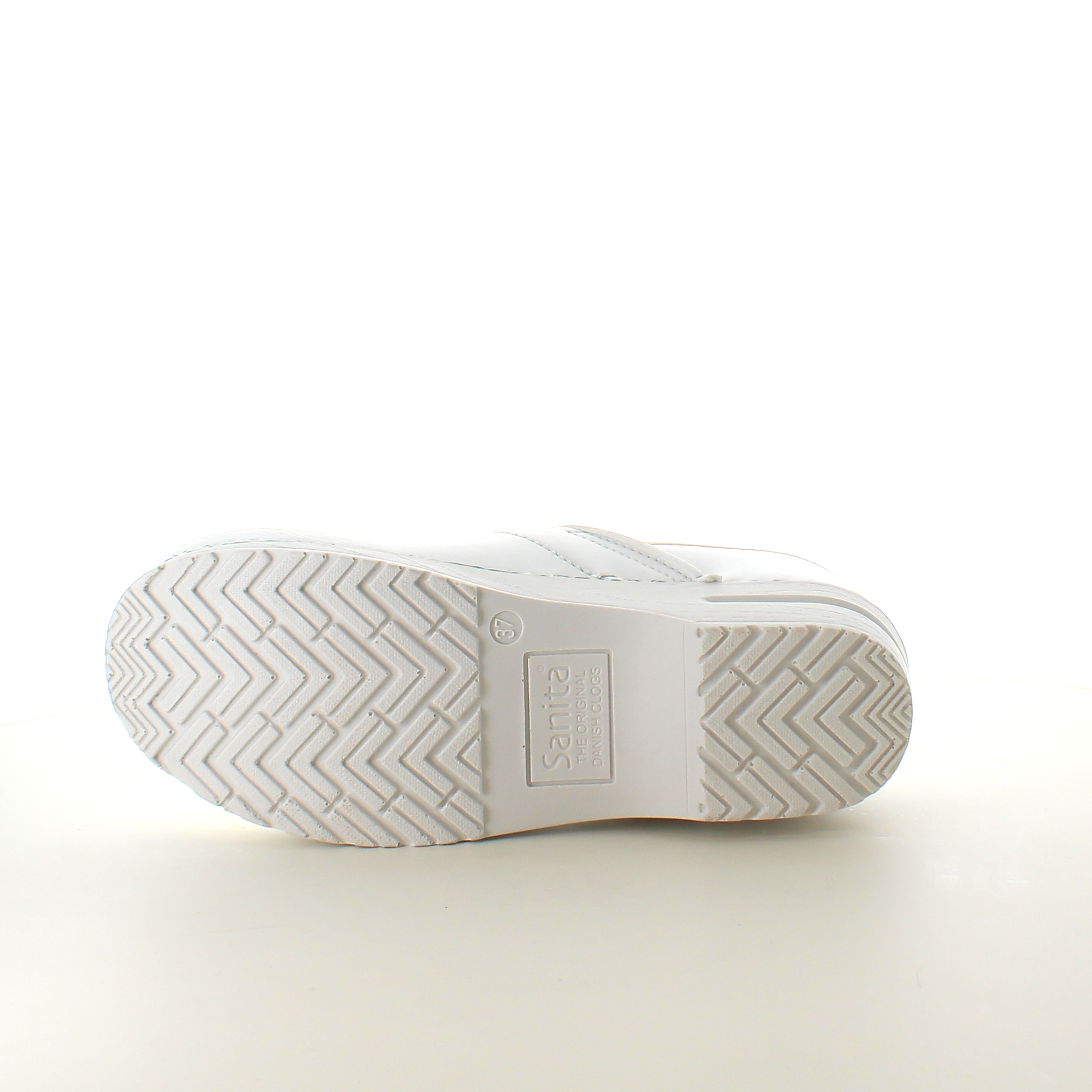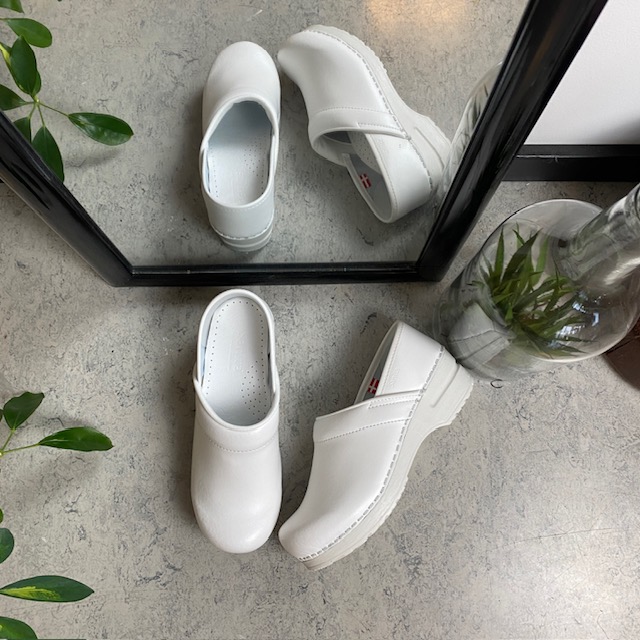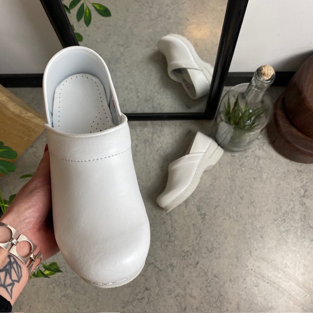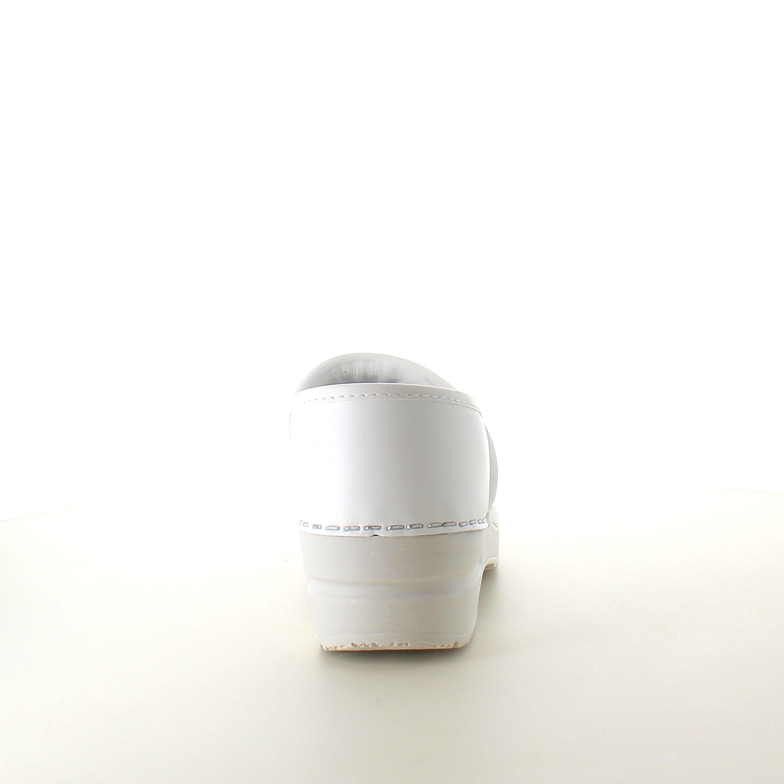 Hvid fleksibel Sanita-træsko med hælkappe.