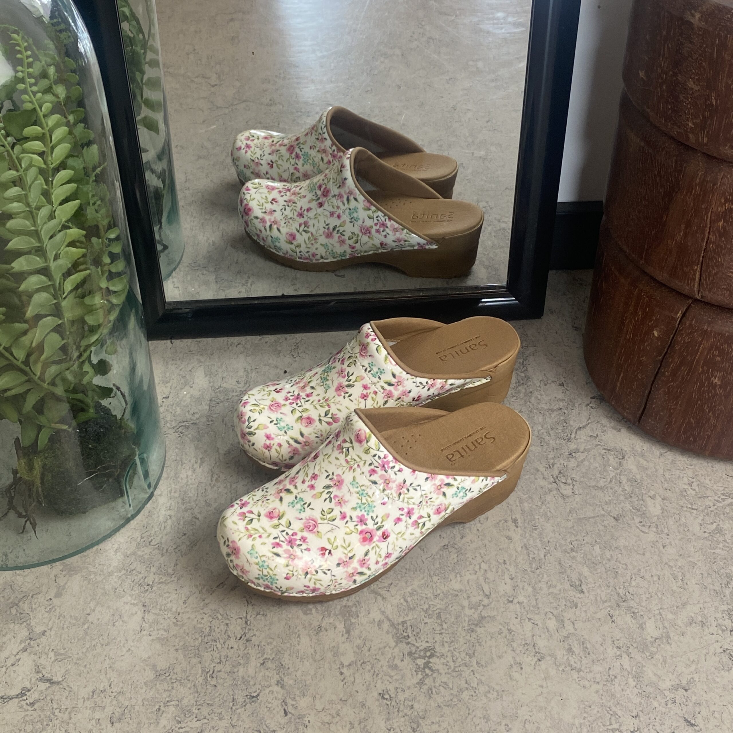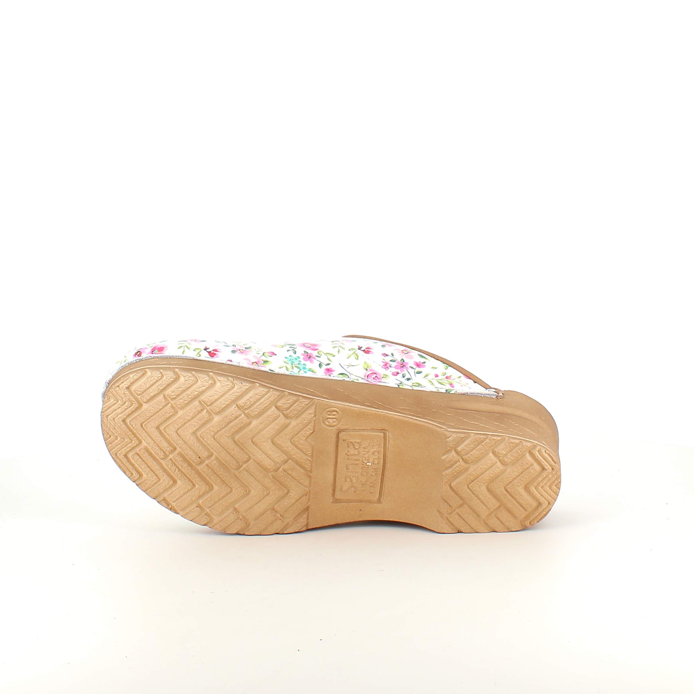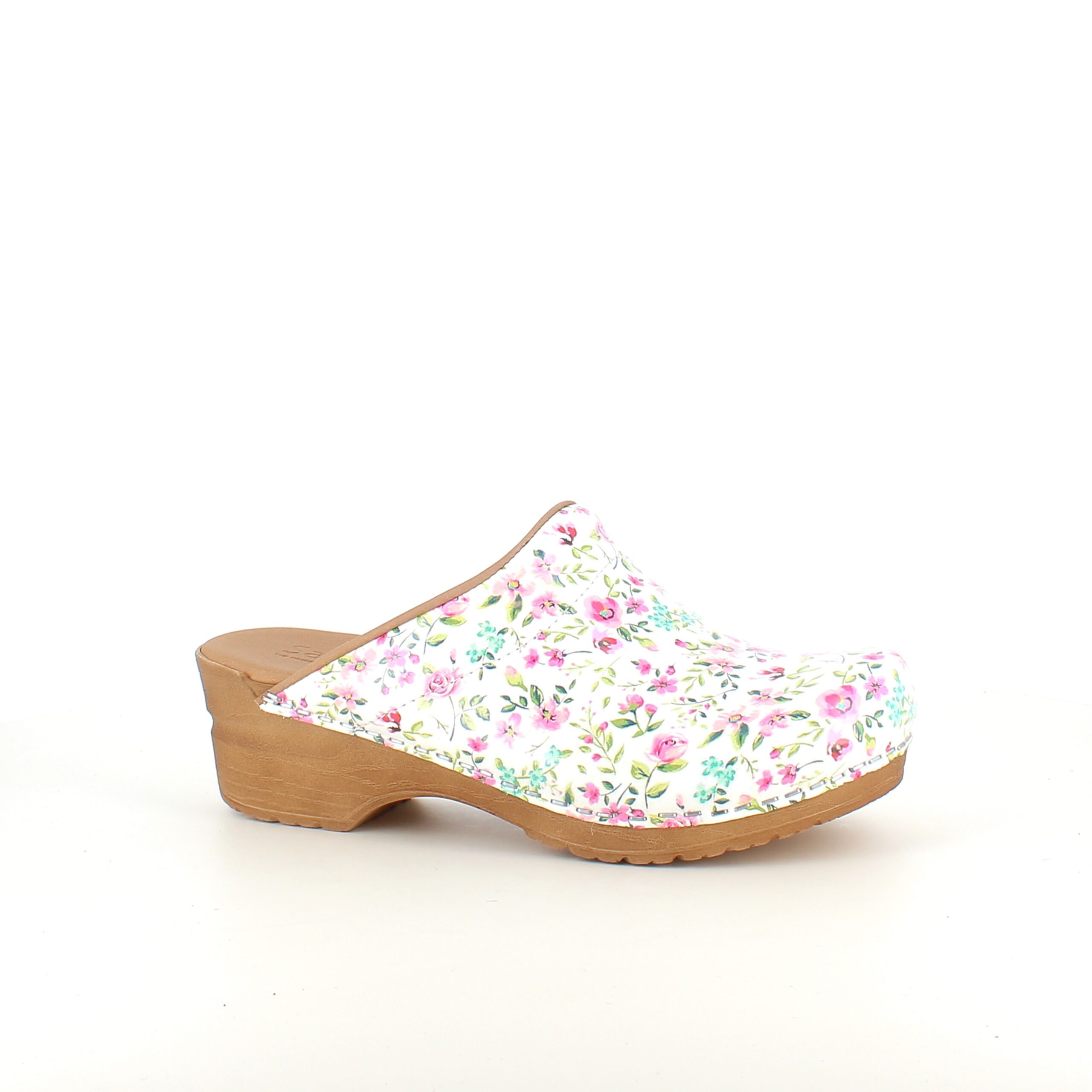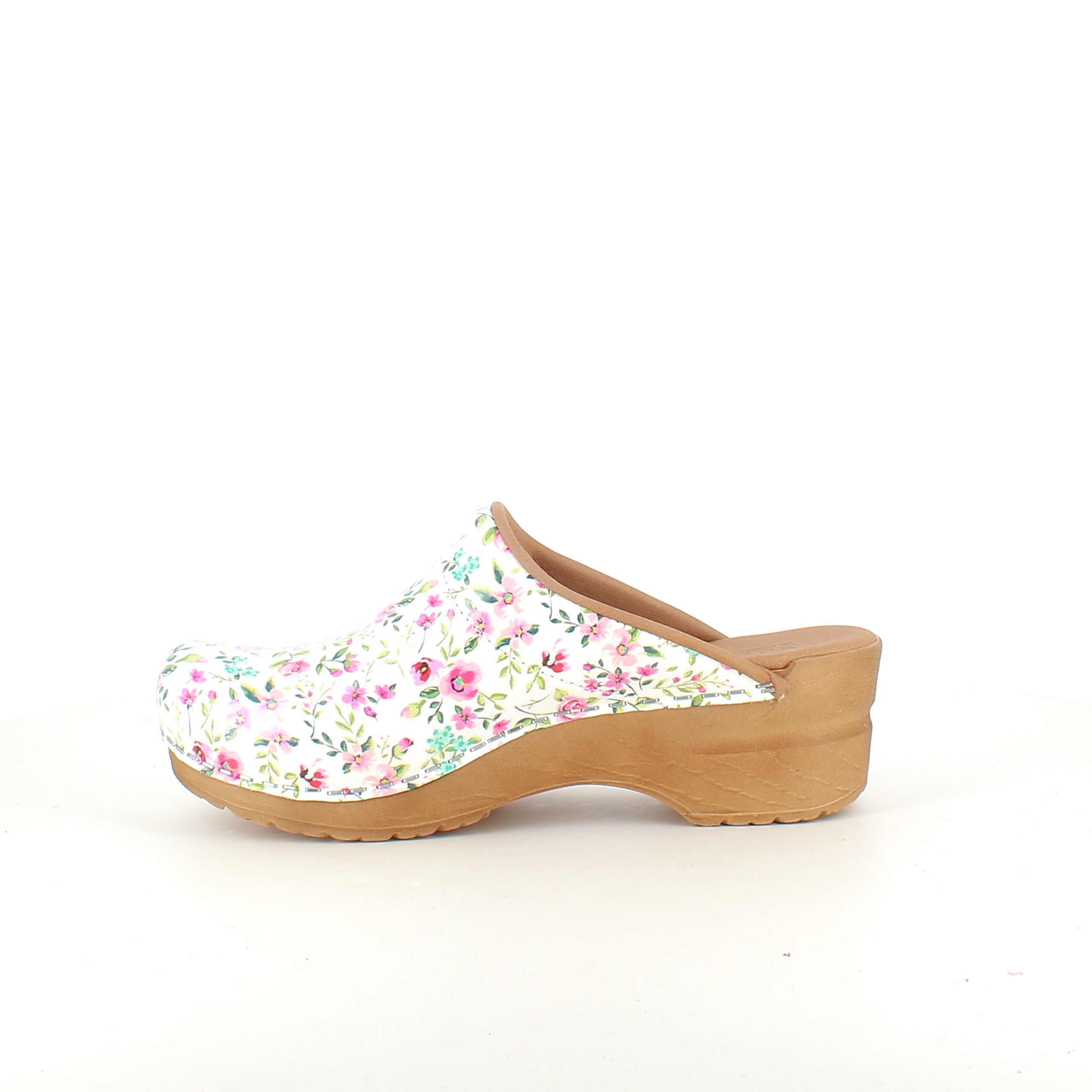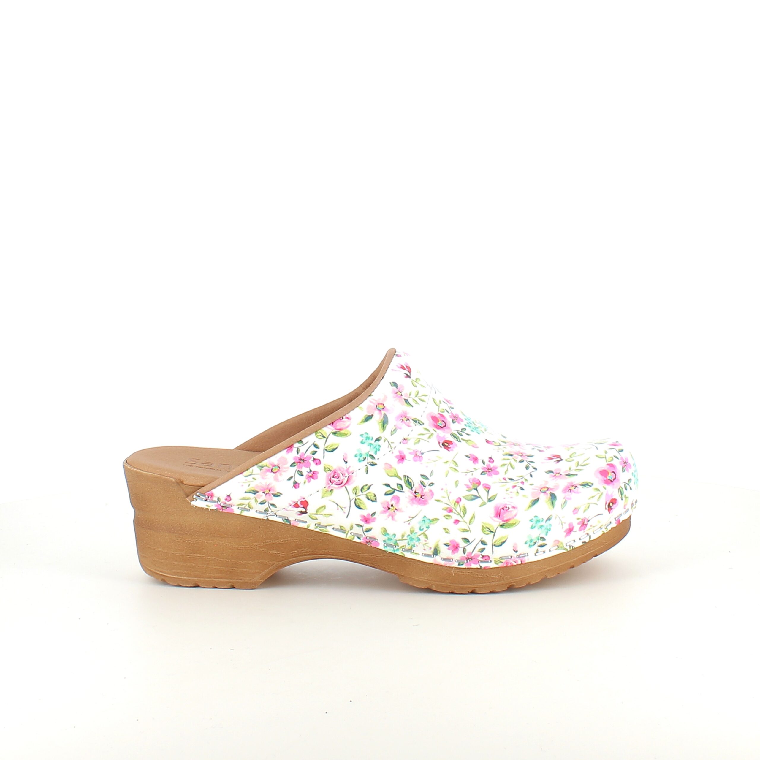 Hvid Sanita-træsko med smukt blomsterprint.