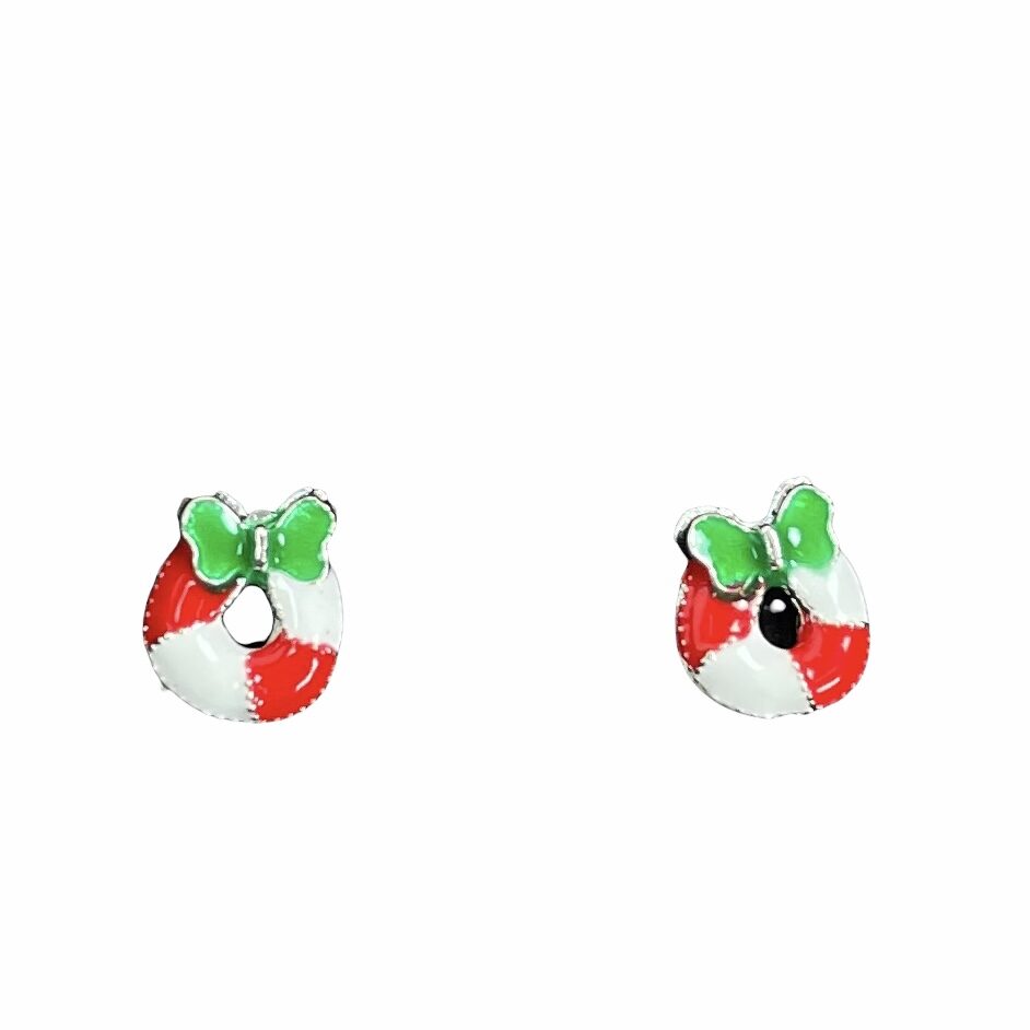 Fine julekrans øreringe i sølvtone med røde, hvide og grønne detaljer.