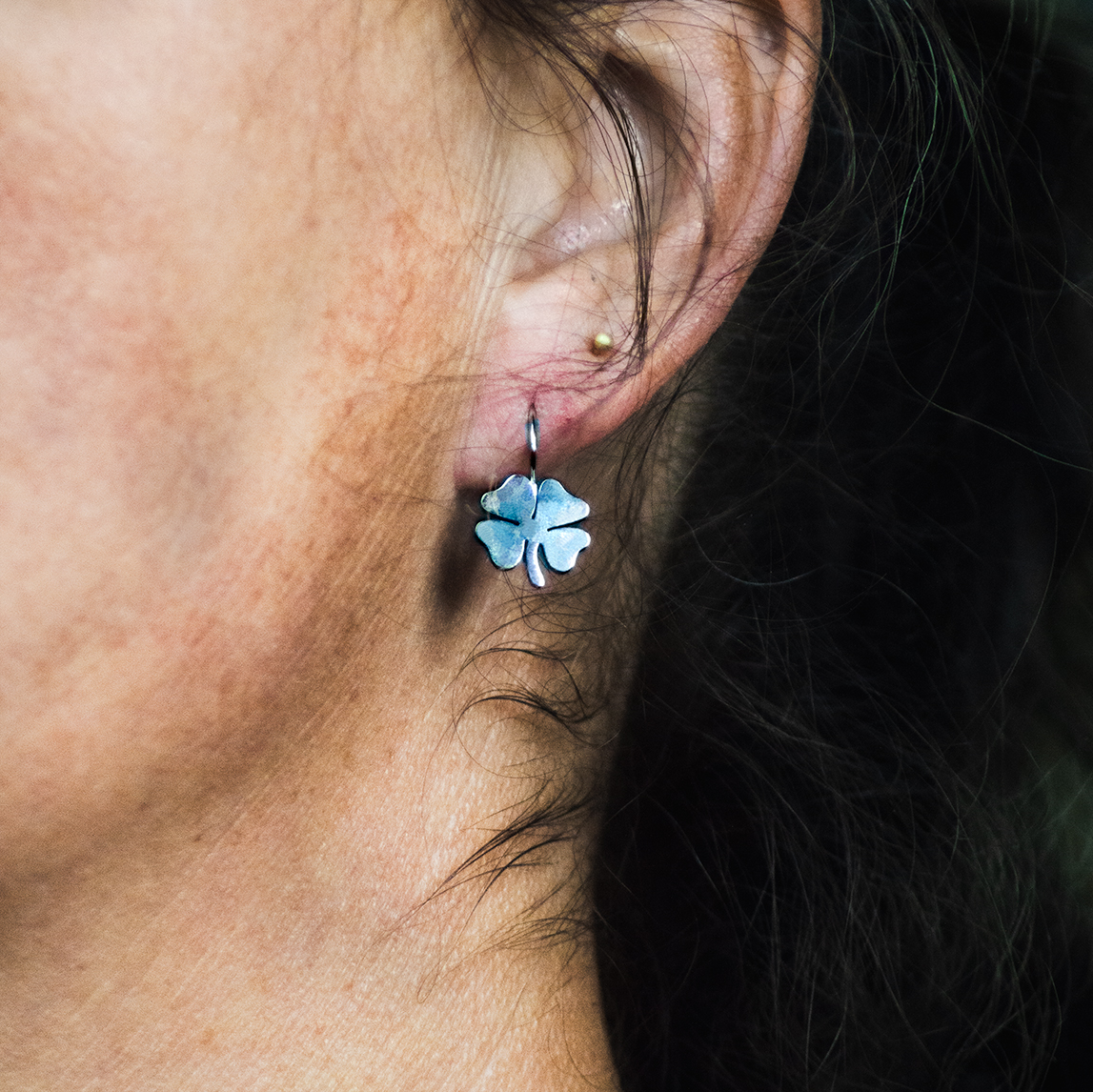 Øreringe med kløver i sølvtone. De er lavet i rustfri stål.