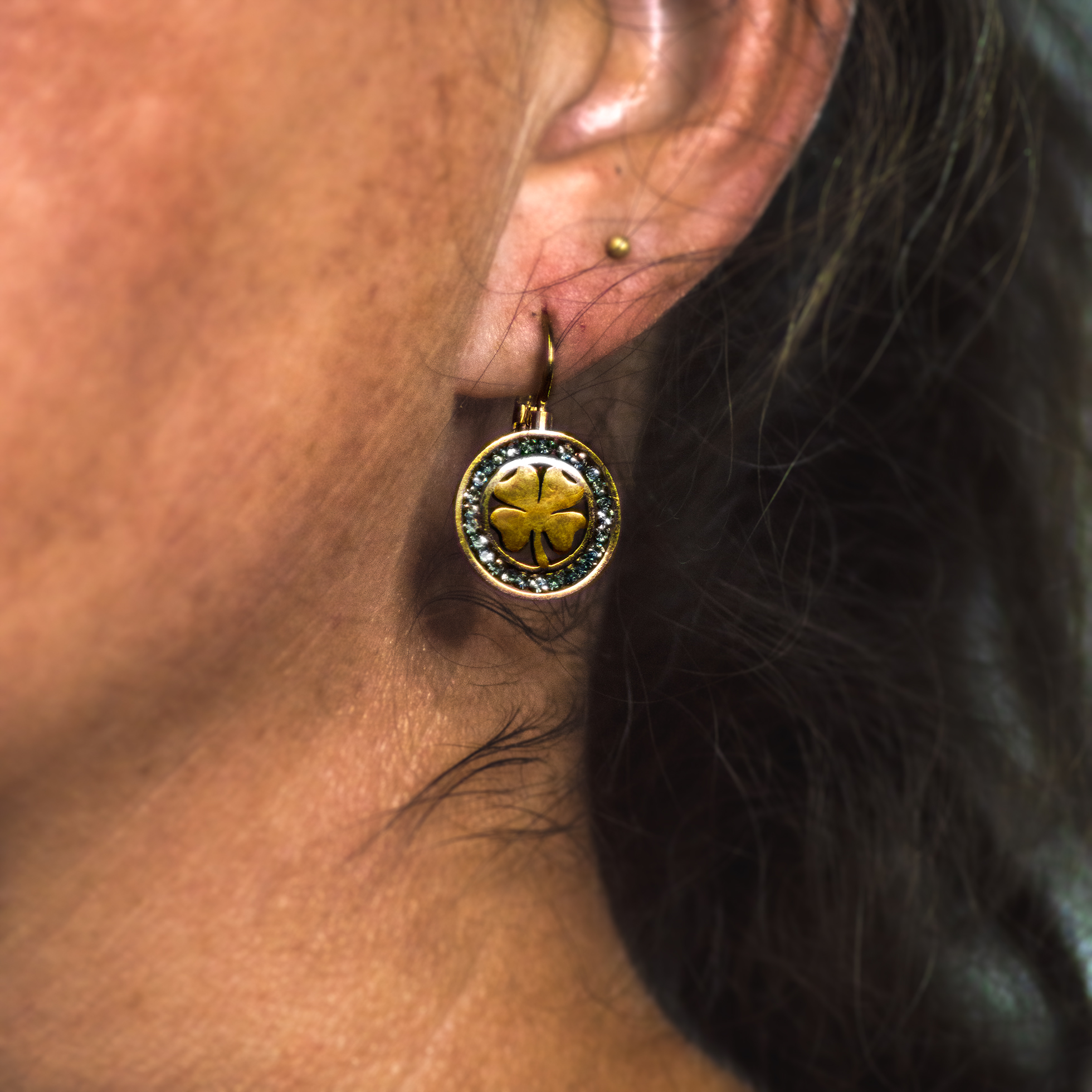 Øreringe med kløver i guldtone. Søde små sten i en cirkel rundt om firkløveret.