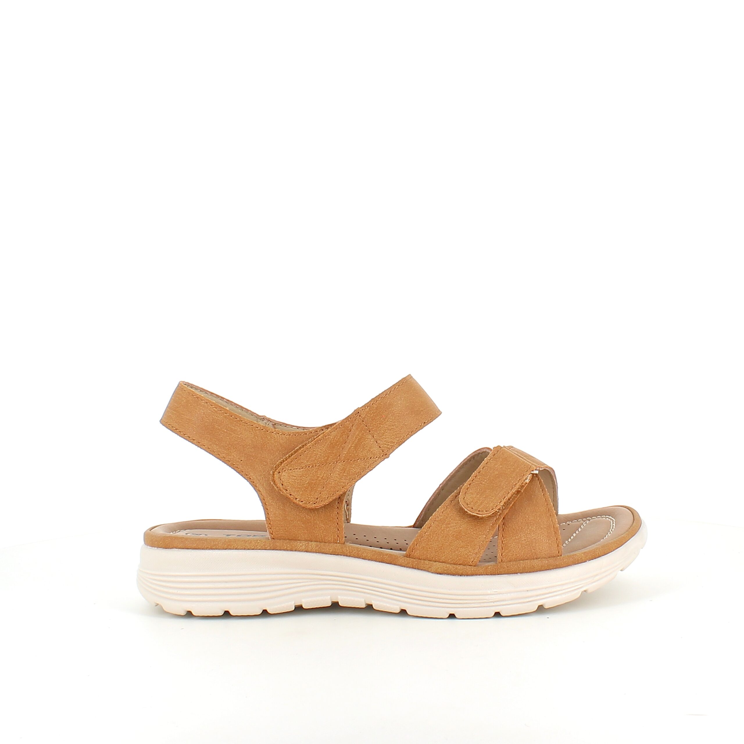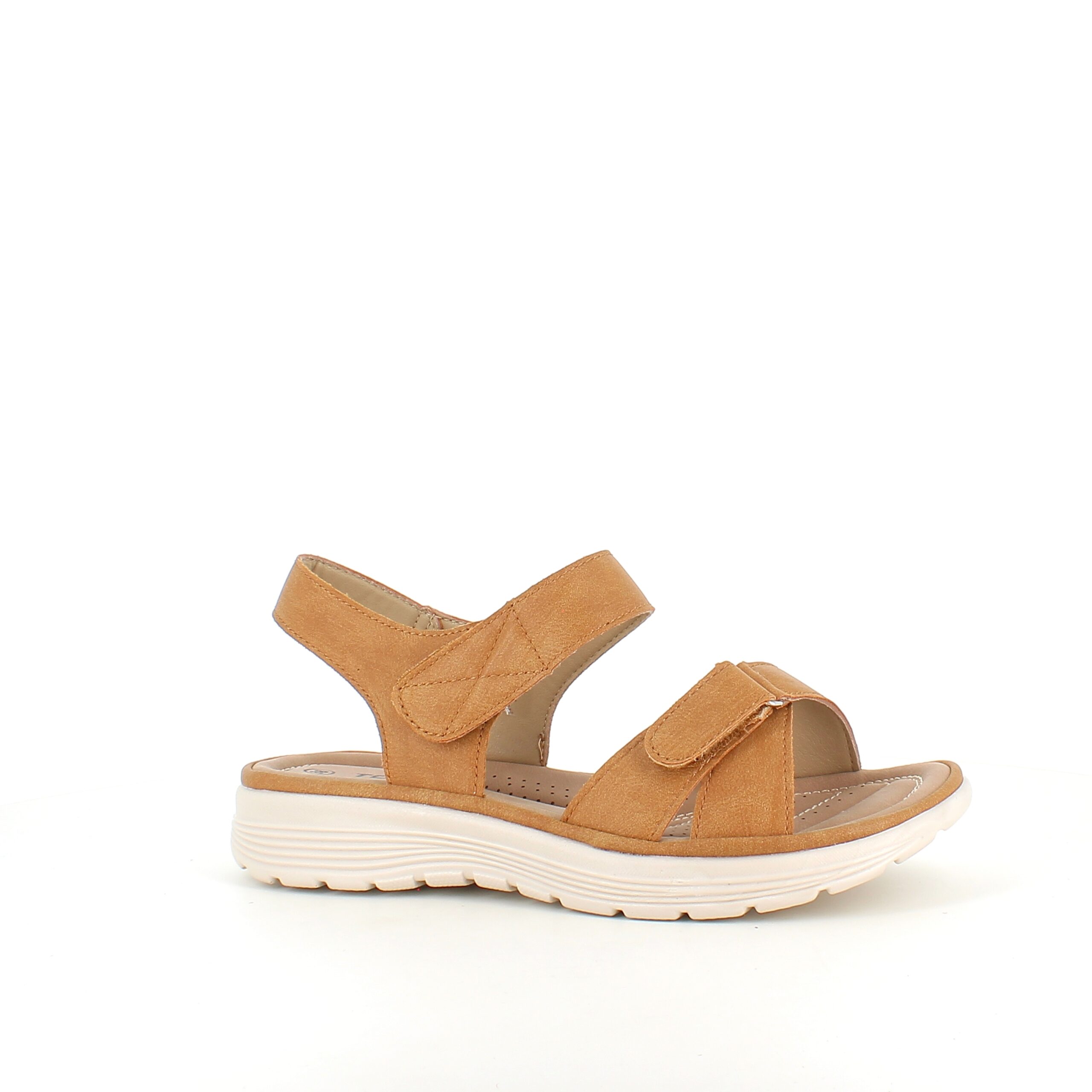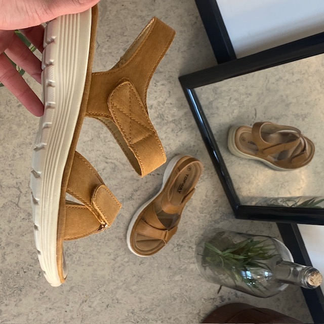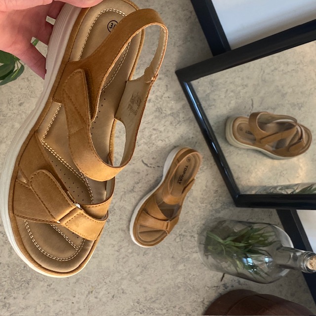 Denne sandal kombinerer stil og komfort på fineste vis. Den er lavet i blødt, camel-farvet pu-læder og har en ergonomisk formet sål med stødabsorberende effekt – ideel til lange dage på jobbet eller gåturen i fritiden.