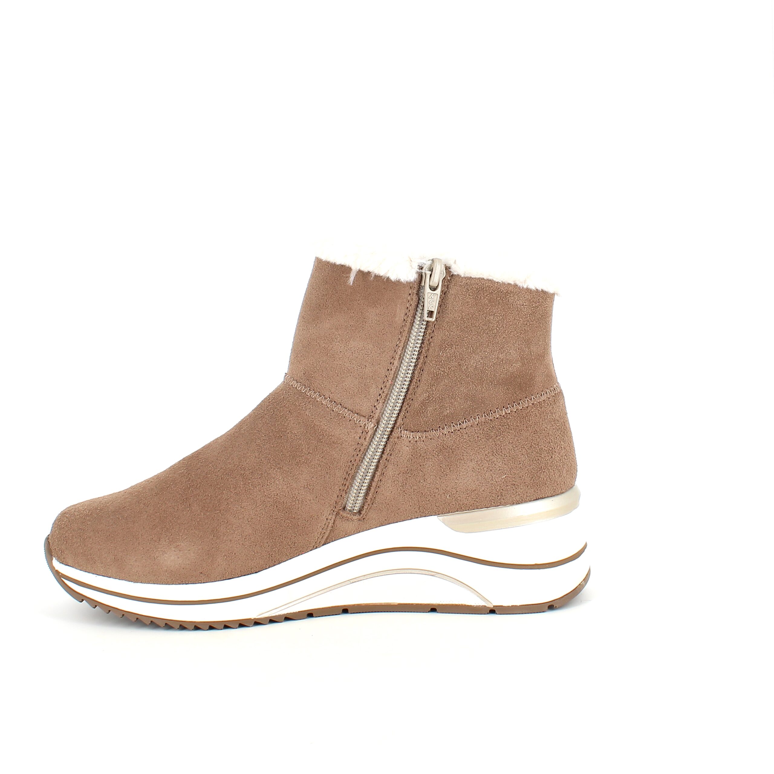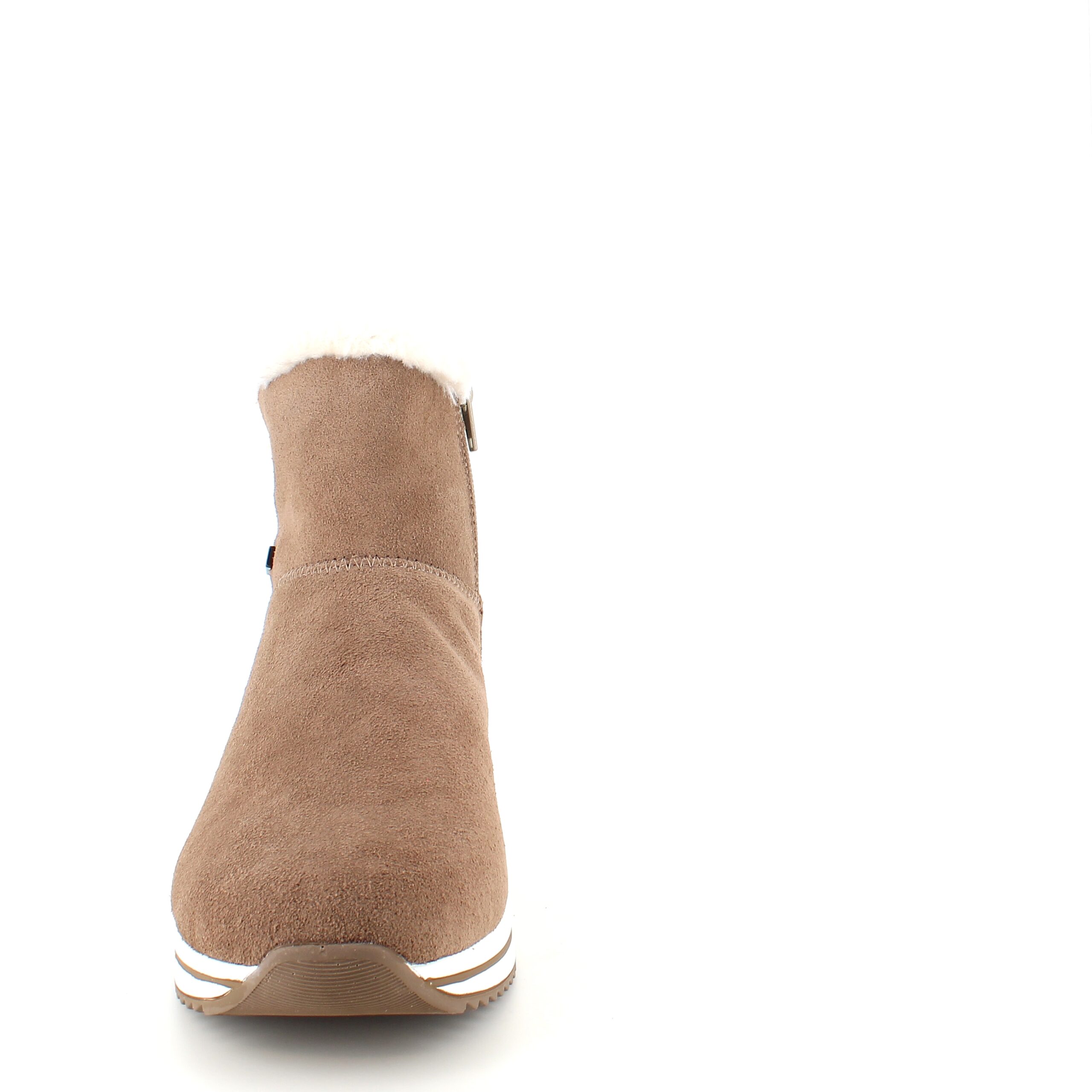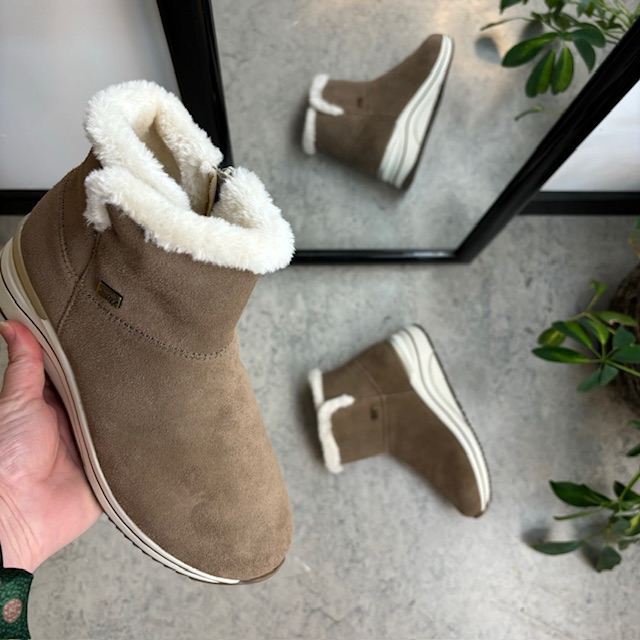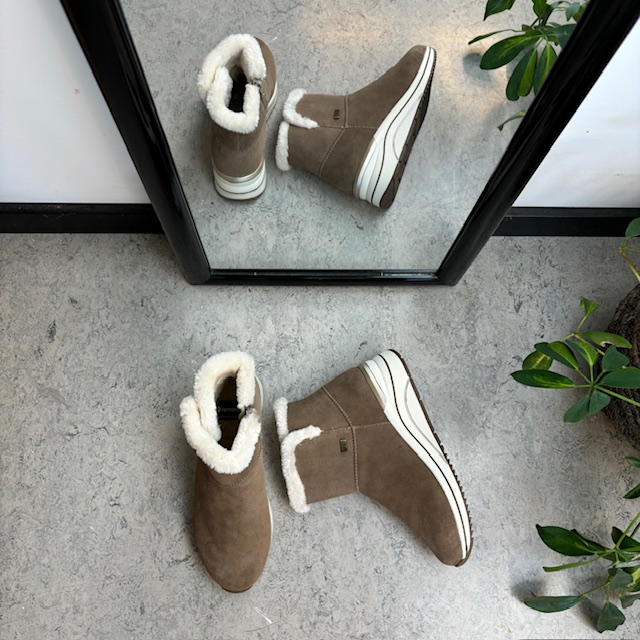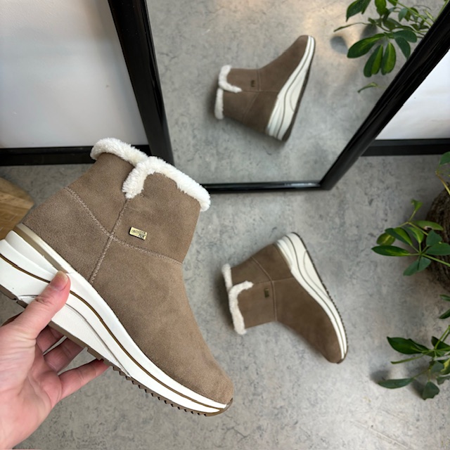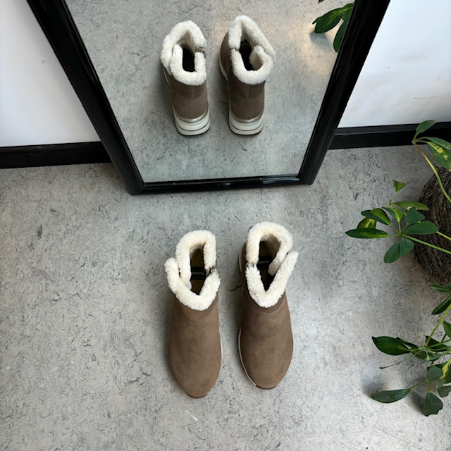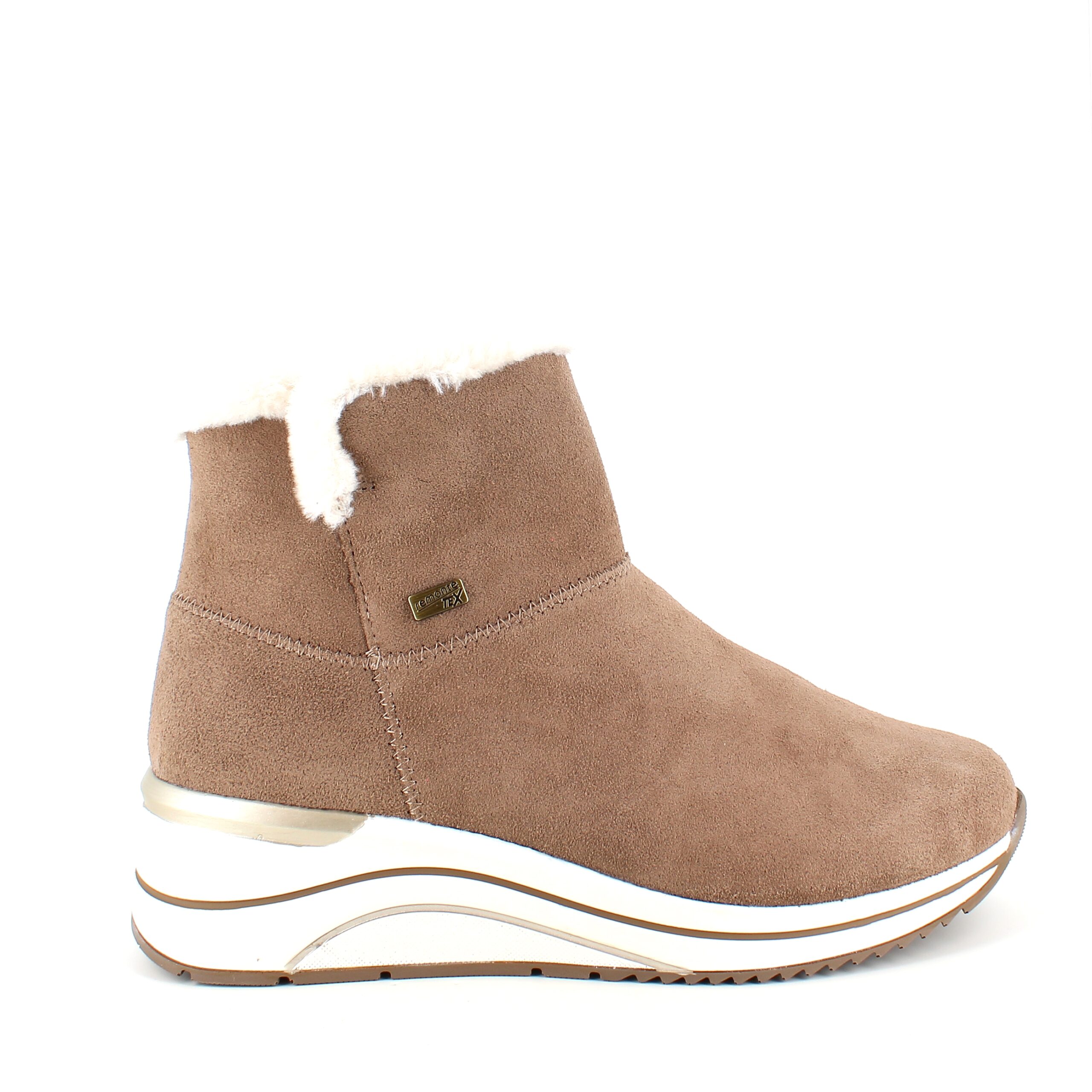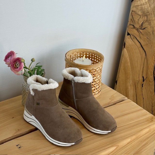 Kort brun remontestøvle med uldfor er en stilfuld og komfortabel vinterstøvle lavet af læder, med en blød ruskindsoverdel, der tilføjer et luksuriøst præg.