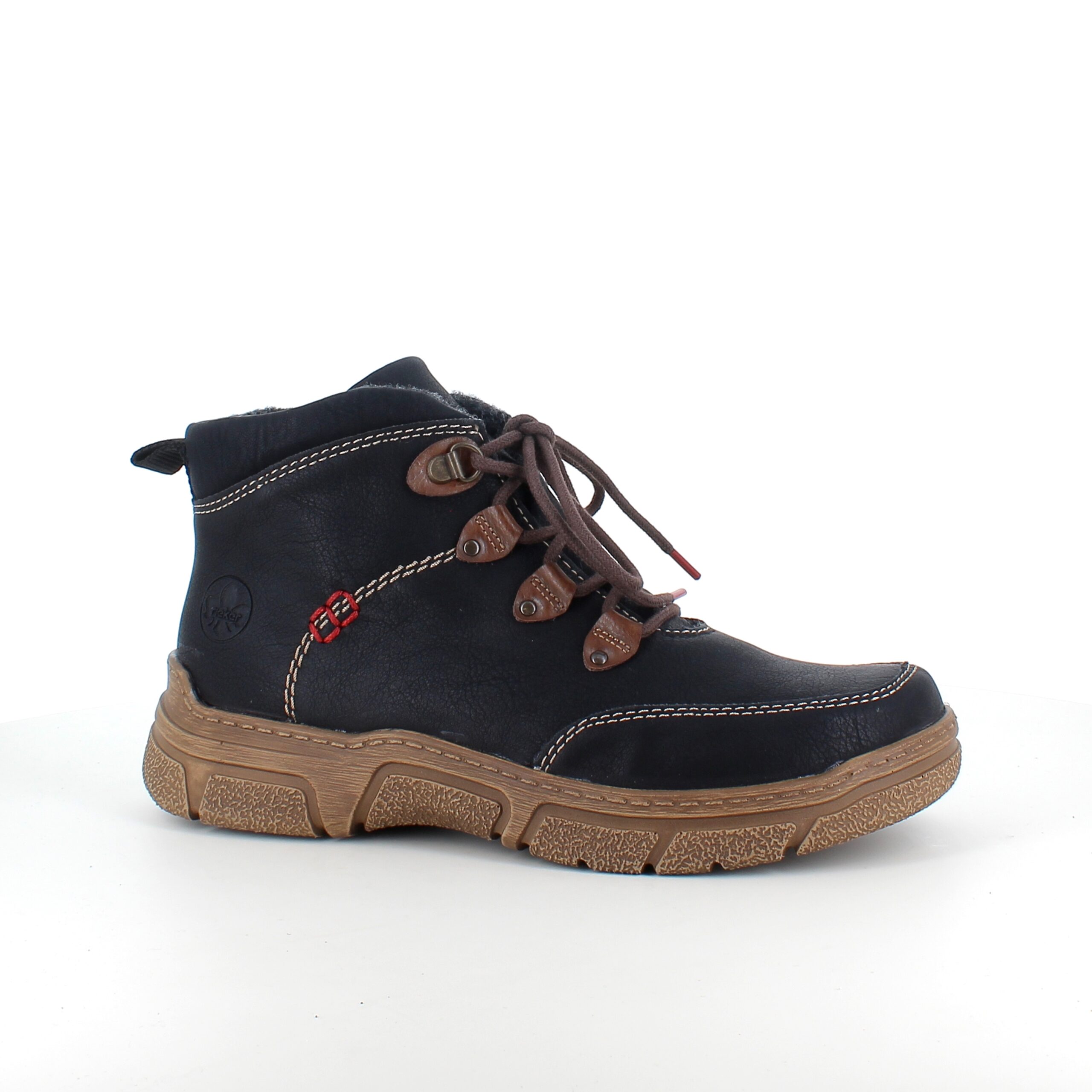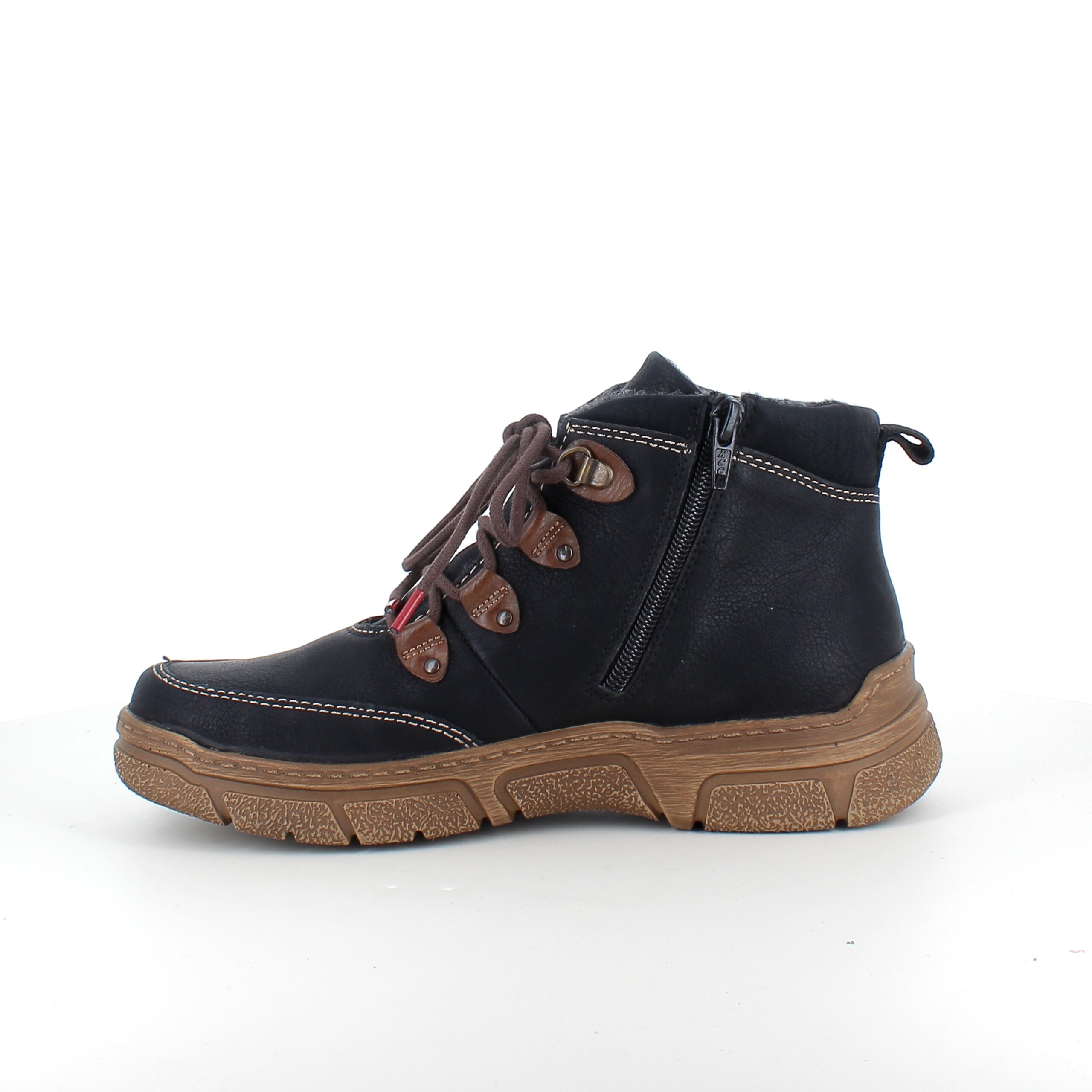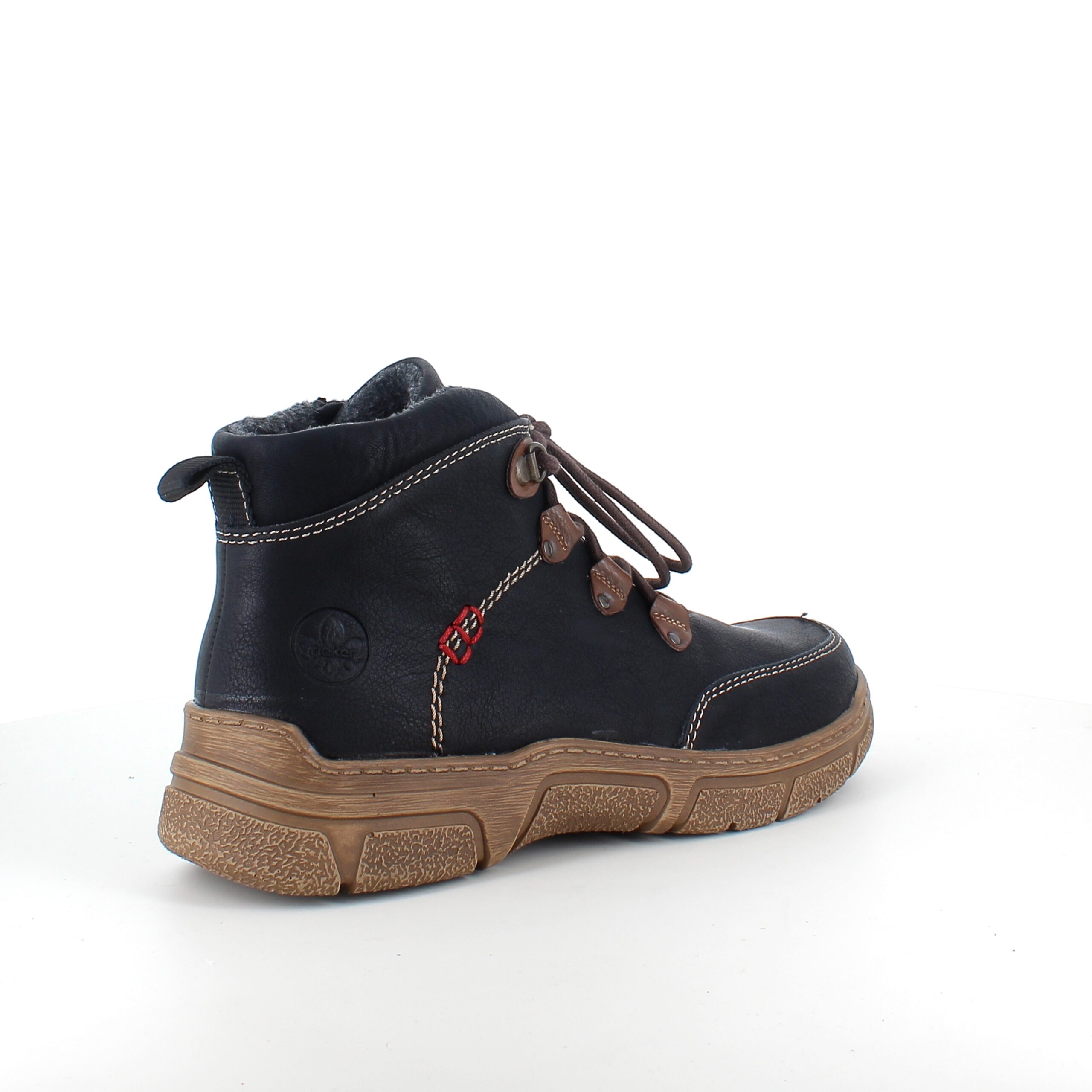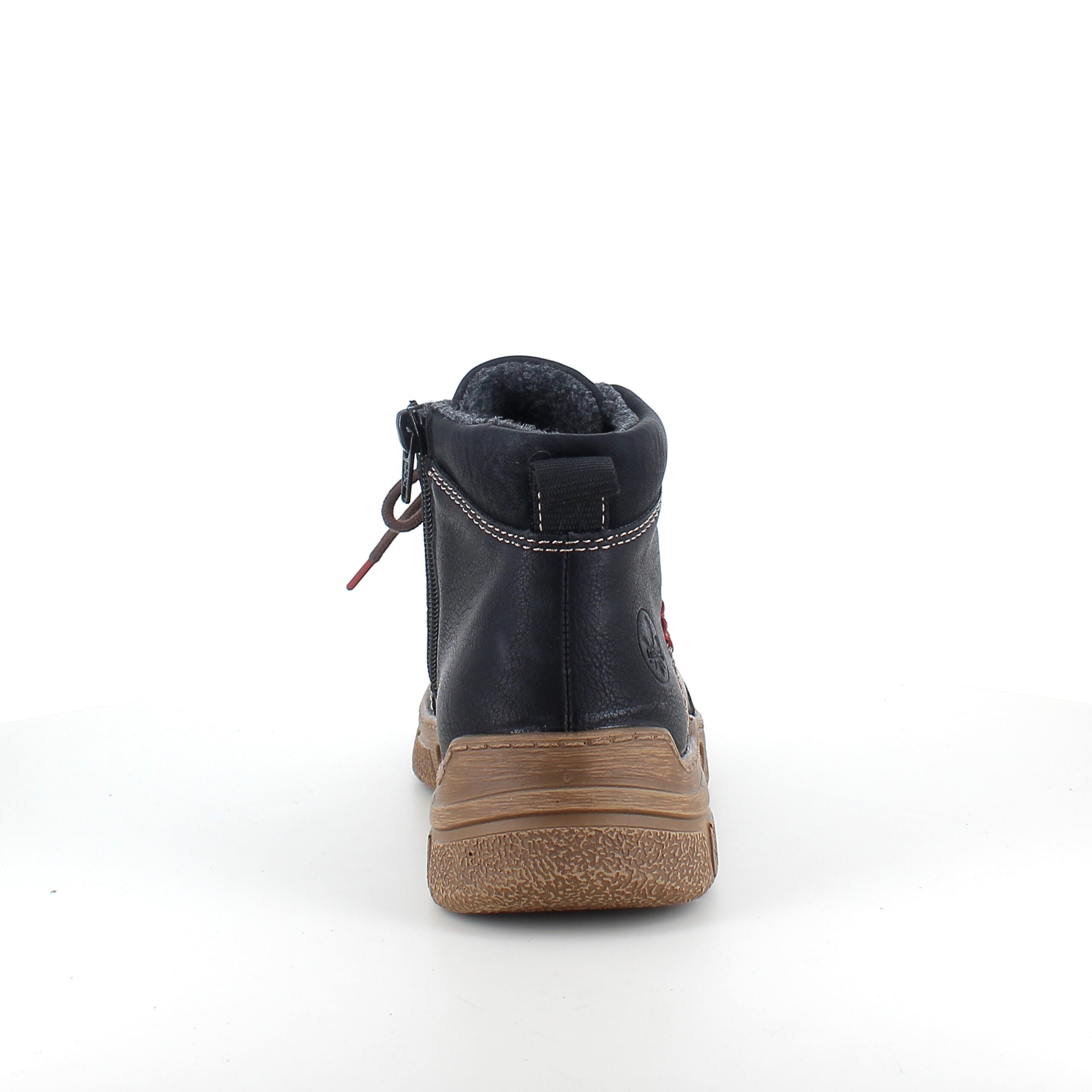 Den sorte overdel med lys syning og et diskret RIEKER-logo giver skoen et moderne og stilfuldt udtryk, mens snørebåndene og den praktiske lynlås på siden sikrer nem påtagning og individuel tilpasning.