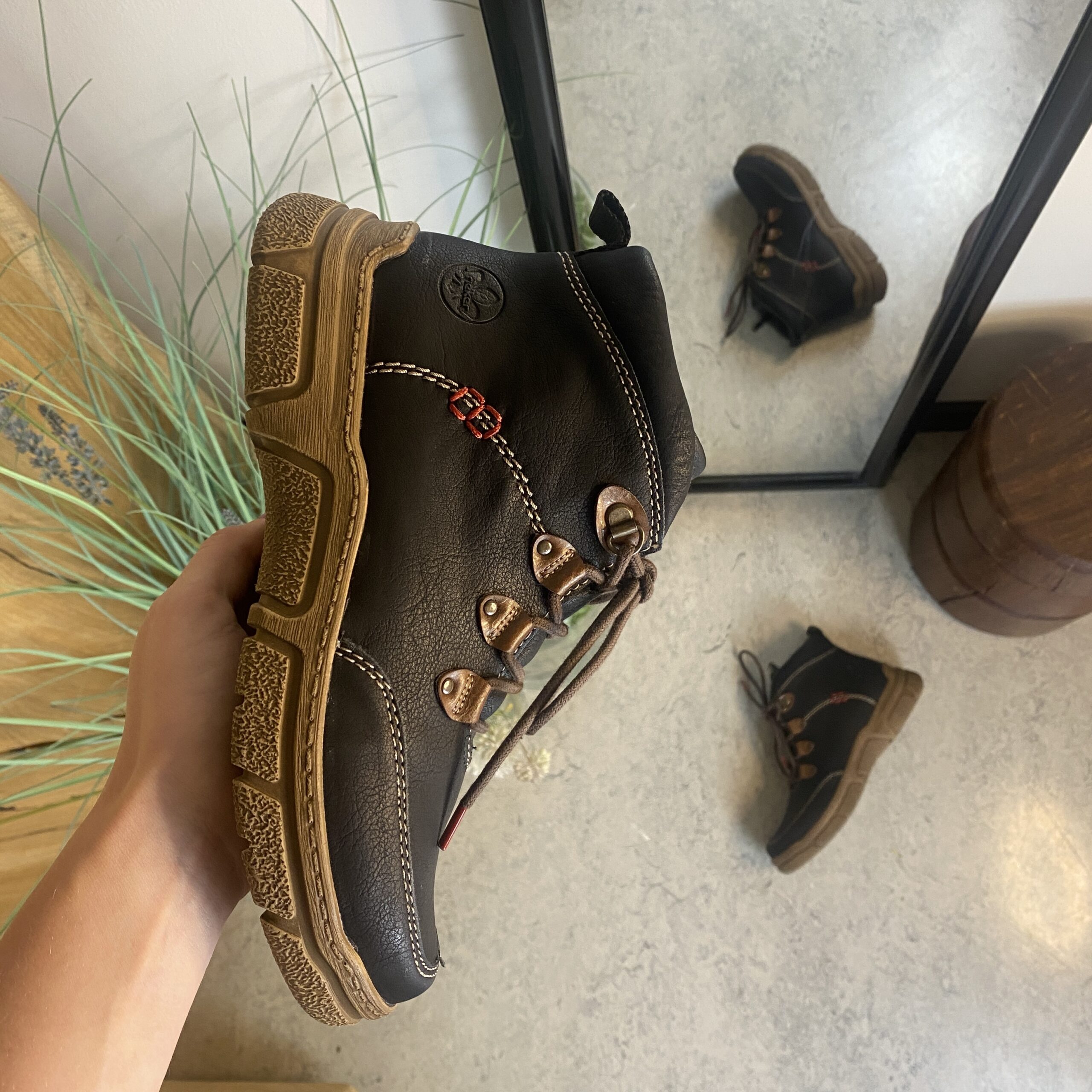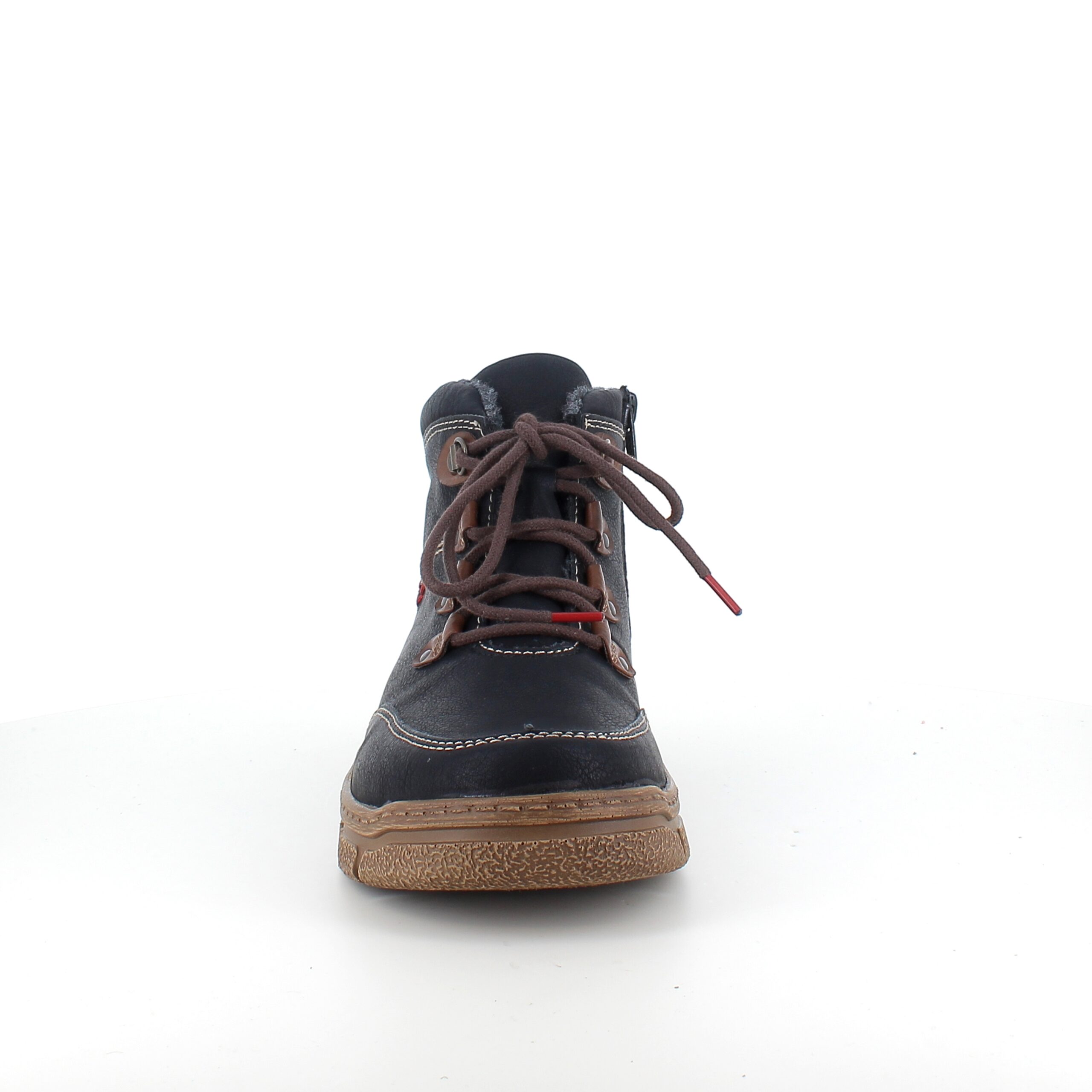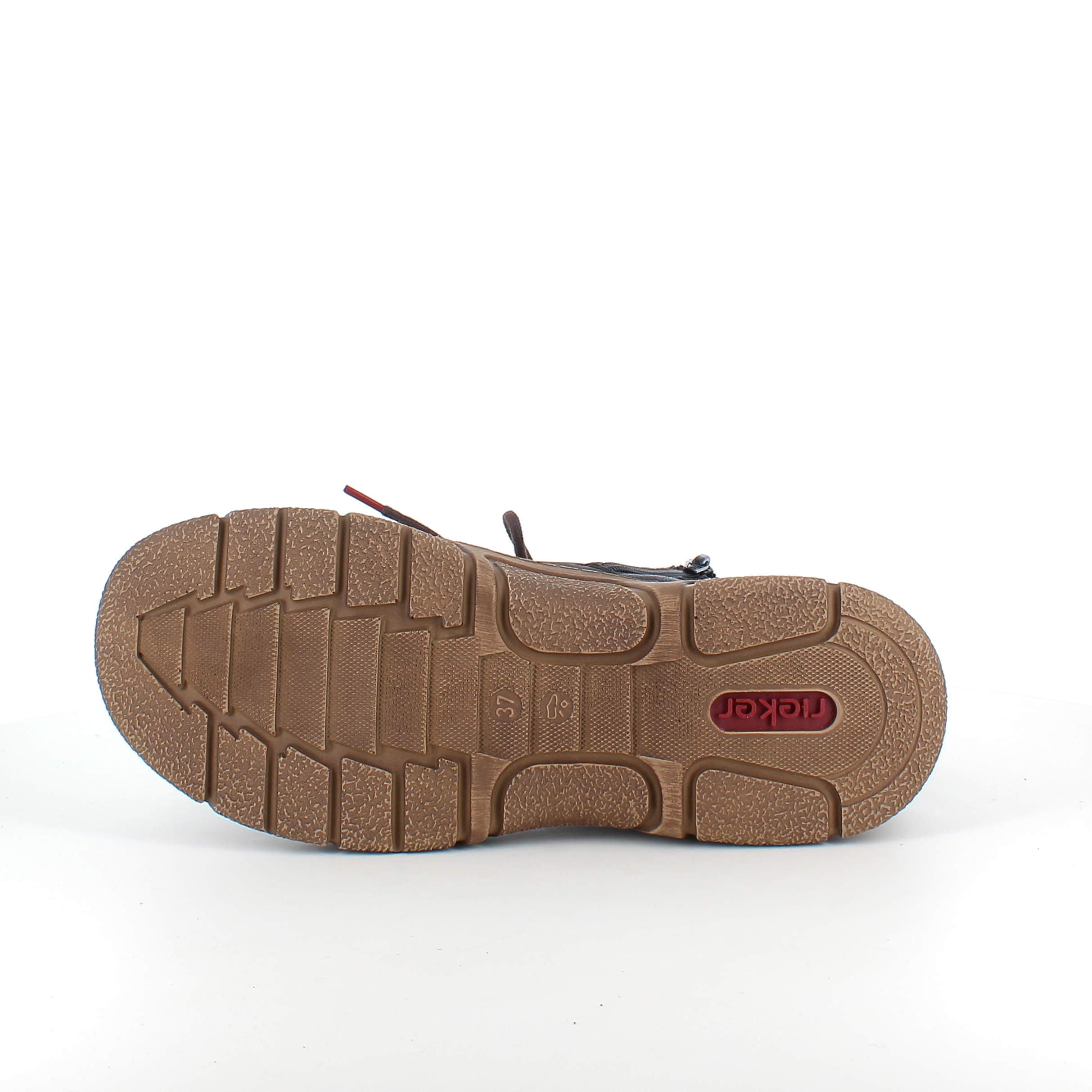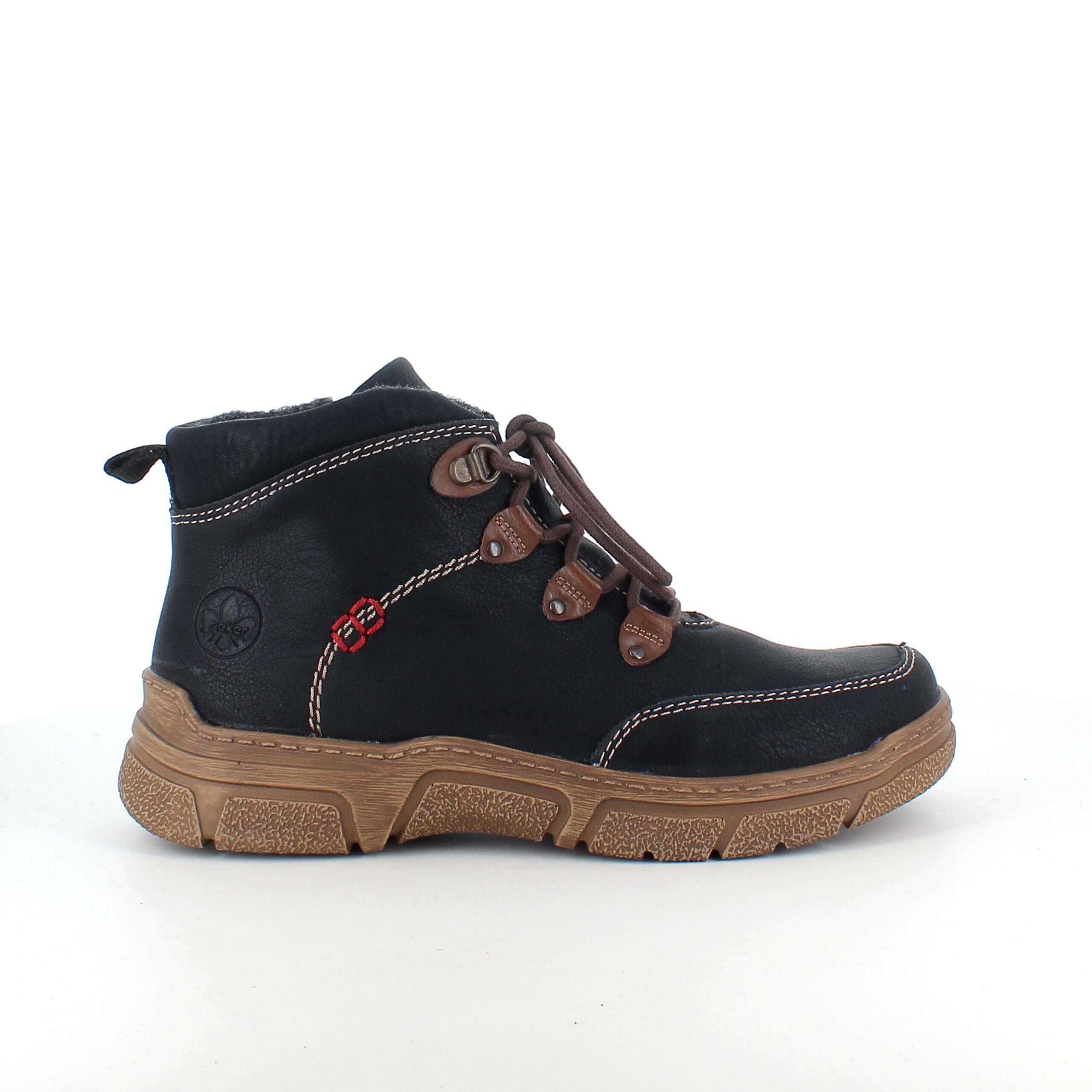 Den sorte overdel med lys syning og et diskret RIEKER-logo giver skoen et moderne og stilfuldt udtryk, mens snørebåndene og den praktiske lynlås på siden sikrer nem påtagning og individuel tilpasning.