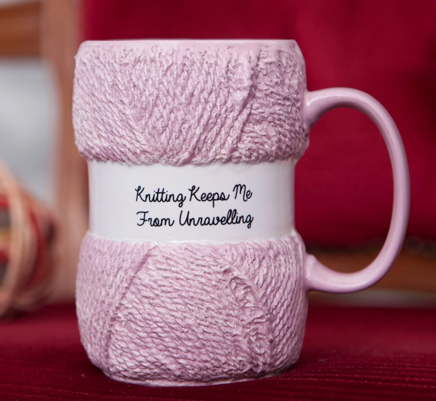 Kruset er udformet som et lyserødt nøgle garn og har teksten “Knitting Keeps Me From Unravelling” indgraveret på midten.