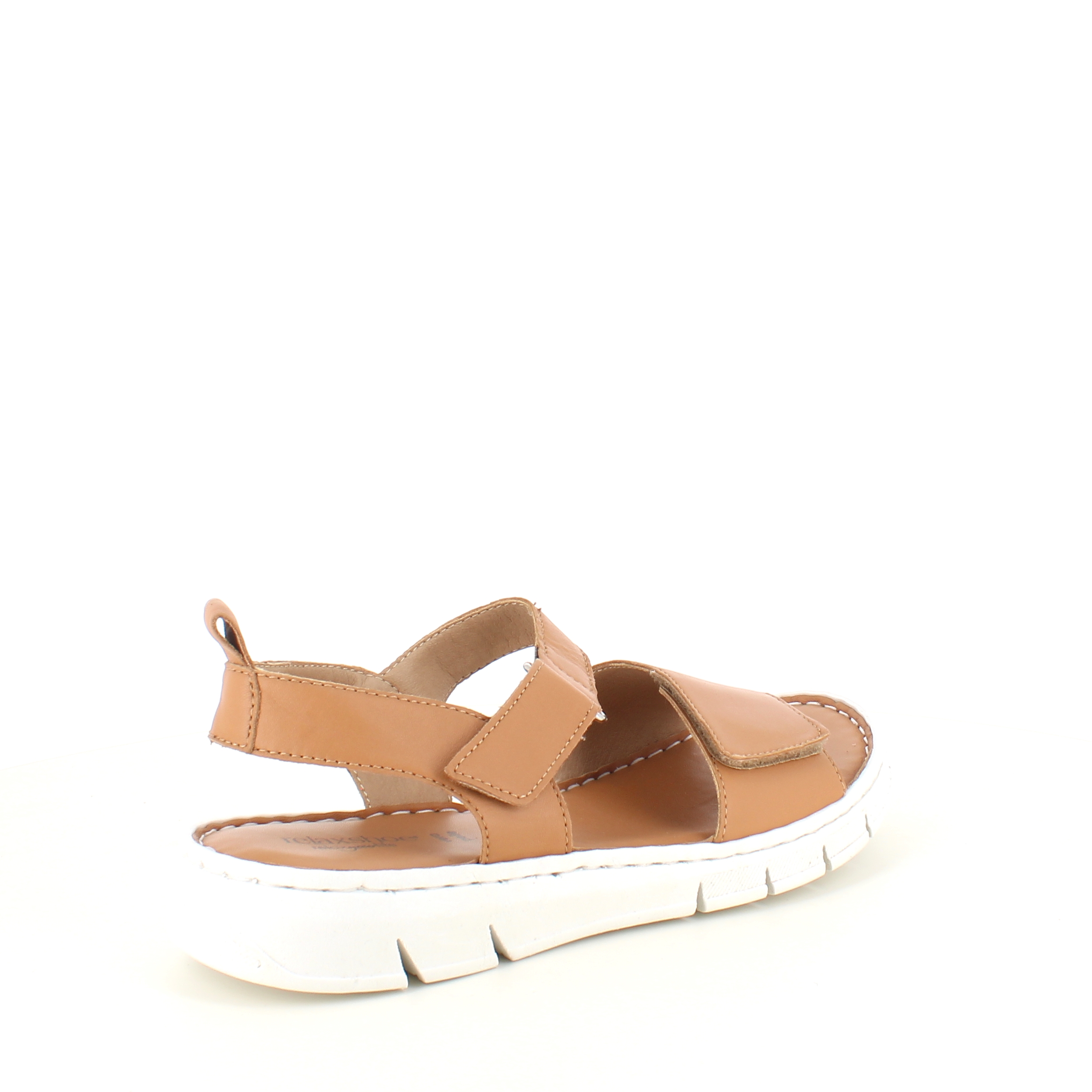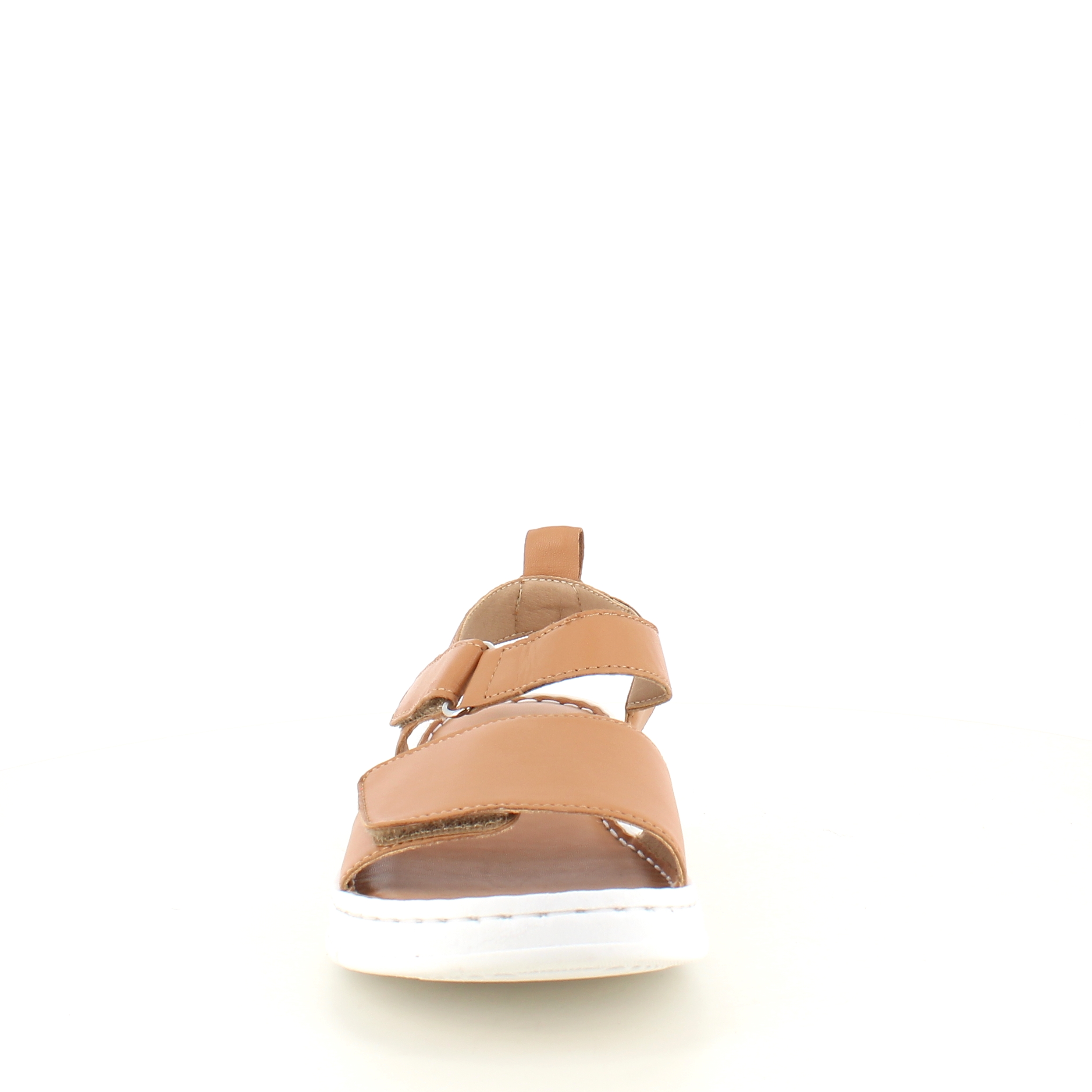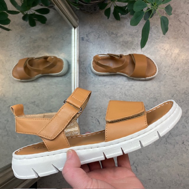 Sandalen har en bred velcro rem over forfoden og en lidt smallere ved anklen.