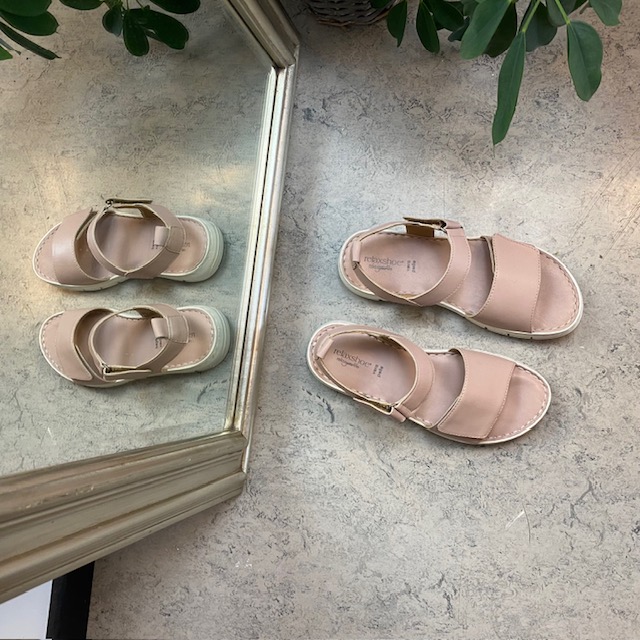 Sandalen har en bred velcro rem over forfoden og en lidt smallere ved anklen.