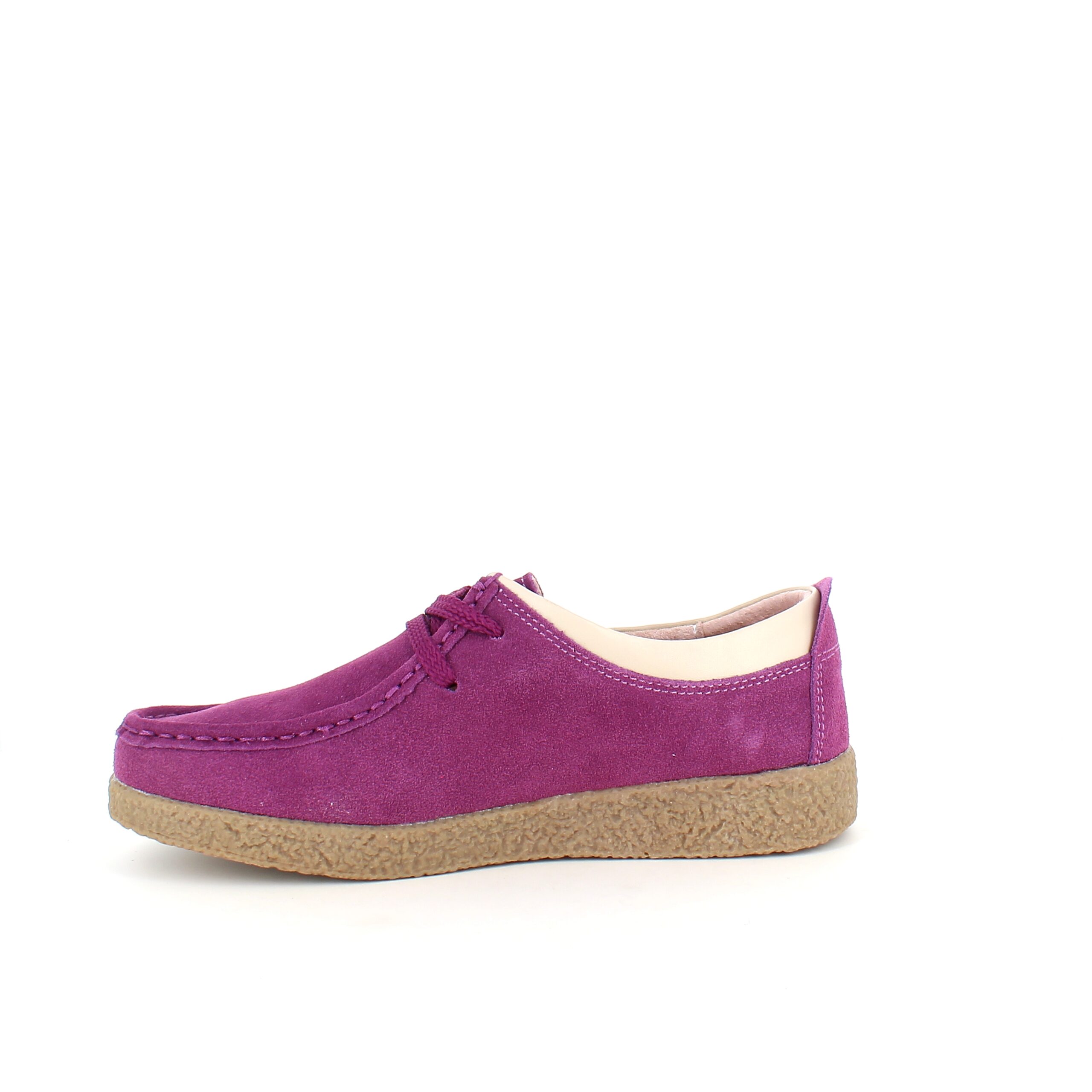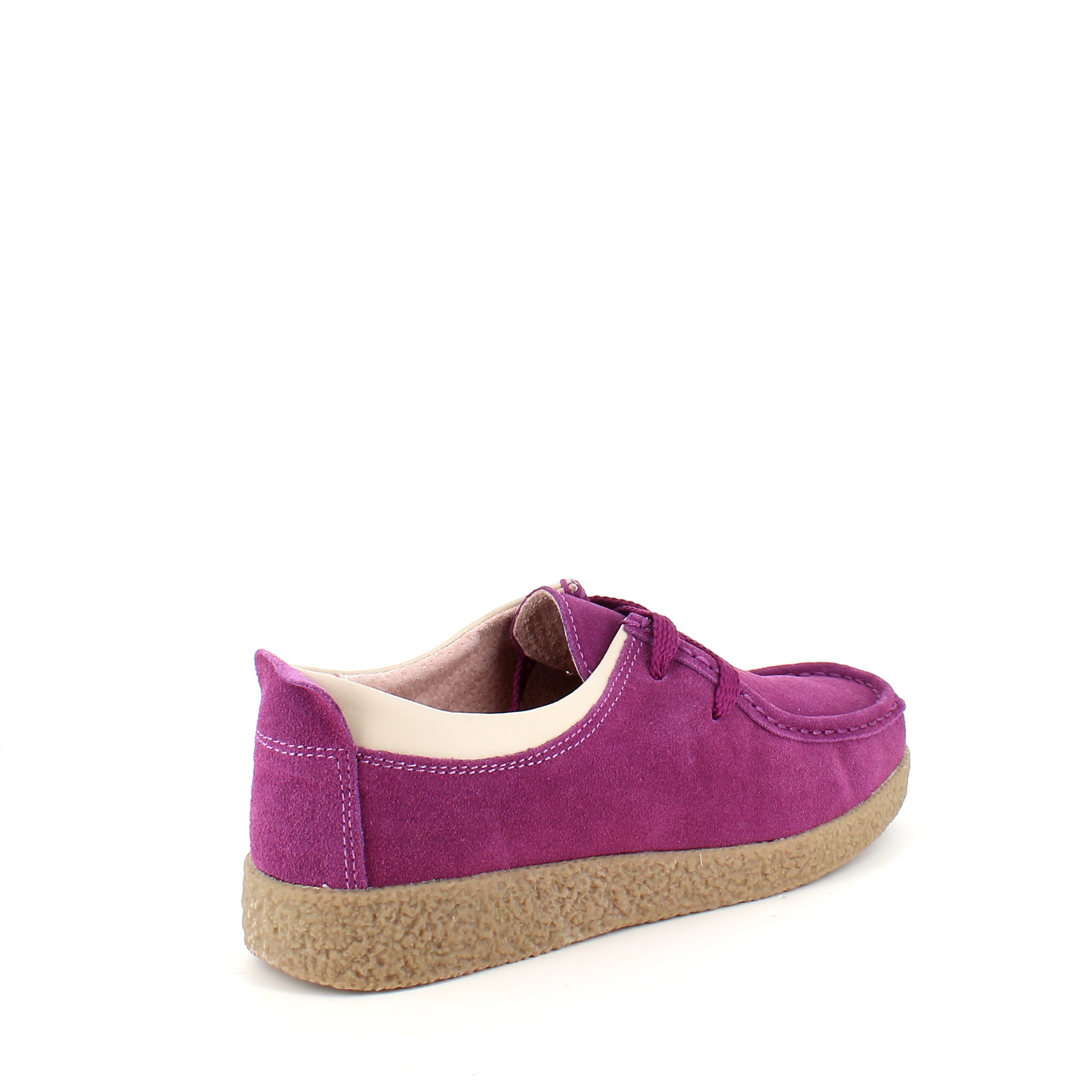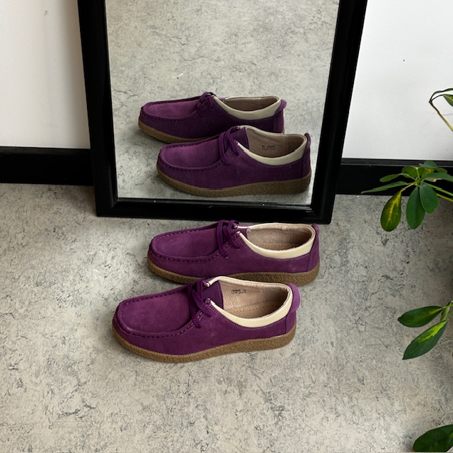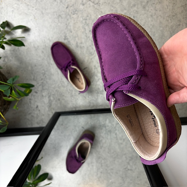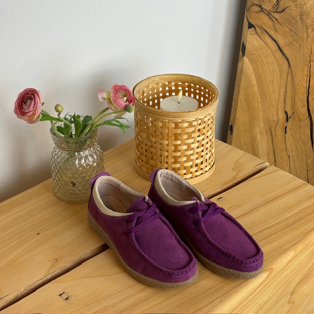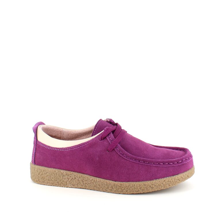Lilla ruskindsko med gummisål har en elegant design med en beige læderkant ved åbningen. Skoen har snørelukning og en tydelig syning i overdelen, som giver et stilfuldt udseende. Den indvendige skum sål er beklædt med læder for komfort, og modellen er almindelig med en bredde på 7.5 cm i størrelse 37. Ydersålen er lavet af rågummi, hvilket giver god stødabsorbering og fleksibilitet. Skoen fås i størrelserne 36-41 og i mange forskellige farver.