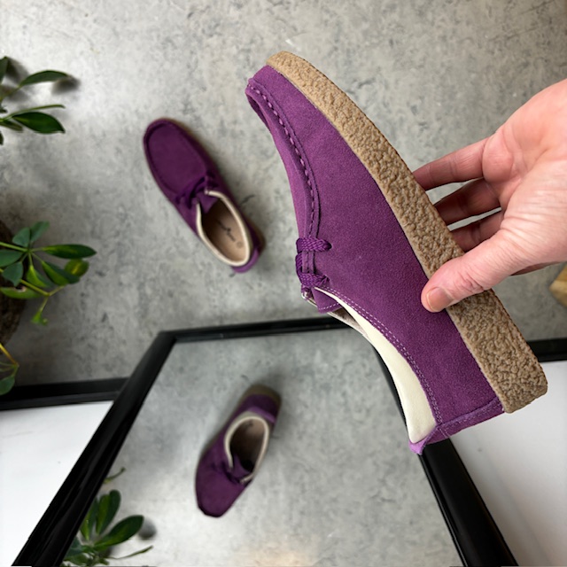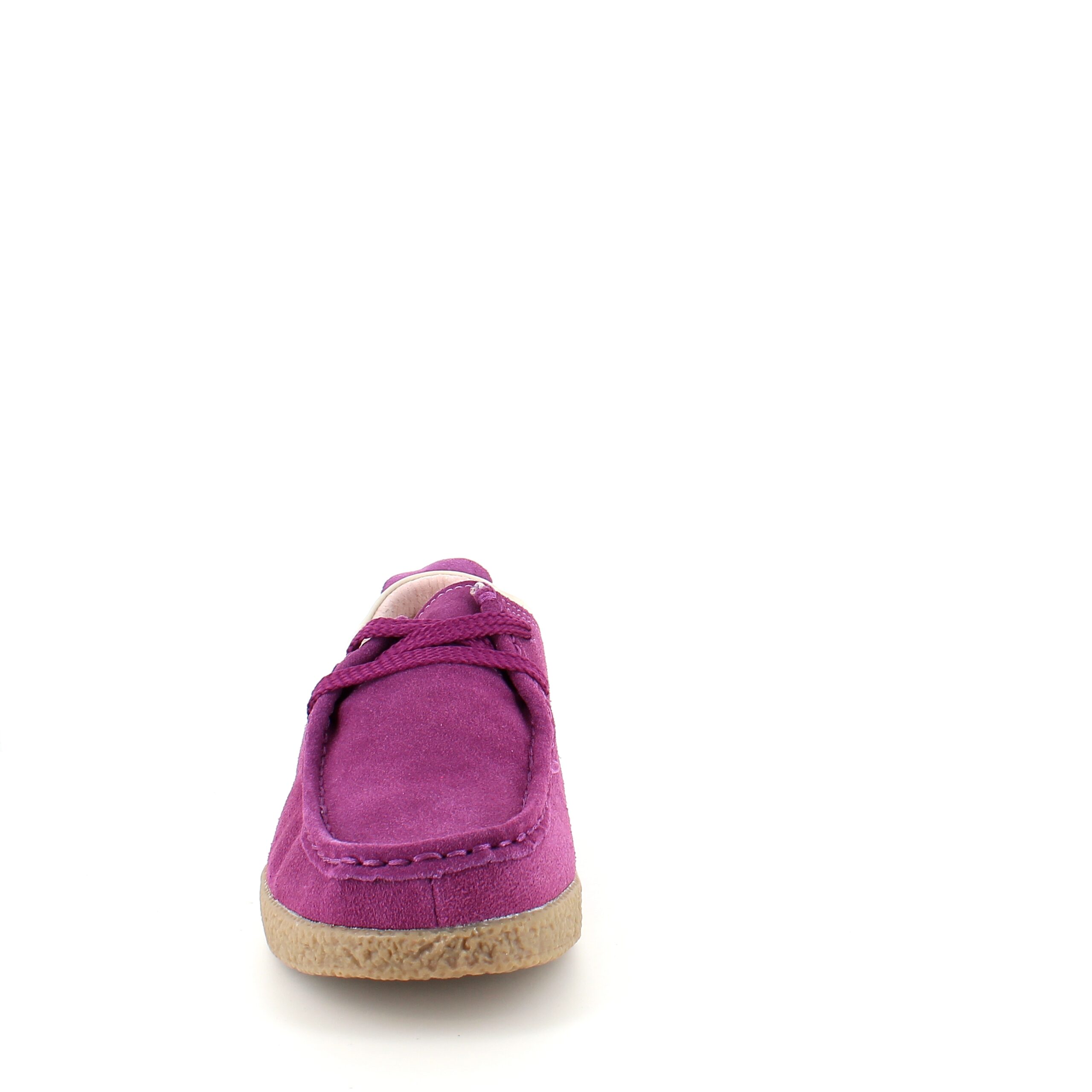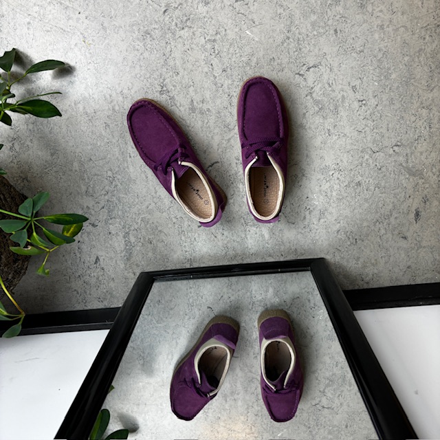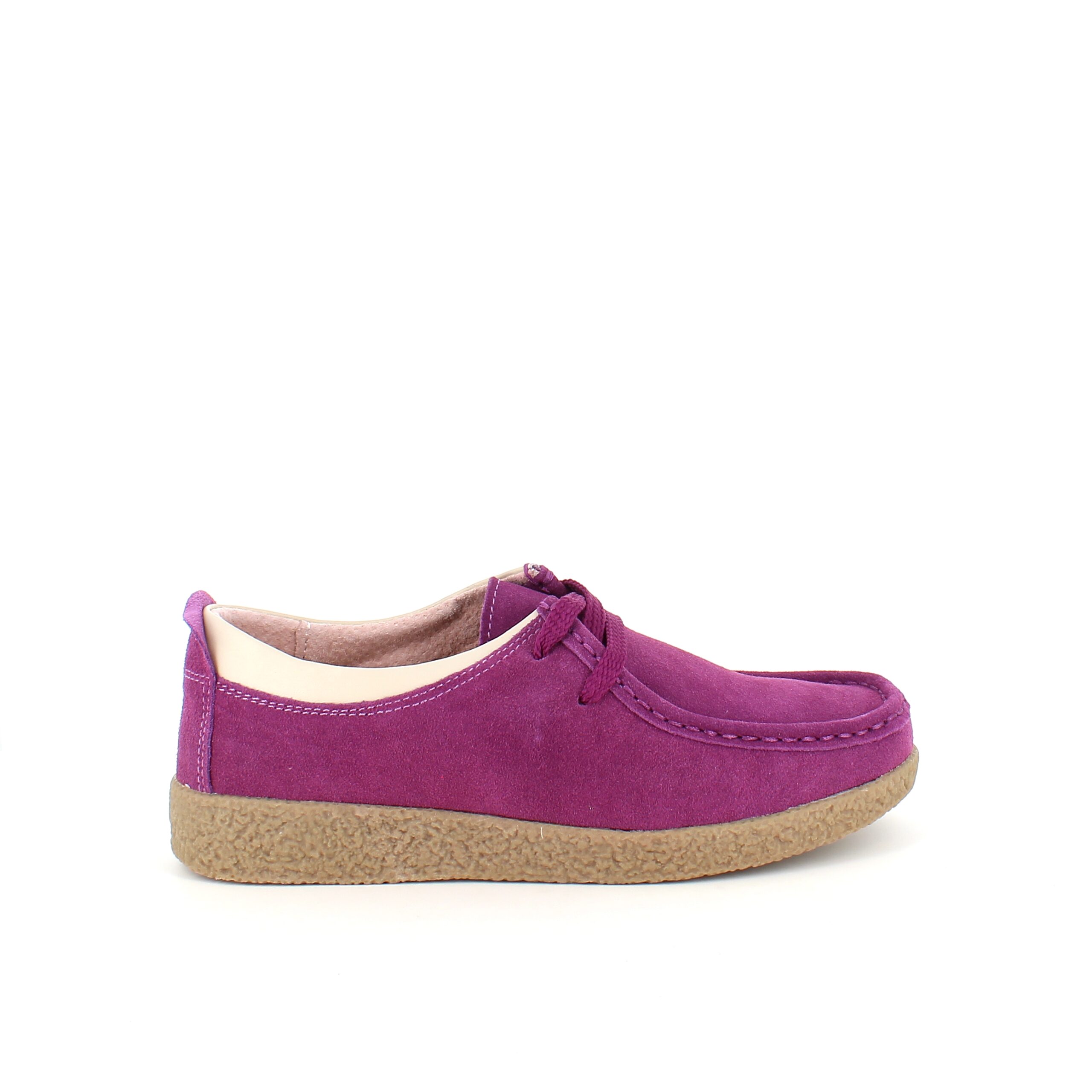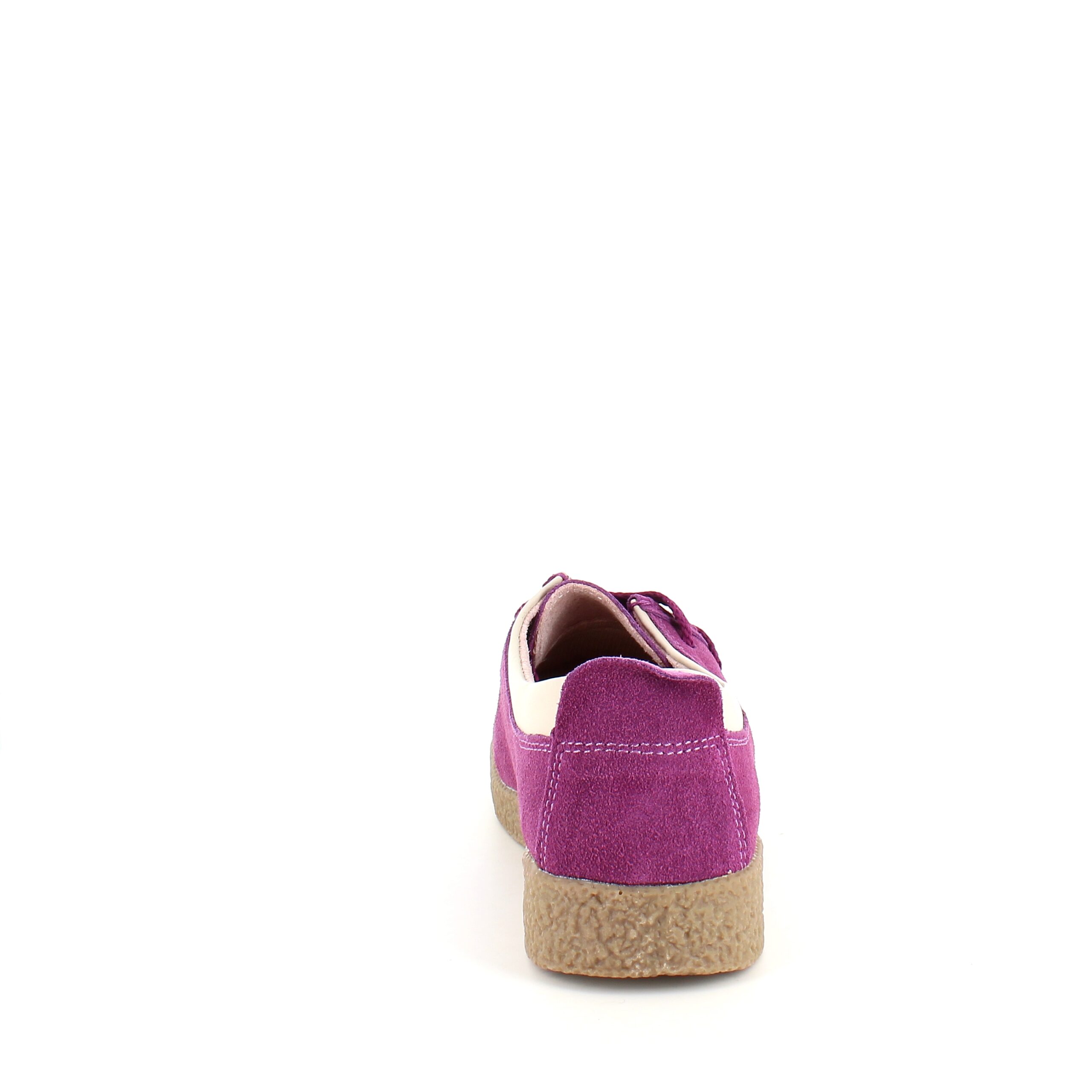 Lilla ruskindsko med gummisål har en elegant design med en beige læderkant ved åbningen. Skoen har snørelukning og en tydelig syning i overdelen, som giver et stilfuldt udseende. Den indvendige skum sål er beklædt med læder for komfort, og modellen er almindelig med en bredde på 7.5 cm i størrelse 37. Ydersålen er lavet af rågummi, hvilket giver god stødabsorbering og fleksibilitet. Skoen fås i størrelserne 36-41 og i mange forskellige farver.