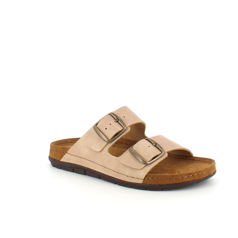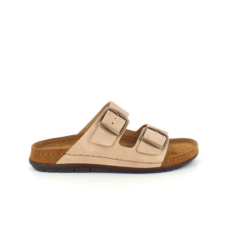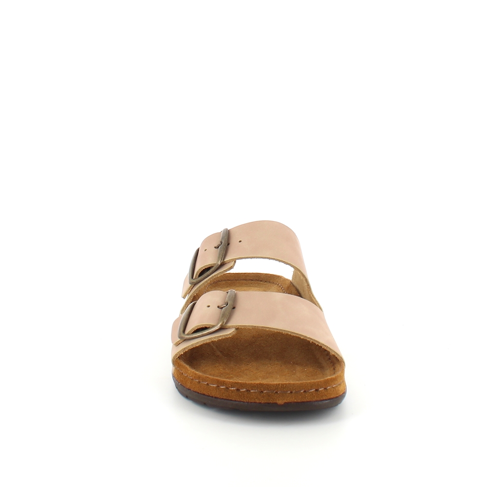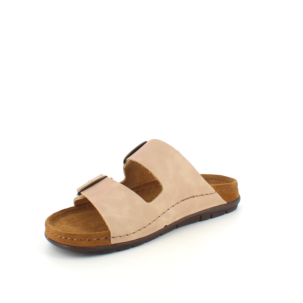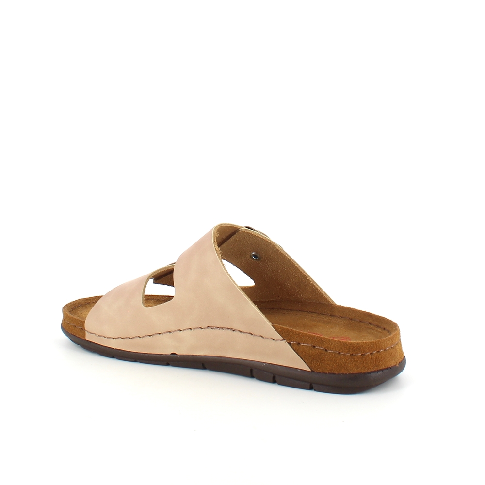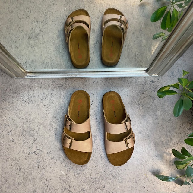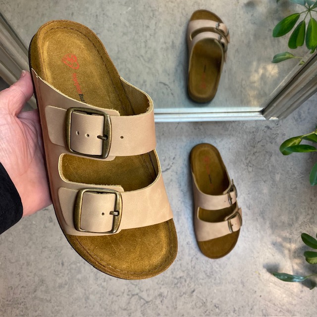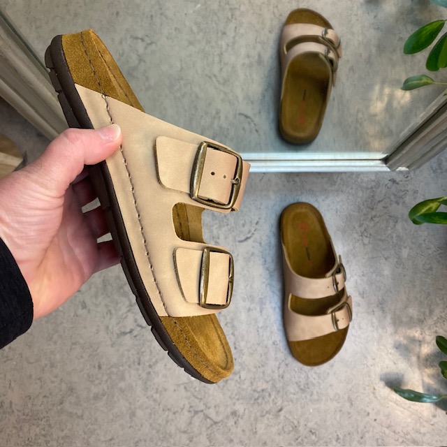 Lækker lysebrun slip-on sandal i skind med to brede, justerbare remme. Indersålen er en blød skumsål beklædt med ruskind, der som ekstra detalje er ført ud over mellemsålen. Ydersålen har ekstra støddæmpning ved hælen og er yderst fleksibel. En virkelig lækker og gennemført slip-on sandal. Sandalen kommer i størrelserne 37-42 og findes i flere farver.
