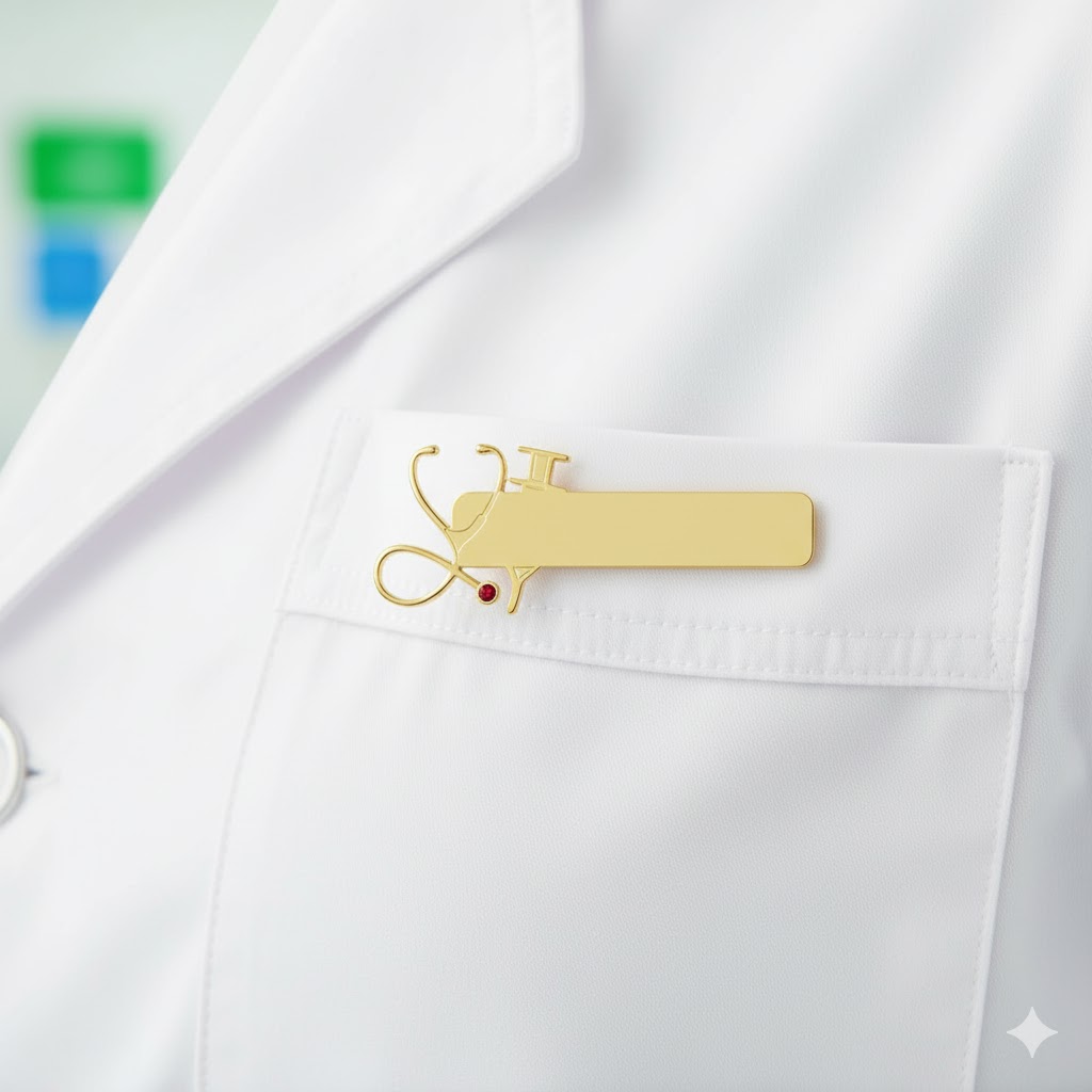 Dette smukke navneskilt i guldfarvet rustfrit stål kombinerer elegance og professionalisme. Designet med et sprøjtemotiv og en lille rød sten som detalje, symboliserer det præcision, omsorg og engagement i sundhedssektoren. Det blanke guldfinish giver et varmt og eksklusivt udtryk, der passer perfekt til sygeplejersker, SOSU’er, læger og andet sundhedspersonale, der ønsker et personligt præg på uniformen.