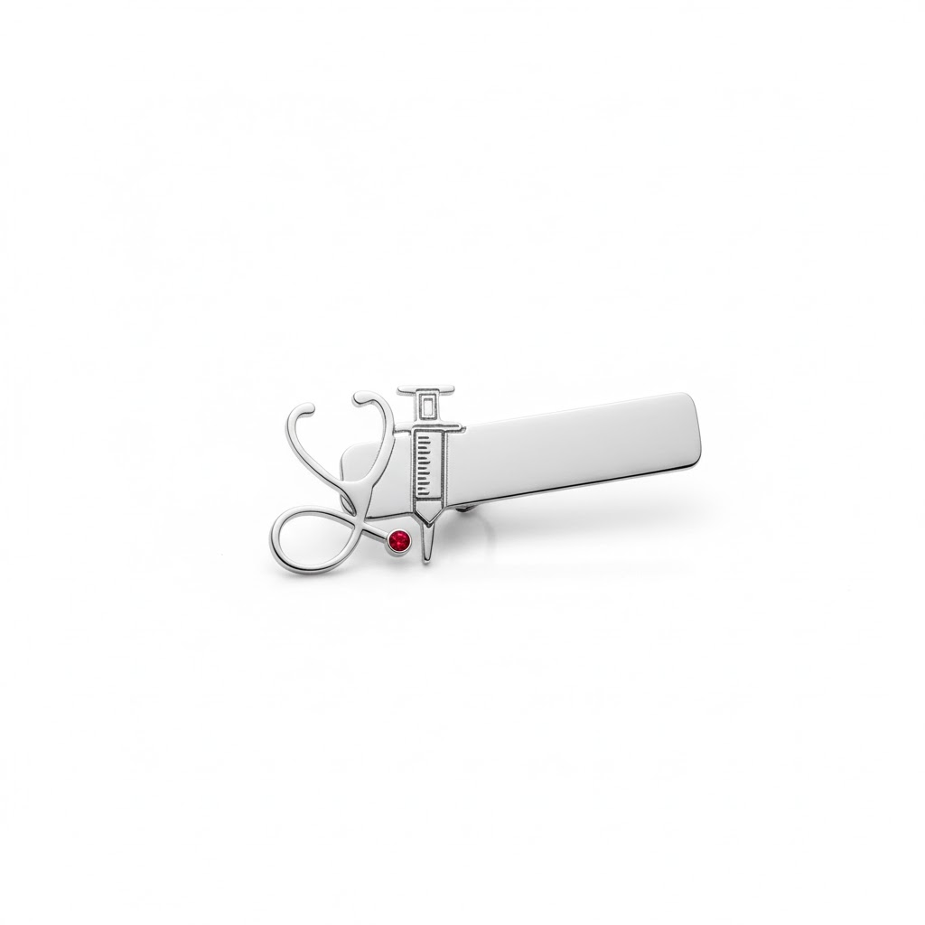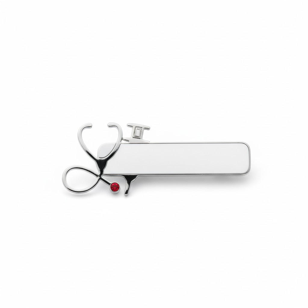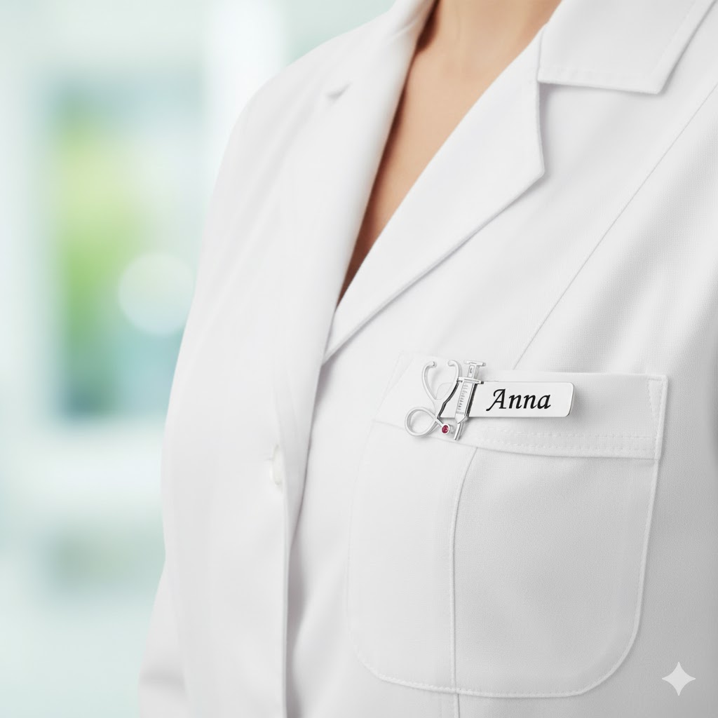 Dette flotte navneskilt i sølvfarvet rustfrit stål er designet med et elegant sprøjtemotiv og en lille rød sten som detalje, der symboliserer præcision og omsorg i sundhedsarbejdet. Skiltet har et moderne og stilrent udtryk, som gør det perfekt til sygeplejersker, SOSU’er, bioanalytikere og andet sundhedspersonale, der ønsker et personligt præg på deres uniform.