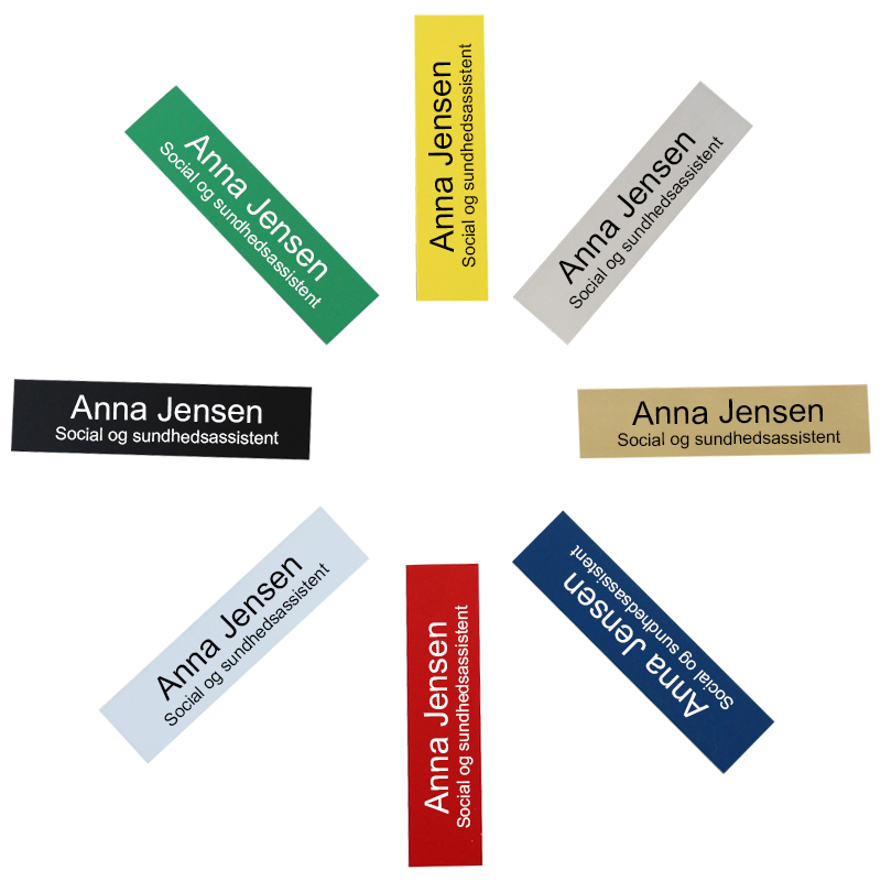 Navneskilt i firkantet design med magnet på bagsiden så du ikke stikker huller i tøjet.