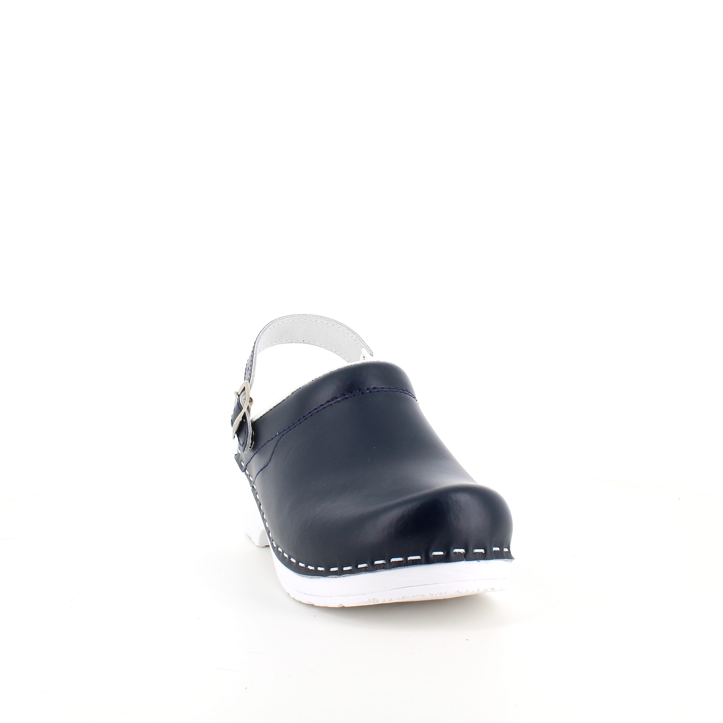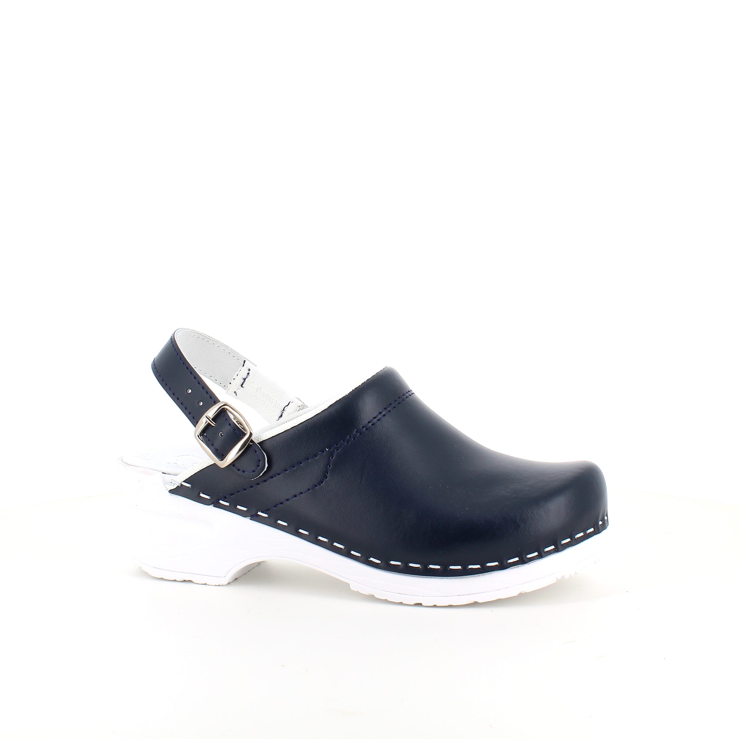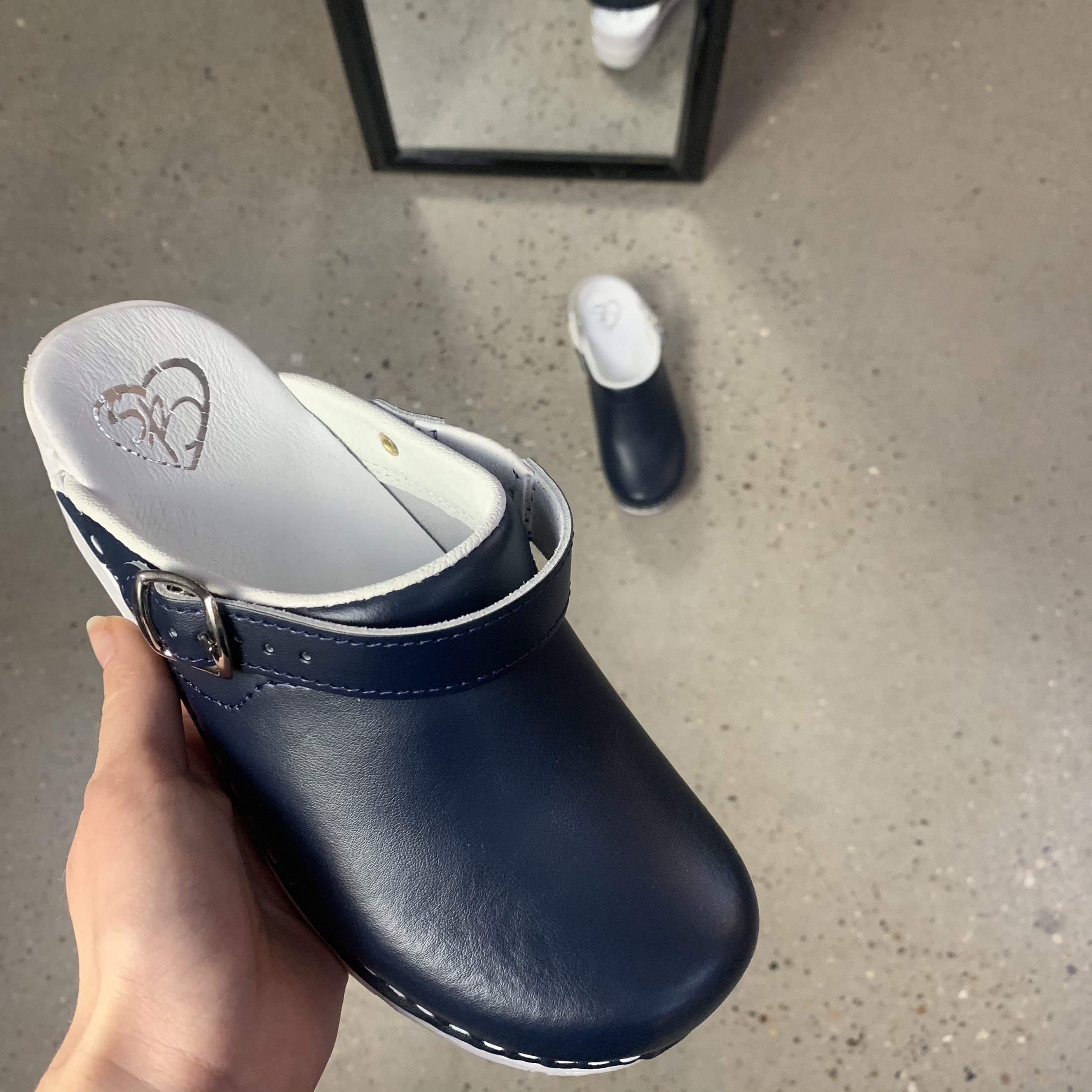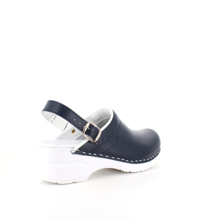 Skindtræsko i navy med bagrem. Så den kan bruges med eller uden rem.