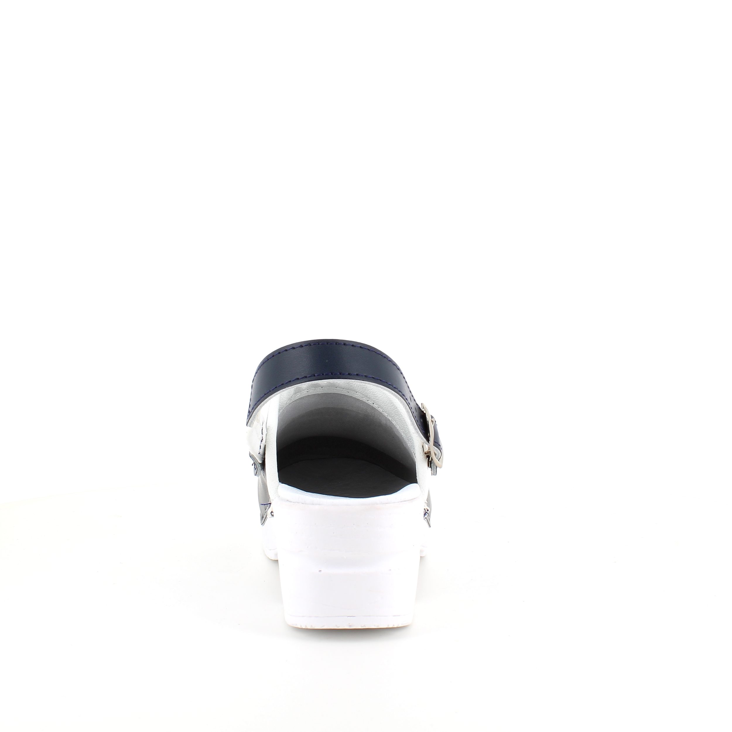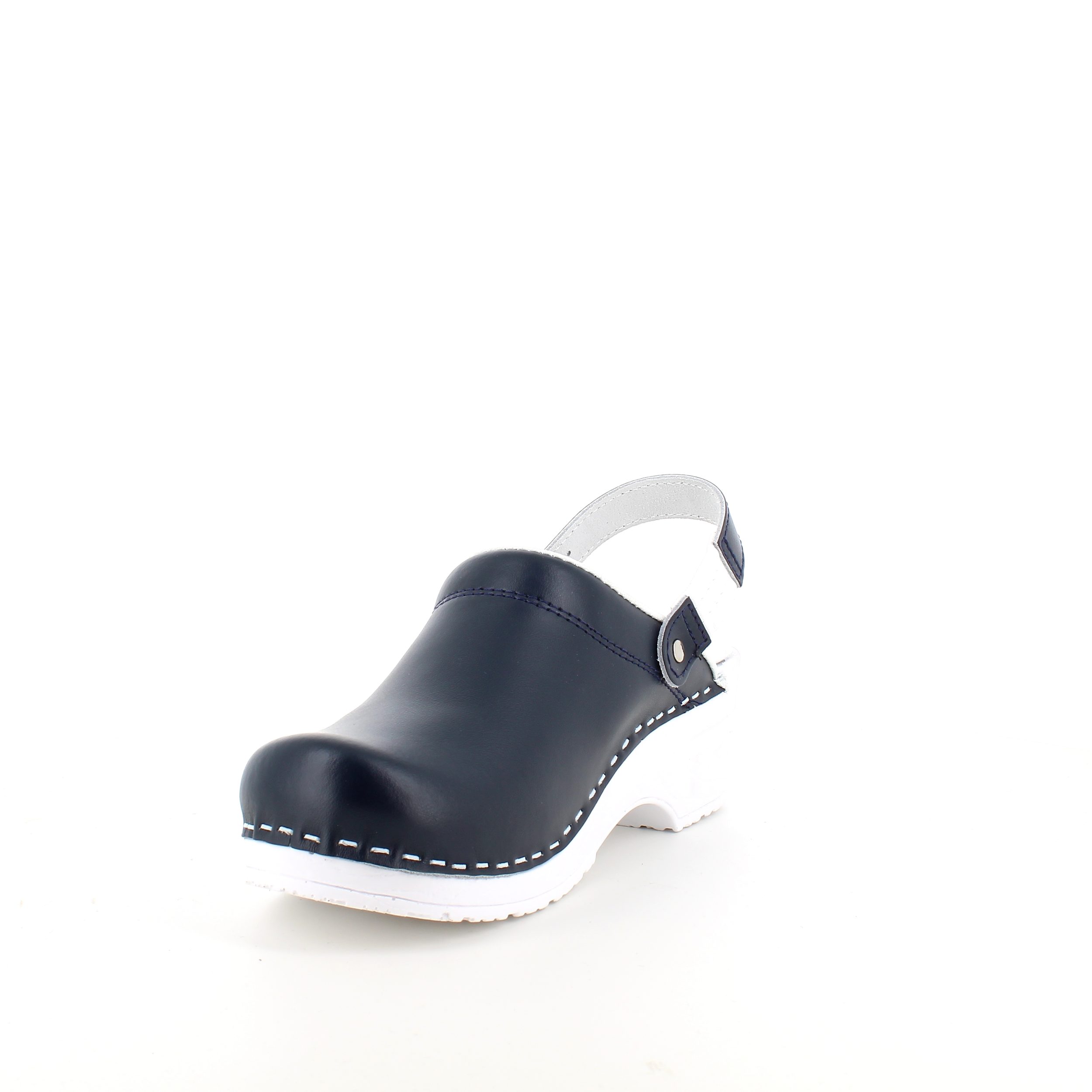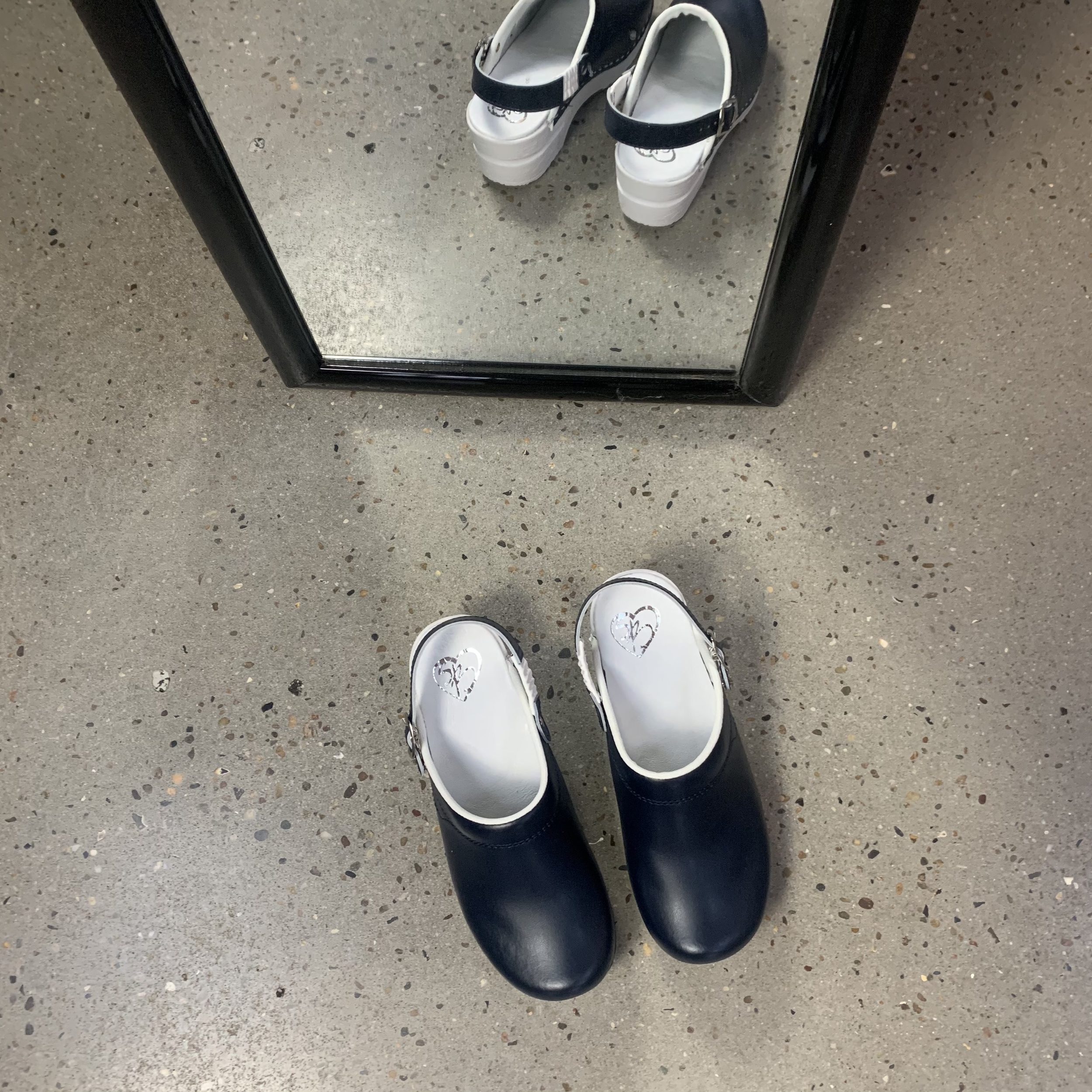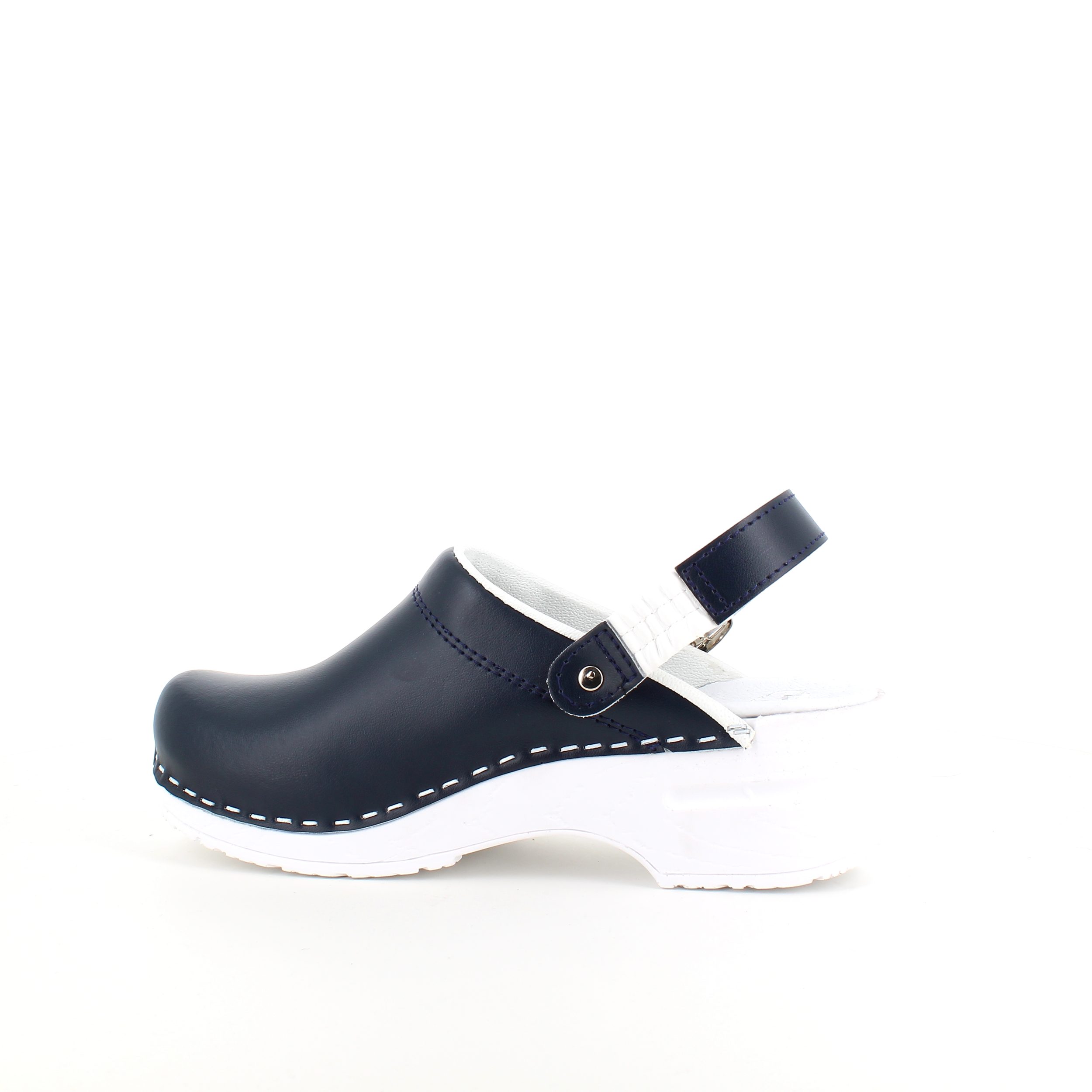 Skindtræsko i navy med bagrem. Så den kan bruges med eller uden rem.